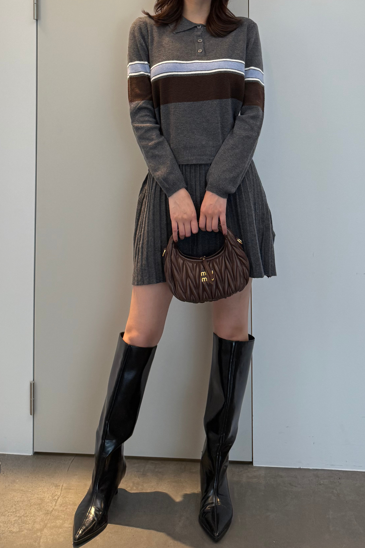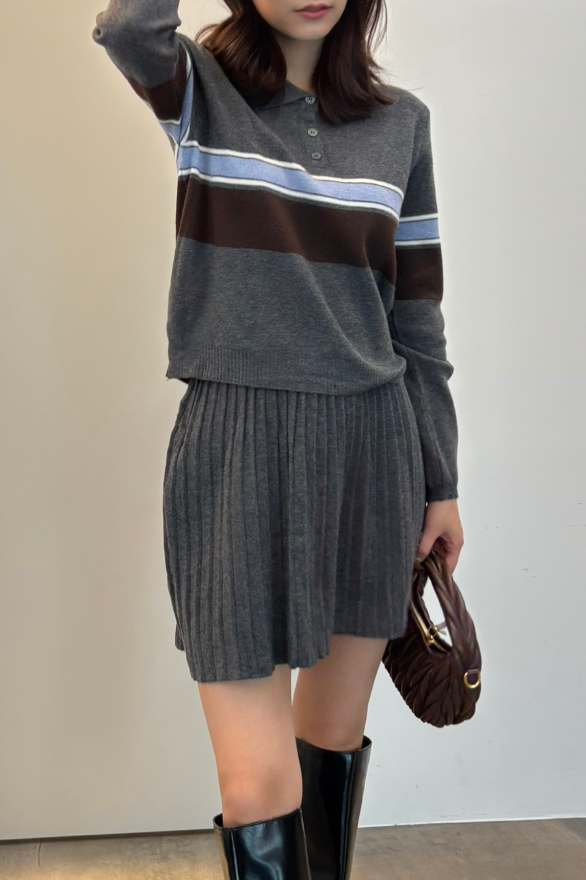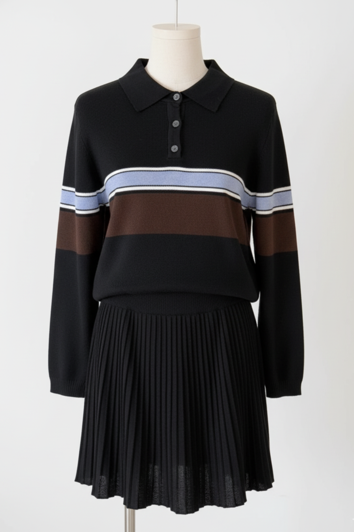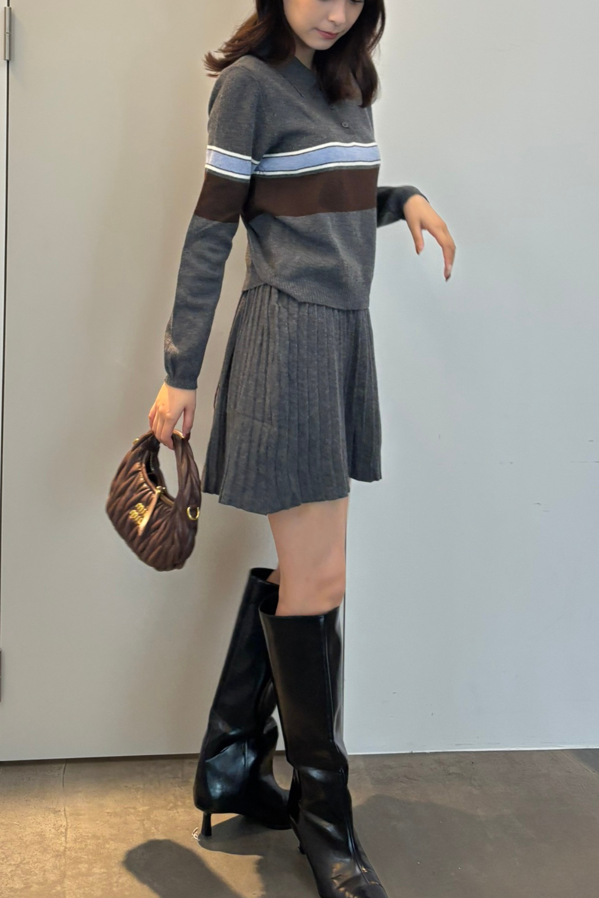 クラシックな配色ラインが目を惹く、ニットトップス×プリーツスカートのセットアップ。