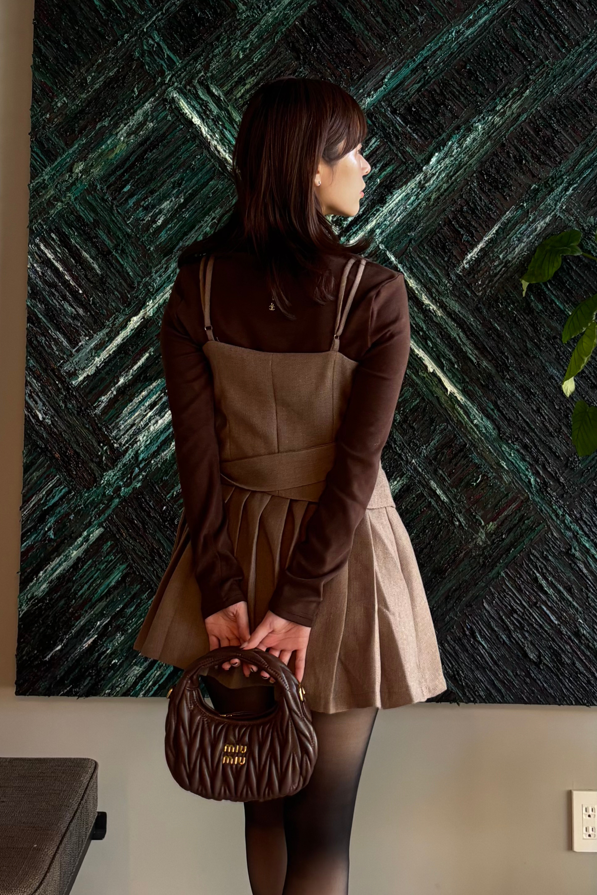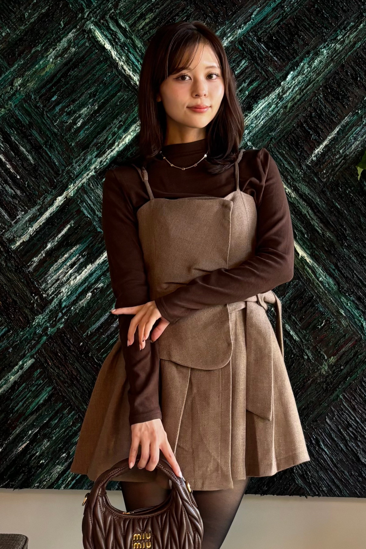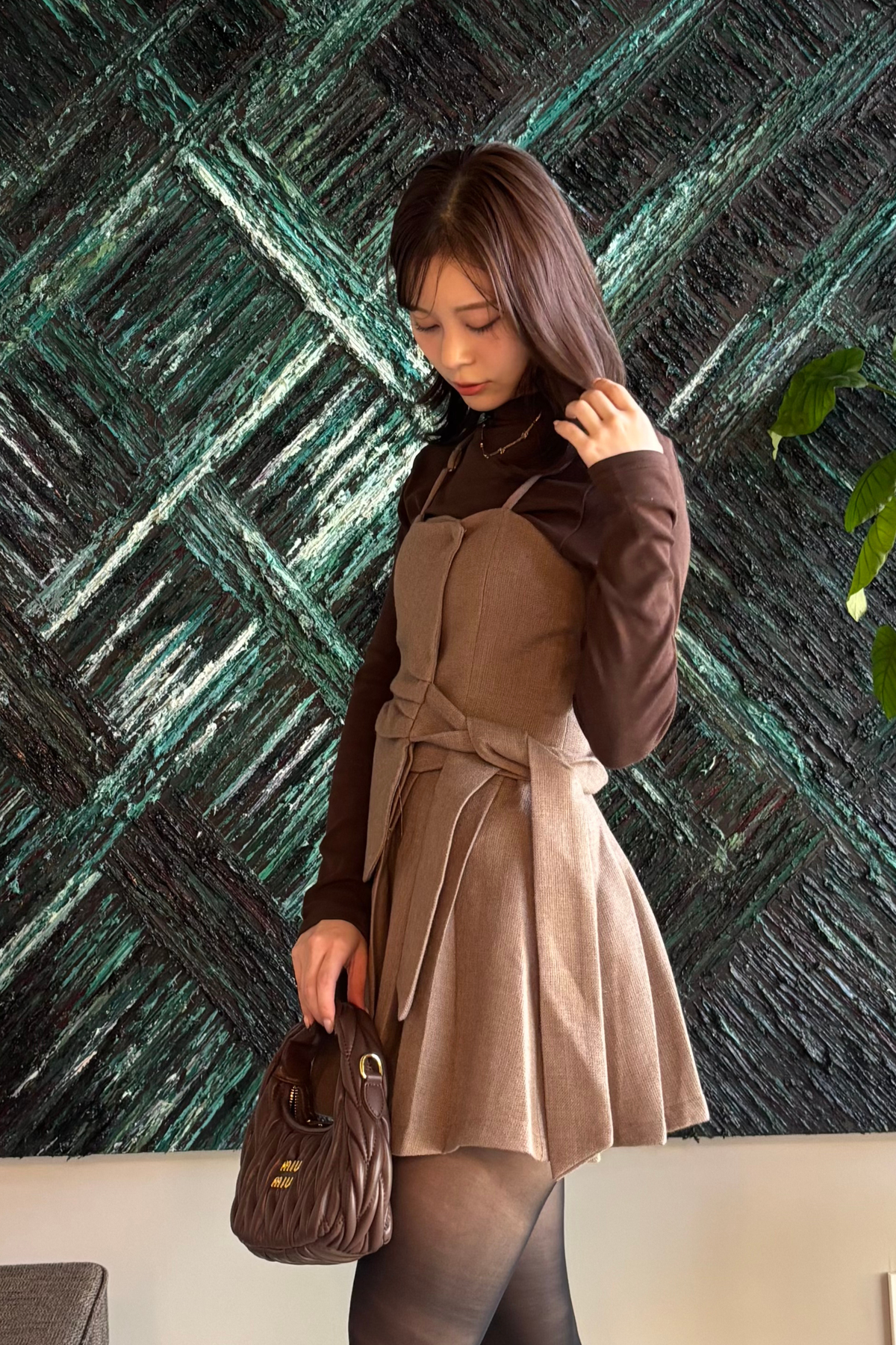 柔らかな印象を与えるこちらのアイテムは、タイトなシルエットと優雅なリボンディテールが特徴です。ストラップが施されたデザインが肩を美しく引き立て、ウエストのベルトが女性らしいラインを強調します。全体的には、クラシカルでありながらも現代的な華やかさを感じさせる一着です。裾のプリーツが動くたびに軽やかな表情を見せ、シンプルながらも存在感を放ちます。