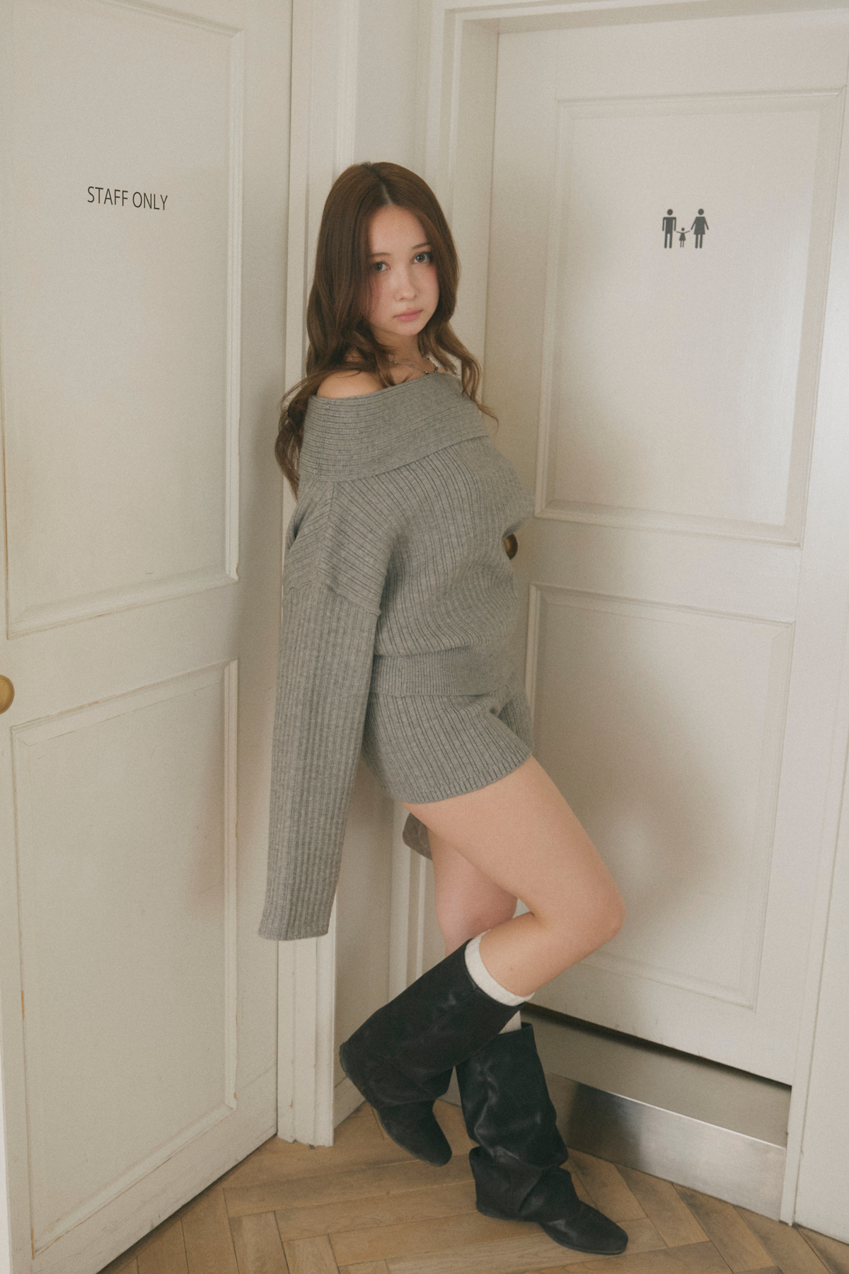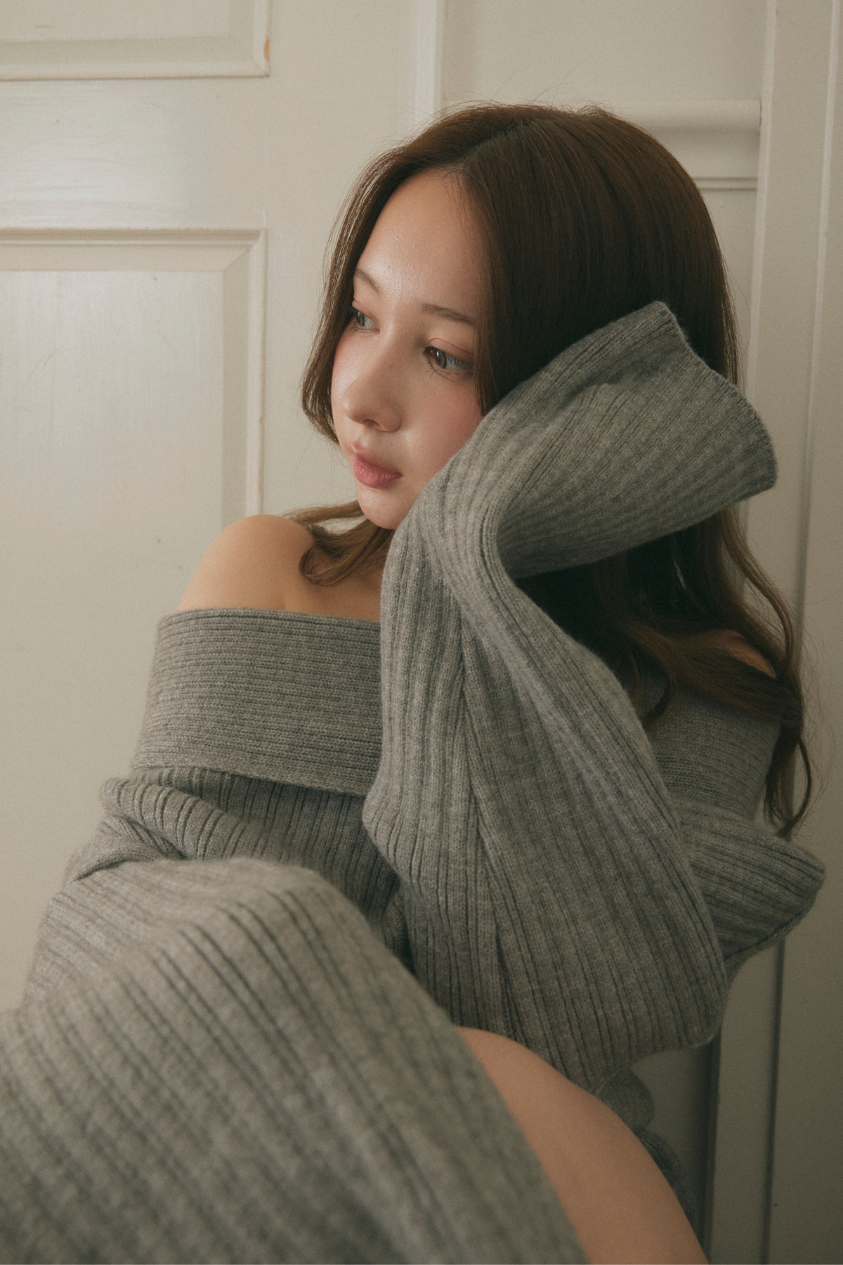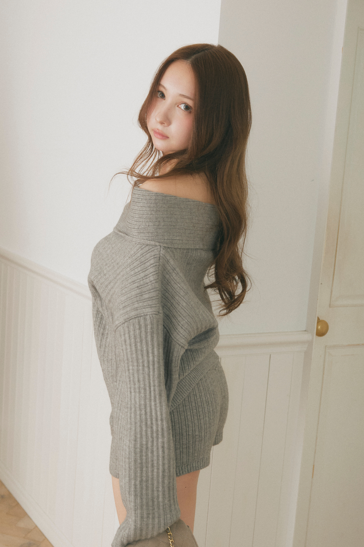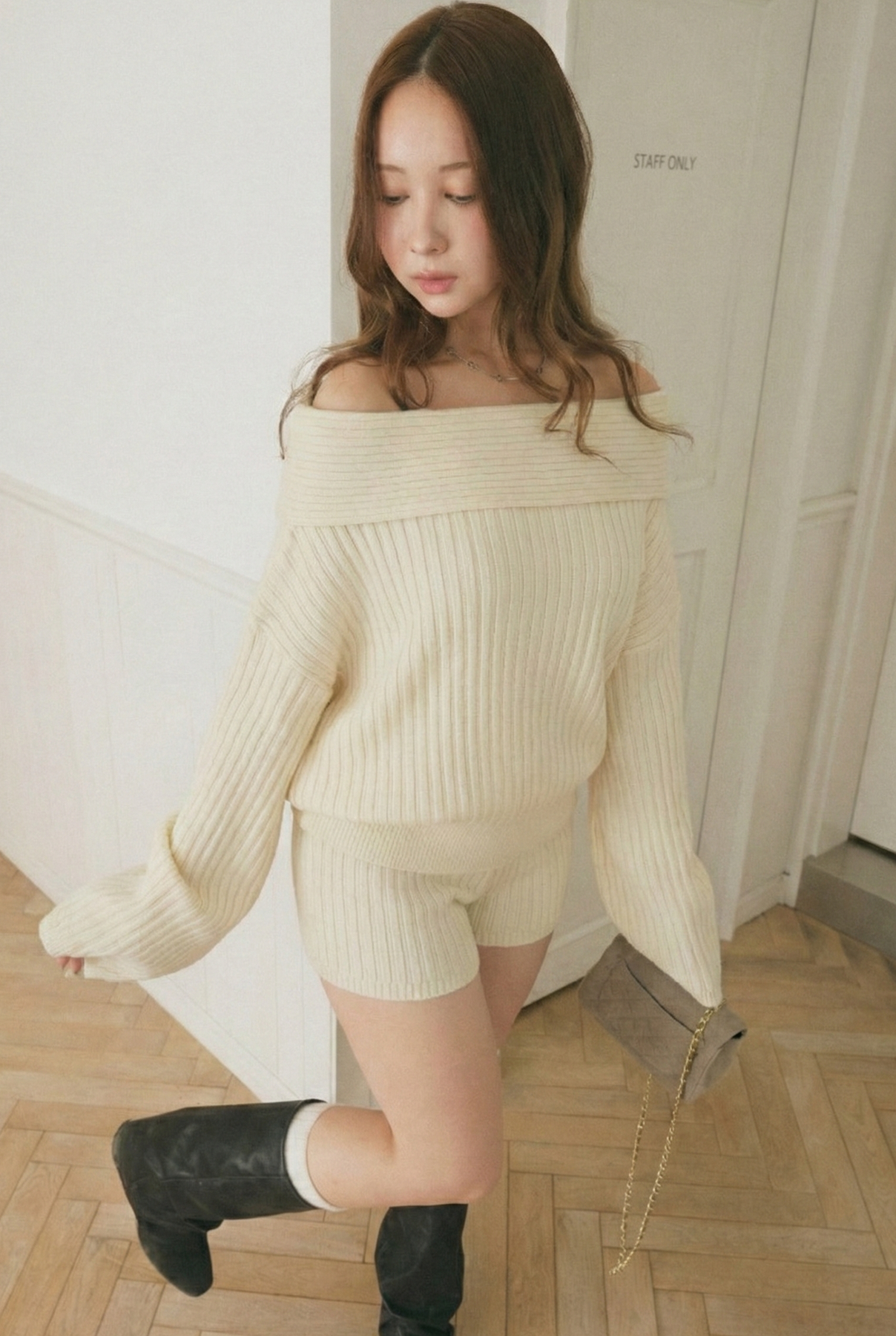 【デザイン】 柔らかな印象を与えるオフショルダーのデザインが特徴的です。リブ編みのテクスチャーが、シンプルながらも奥行きのある表情を演出しています。袖は少しボリュームを持たせ、動きのあるシルエットを実現。裾にかけて自然に落ち感があり、着る人の魅力を引き立てる一枚です。全体的に柔らかく、上品な雰囲気を醸し出しています。