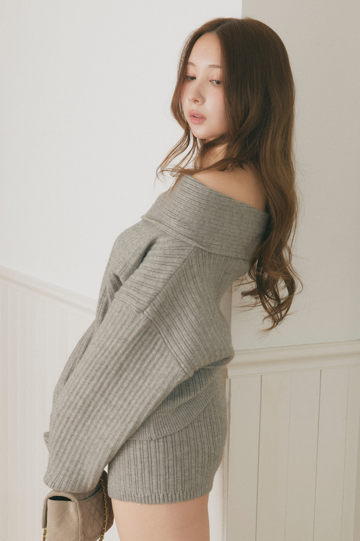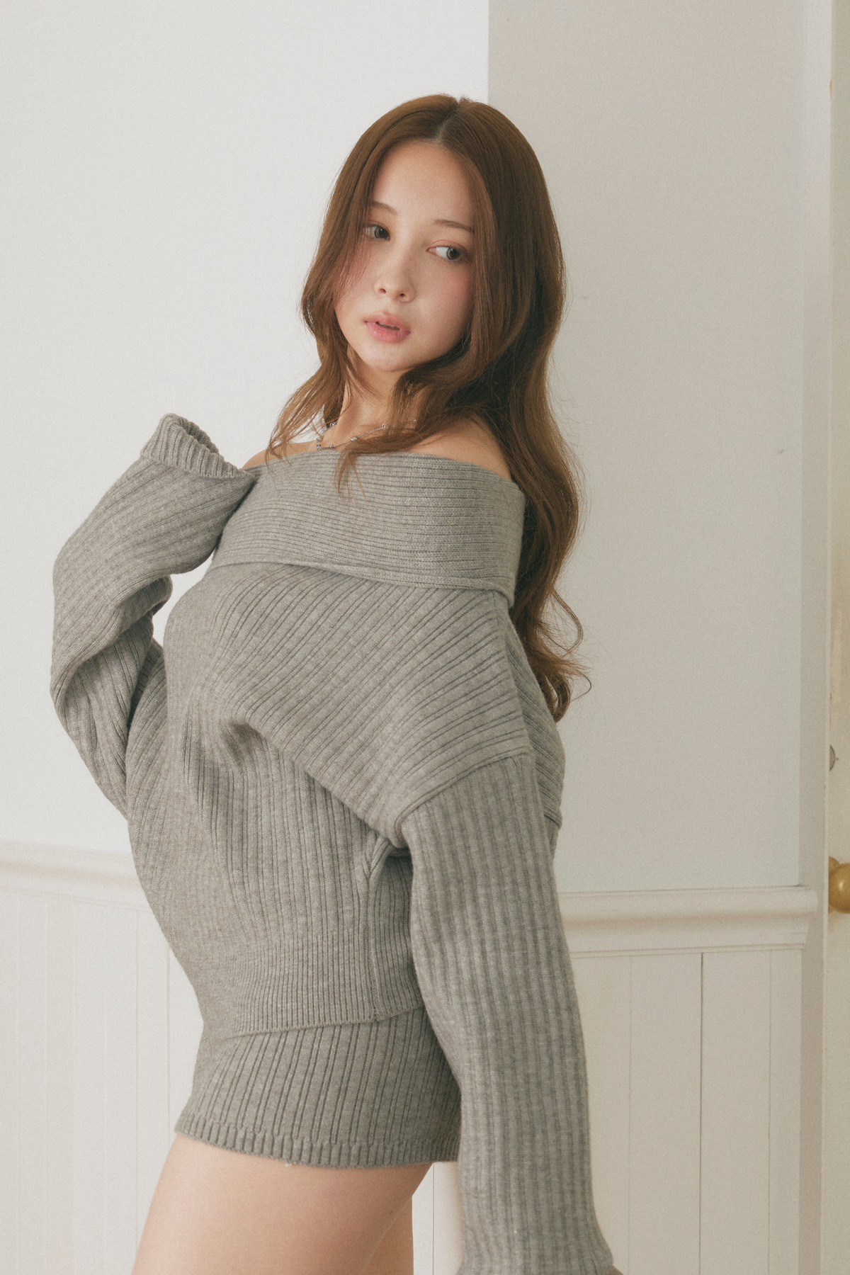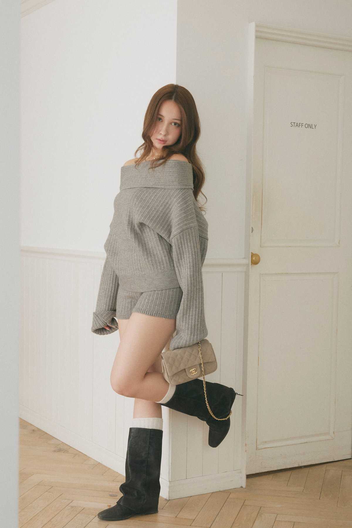 【デザイン】 柔らかな印象を与えるオフショルダーのデザインが特徴的です。リブ編みのテクスチャーが、シンプルながらも奥行きのある表情を演出しています。袖は少しボリュームを持たせ、動きのあるシルエットを実現。裾にかけて自然に落ち感があり、着る人の魅力を引き立てる一枚です。全体的に柔らかく、上品な雰囲気を醸し出しています。