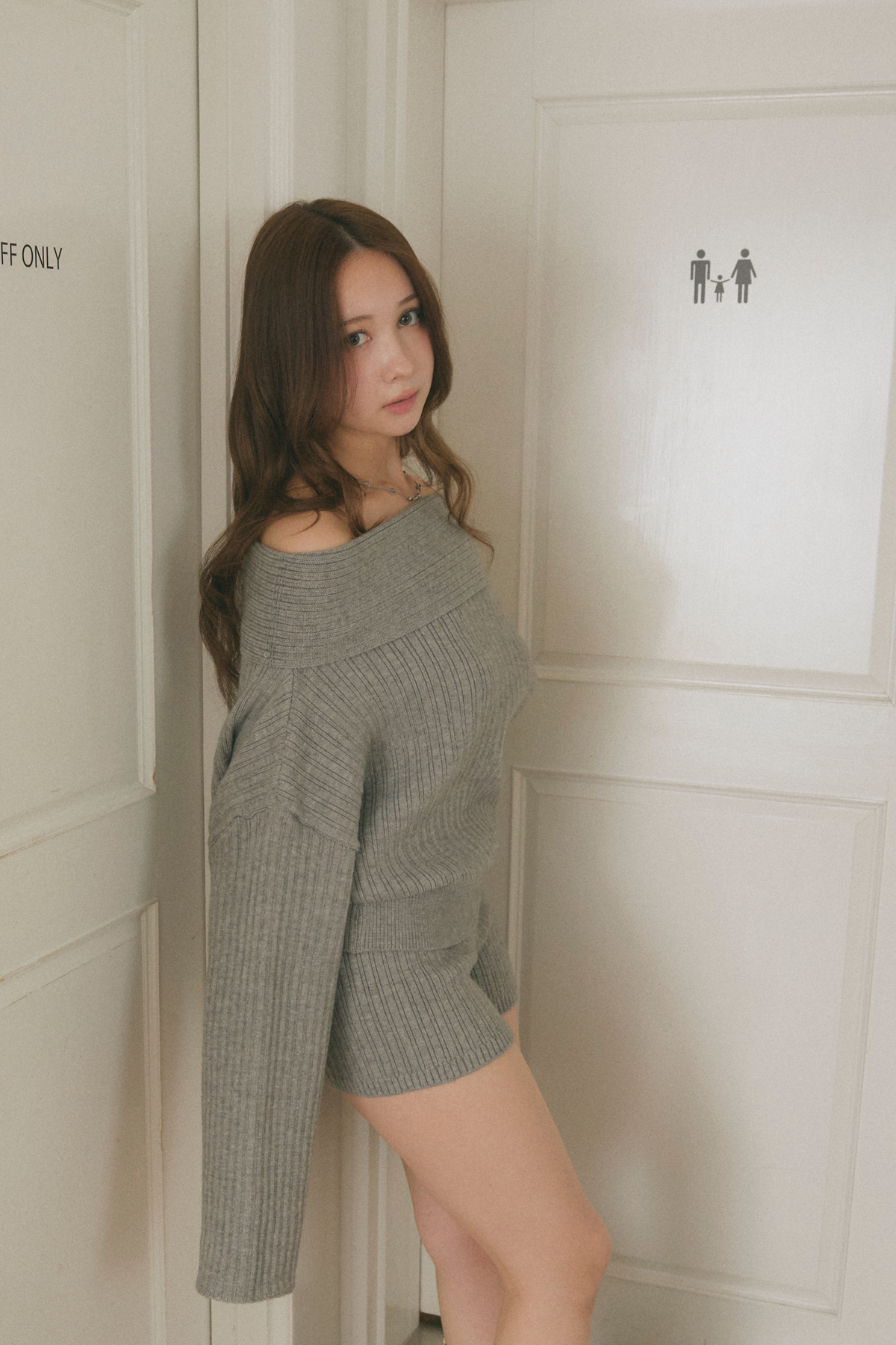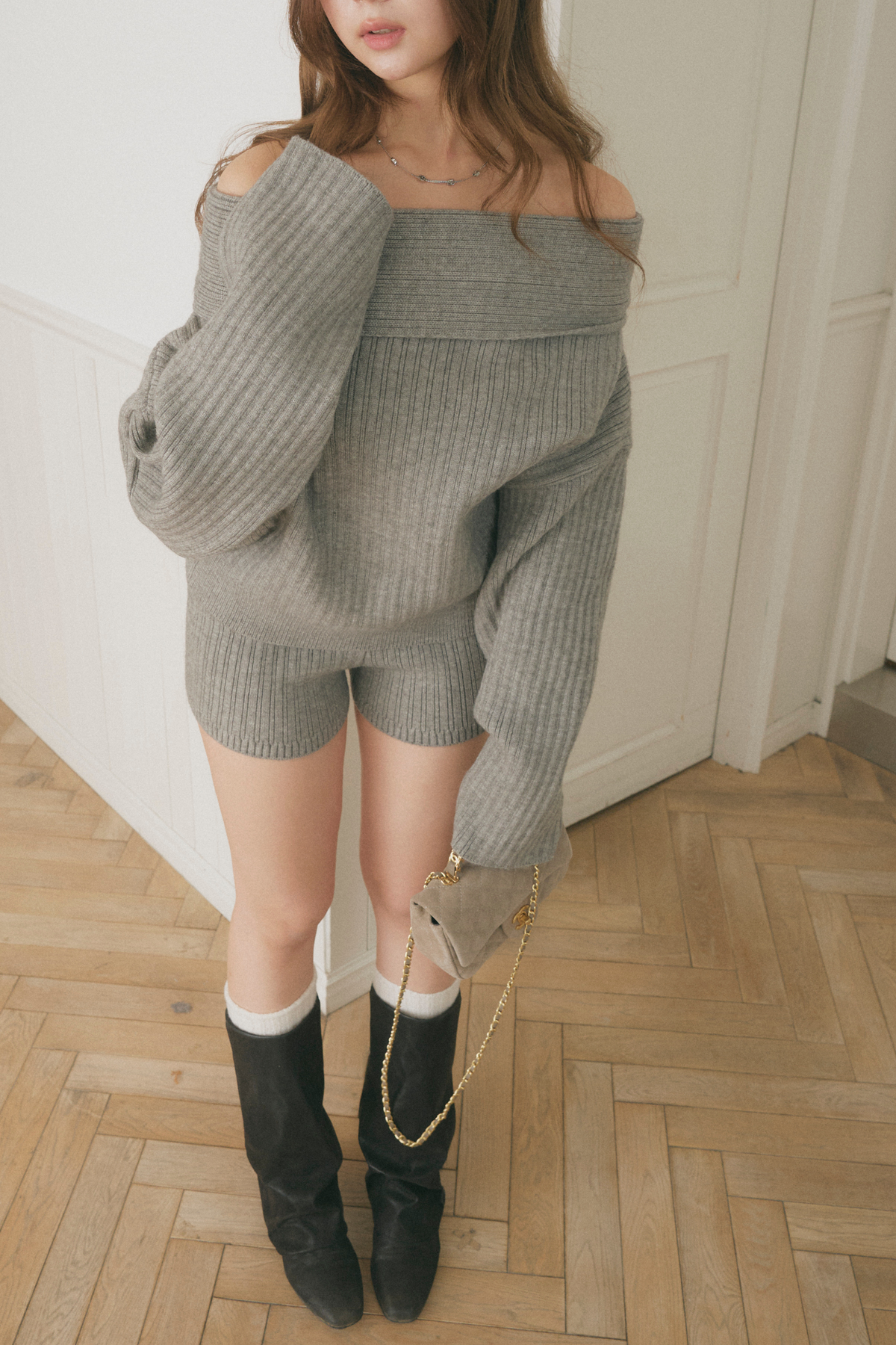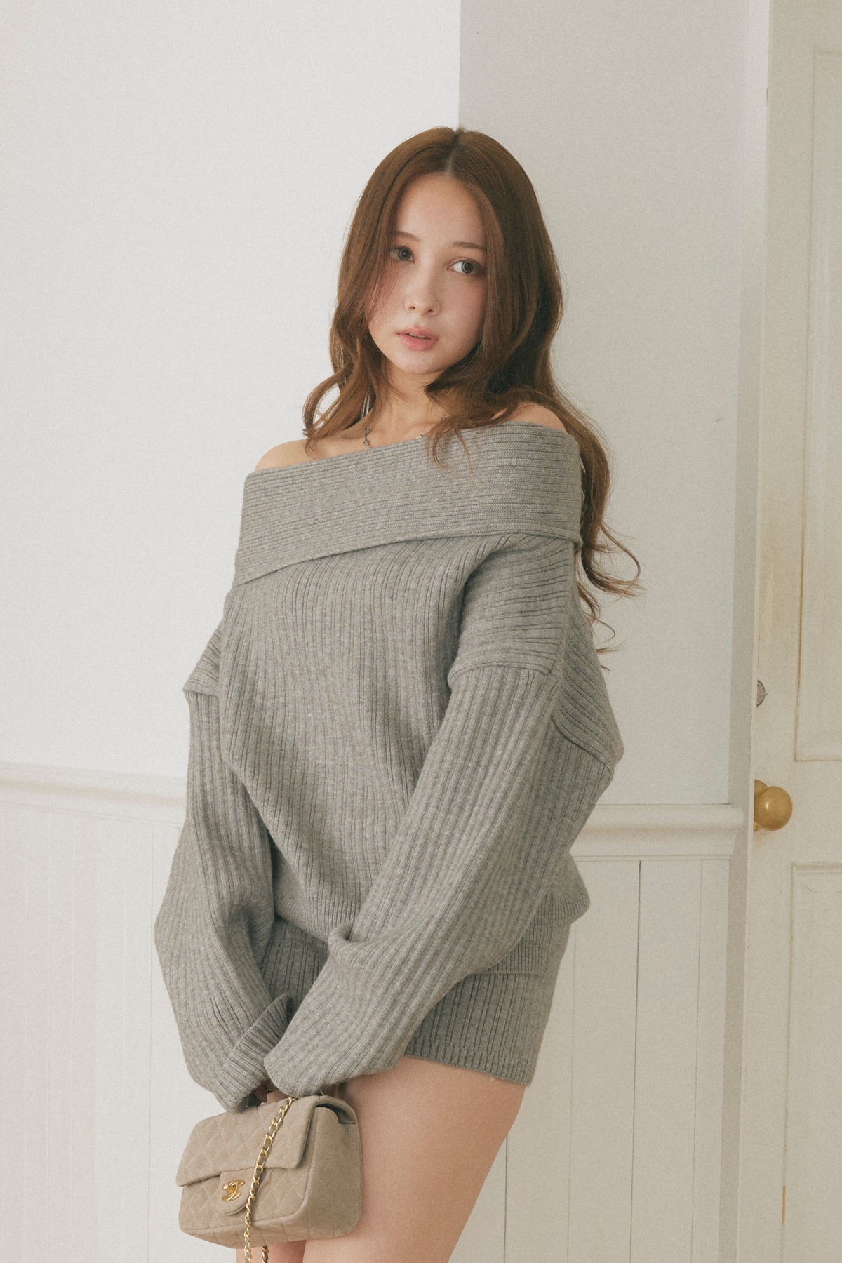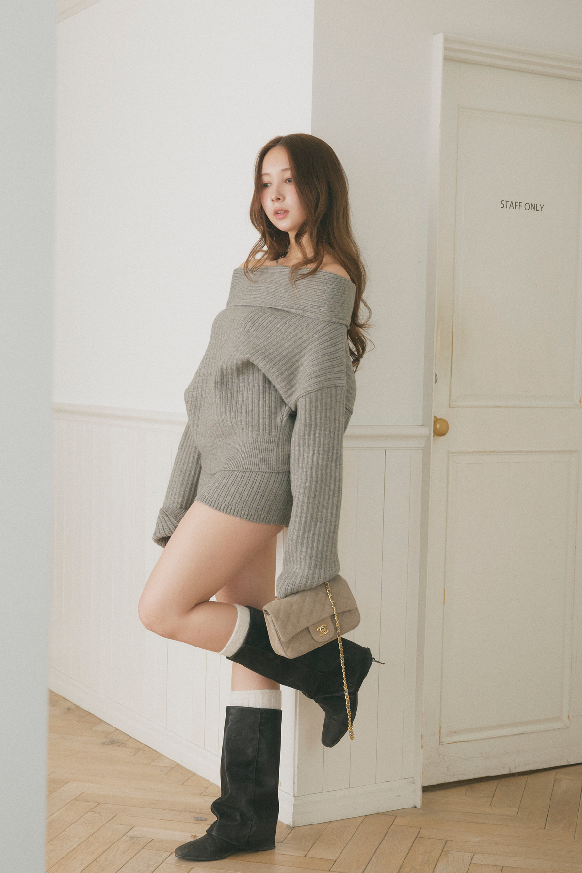【デザイン】 柔らかな印象を与えるオフショルダーのデザインが特徴的です。リブ編みのテクスチャーが、シンプルながらも奥行きのある表情を演出しています。袖は少しボリュームを持たせ、動きのあるシルエットを実現。裾にかけて自然に落ち感があり、着る人の魅力を引き立てる一枚です。全体的に柔らかく、上品な雰囲気を醸し出しています。