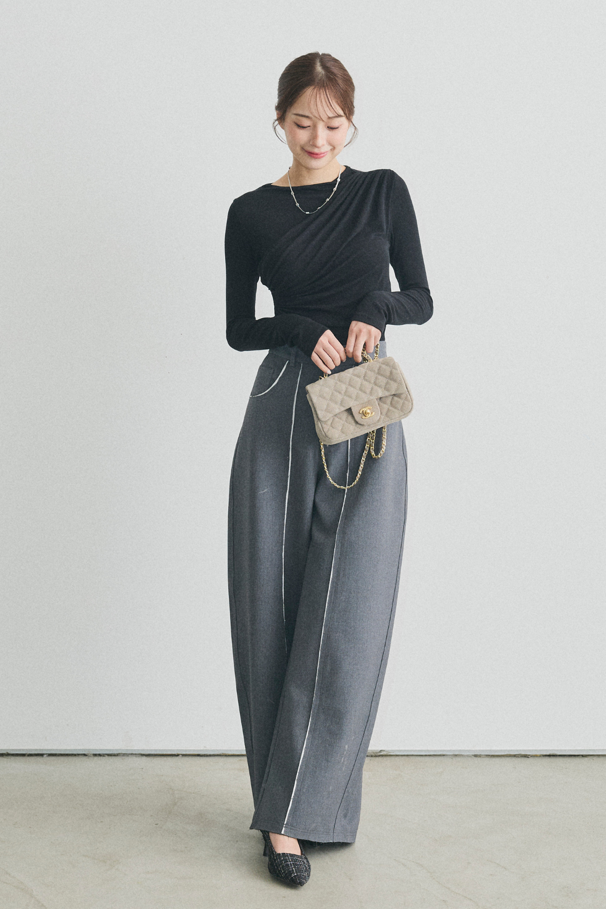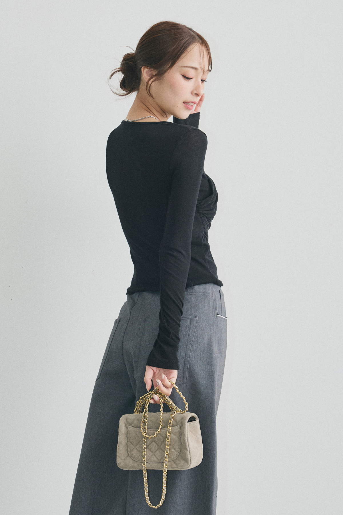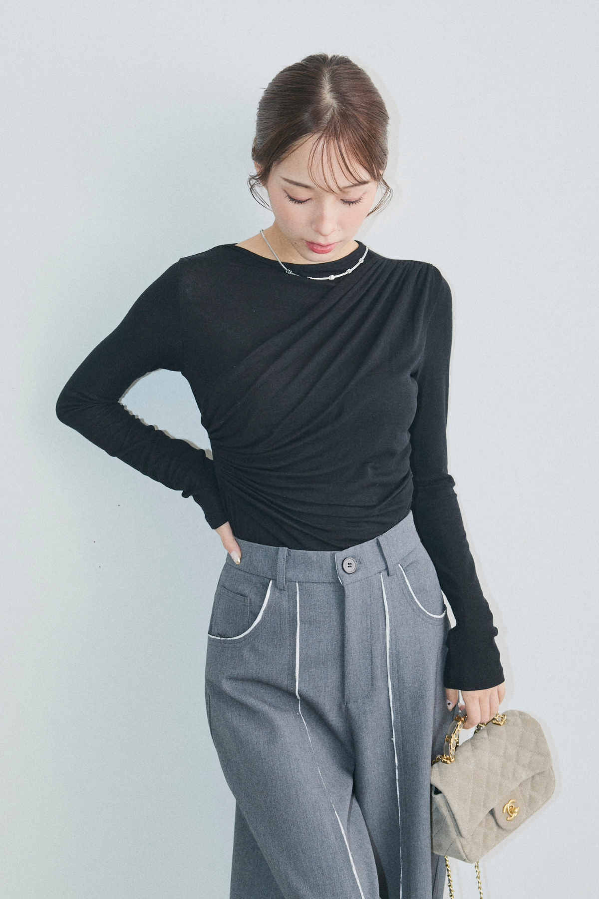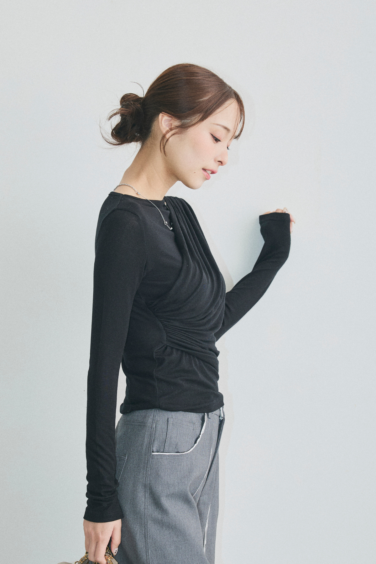 【デザイン】 柔らかなドレープが特徴的な一着は、洗練された印象を与えます。タイトなシルエットに加え、袖口のさりげないディテールが全体を引き締め、エレガントな雰囲気を醸し出します。背面のプリーツが動きに合わせて流れるように揺れ、シンプルながらも存在感のあるデザインに仕上がっています。日常使いはもちろん、特別なシーンにもぴったりな一枚です。