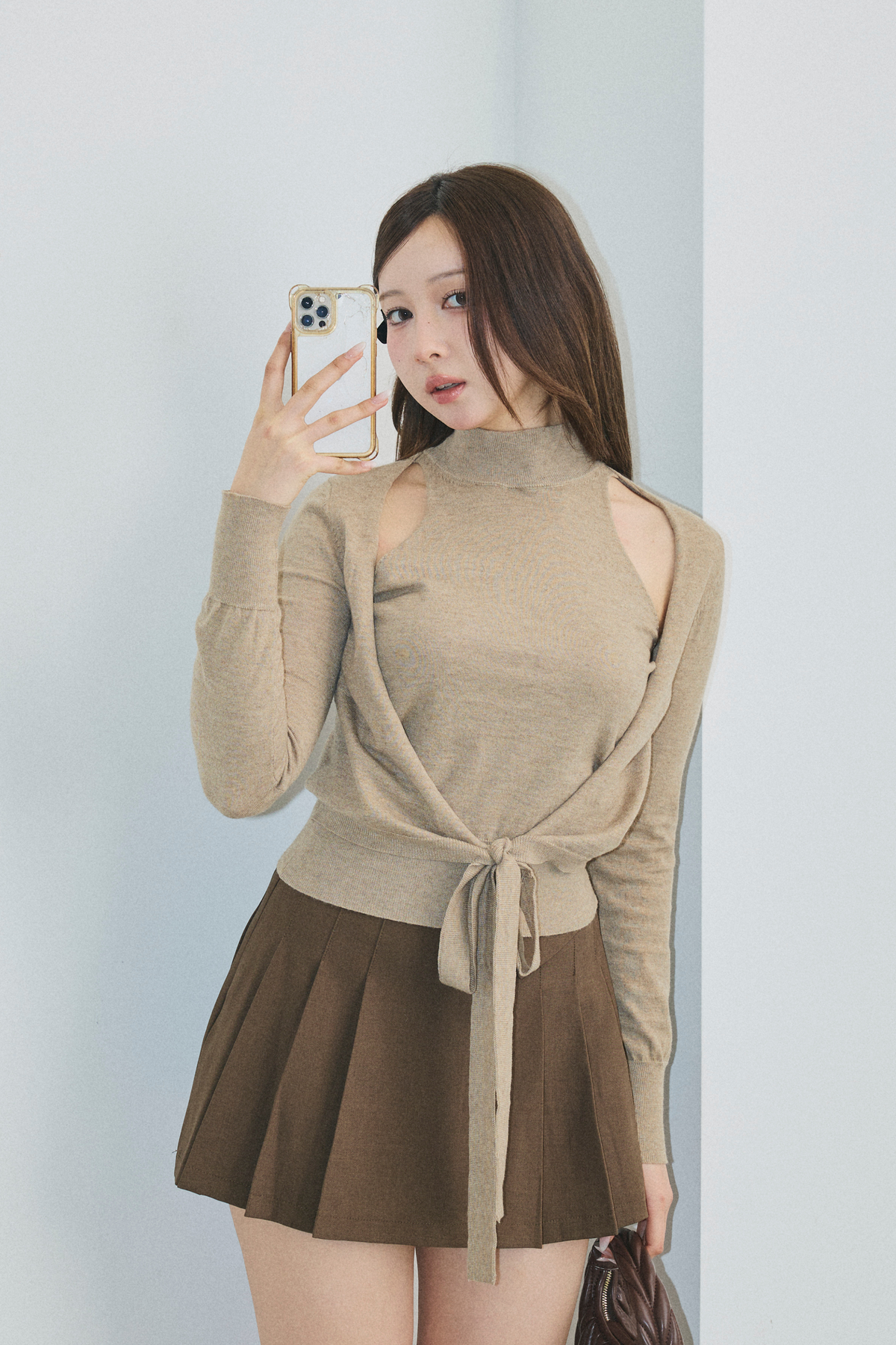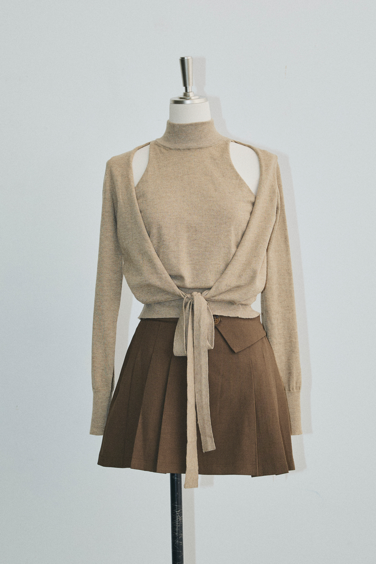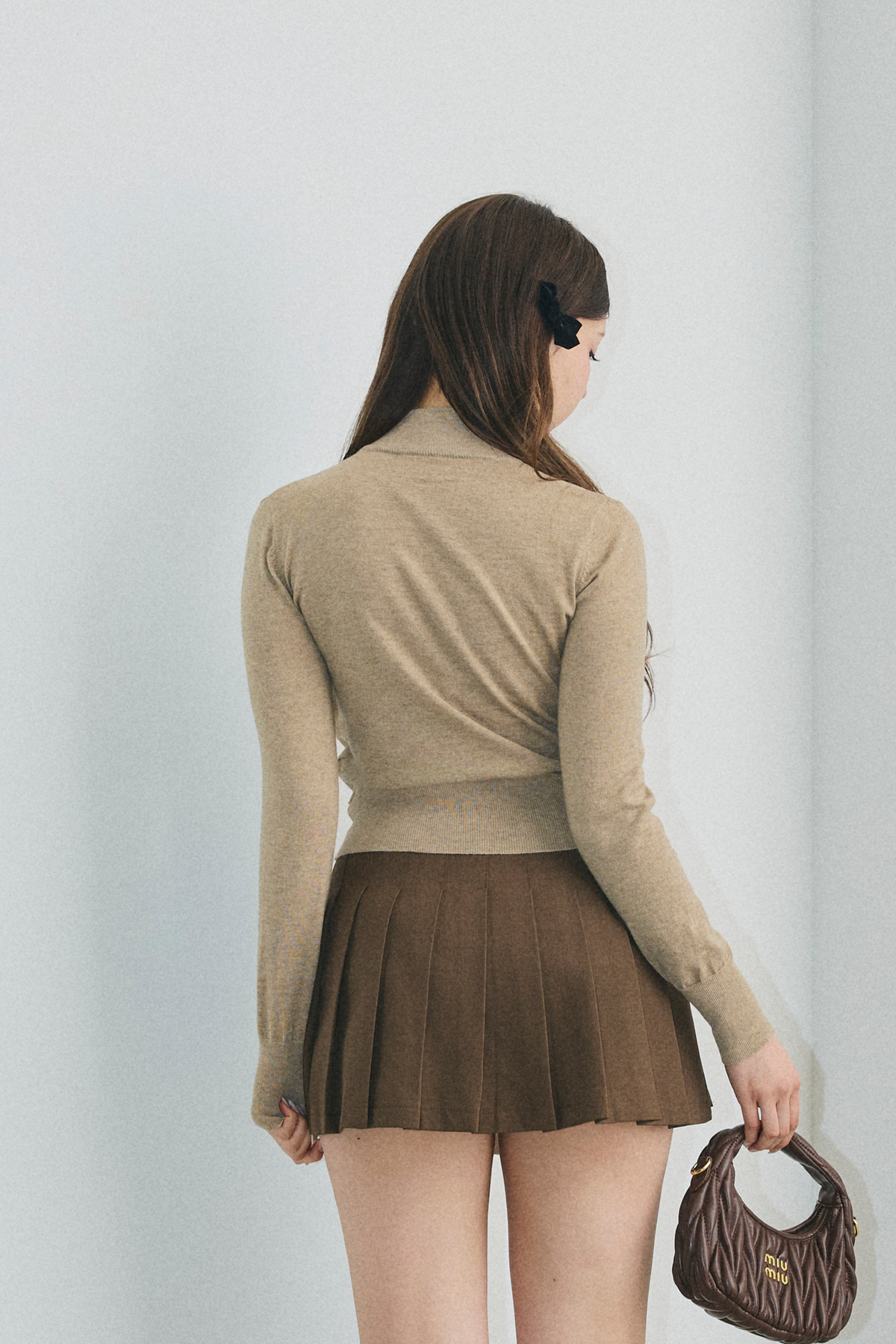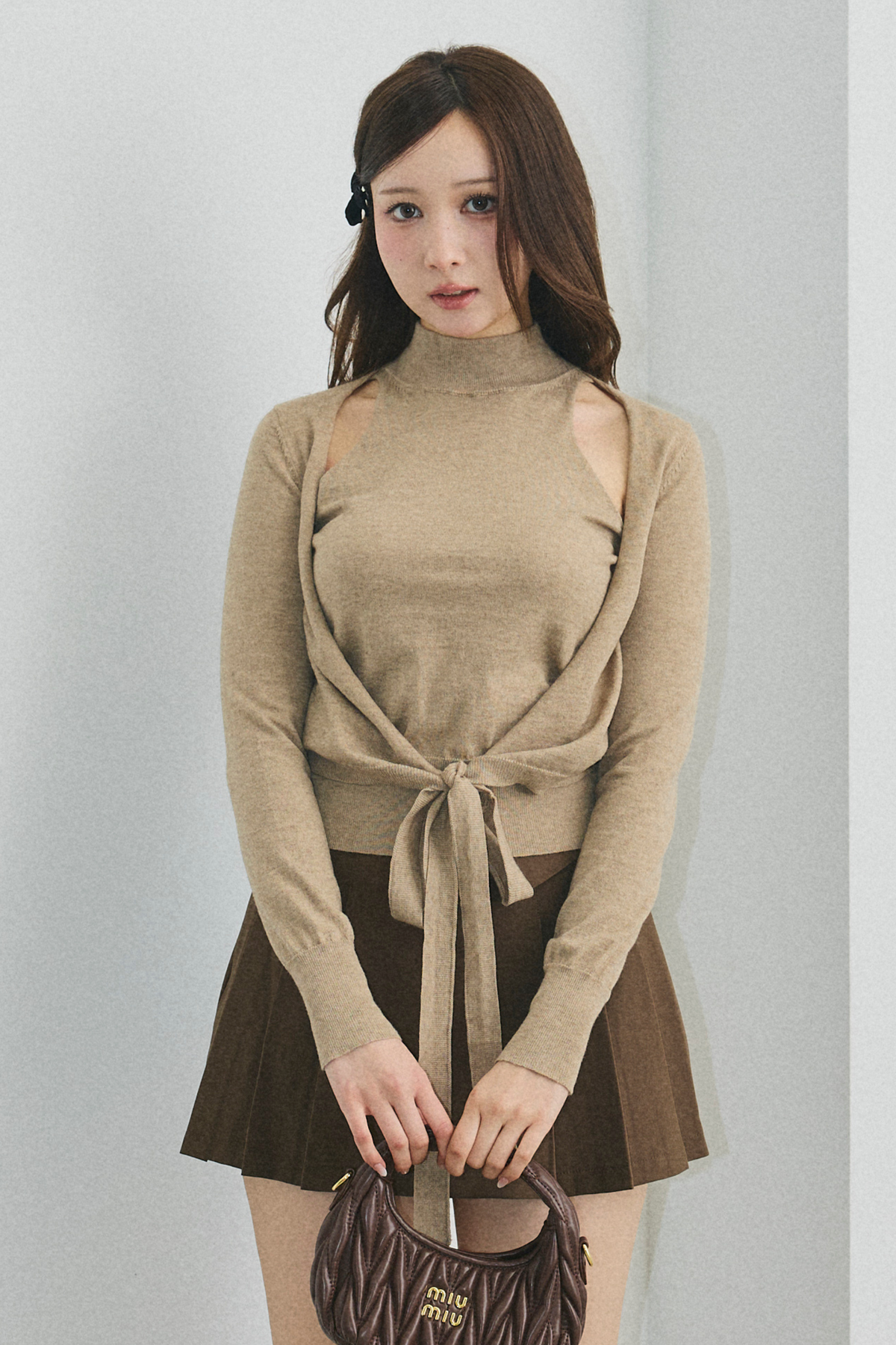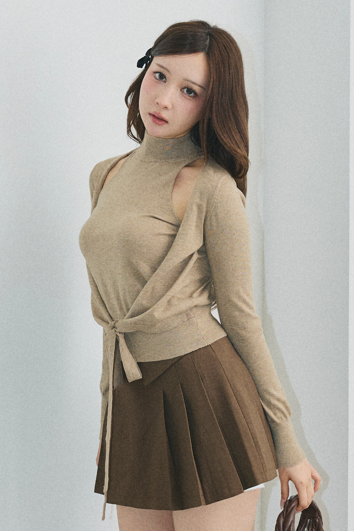 【デザイン】 柔らかな印象を与えるデザインが特徴的です。タイトすぎないシルエットが、優雅さを引き立てつつ、動きやすさも兼ね備えています。高めの襟元が顔周りをすっきりと見せ、袖口にはさりげないリボンディテールが施されています。全体的には、柔らかい雰囲気を醸し出し、カジュアルながらも洗練された印象を与える一着です。