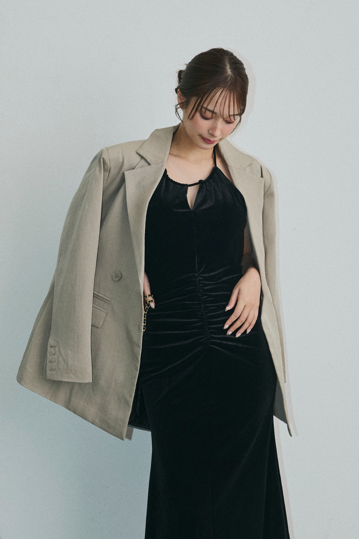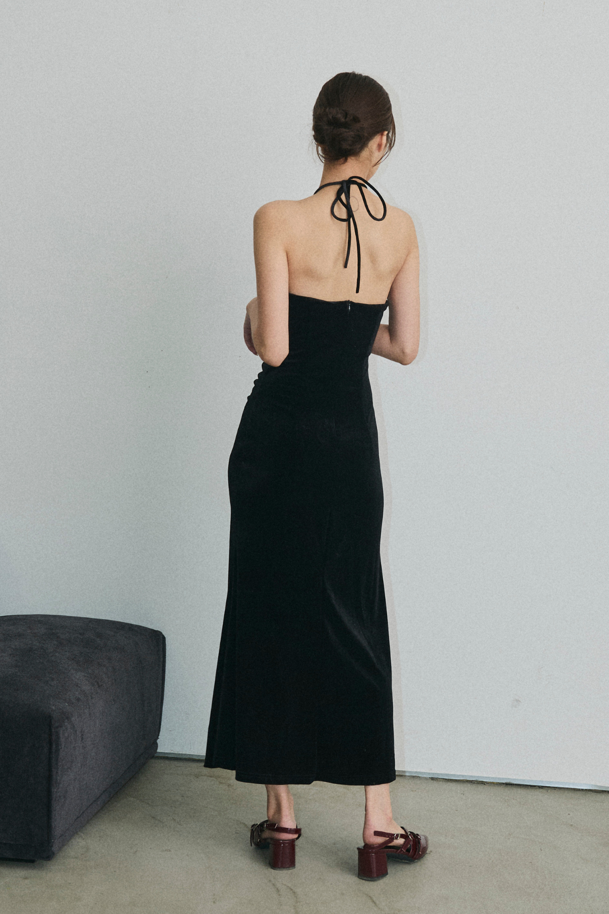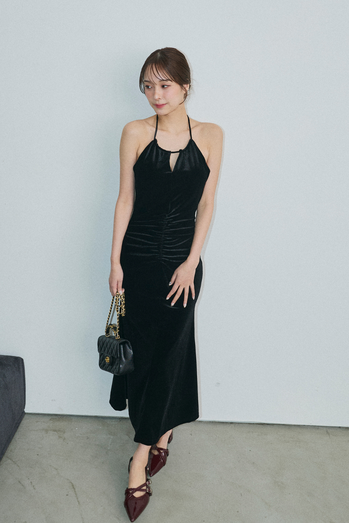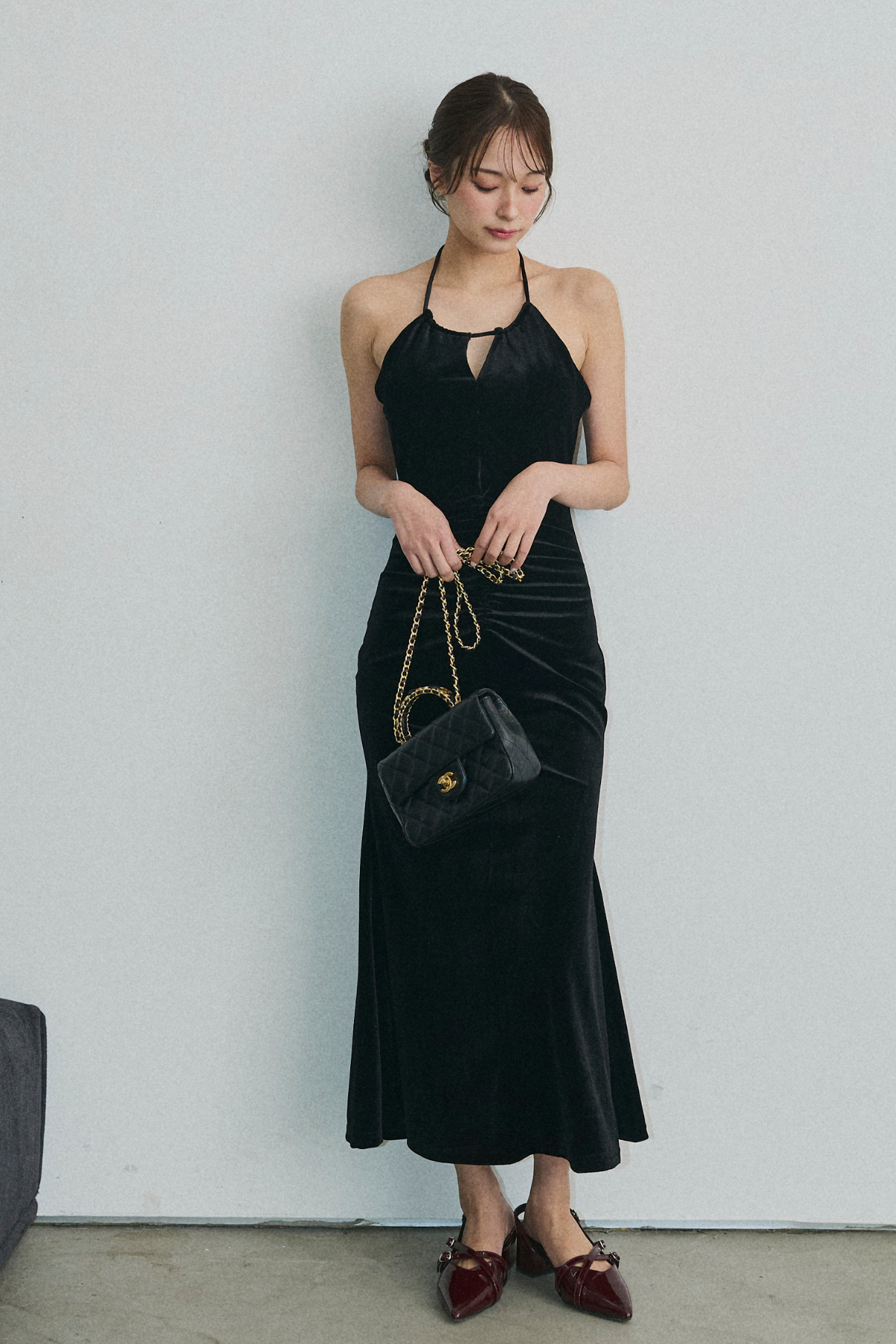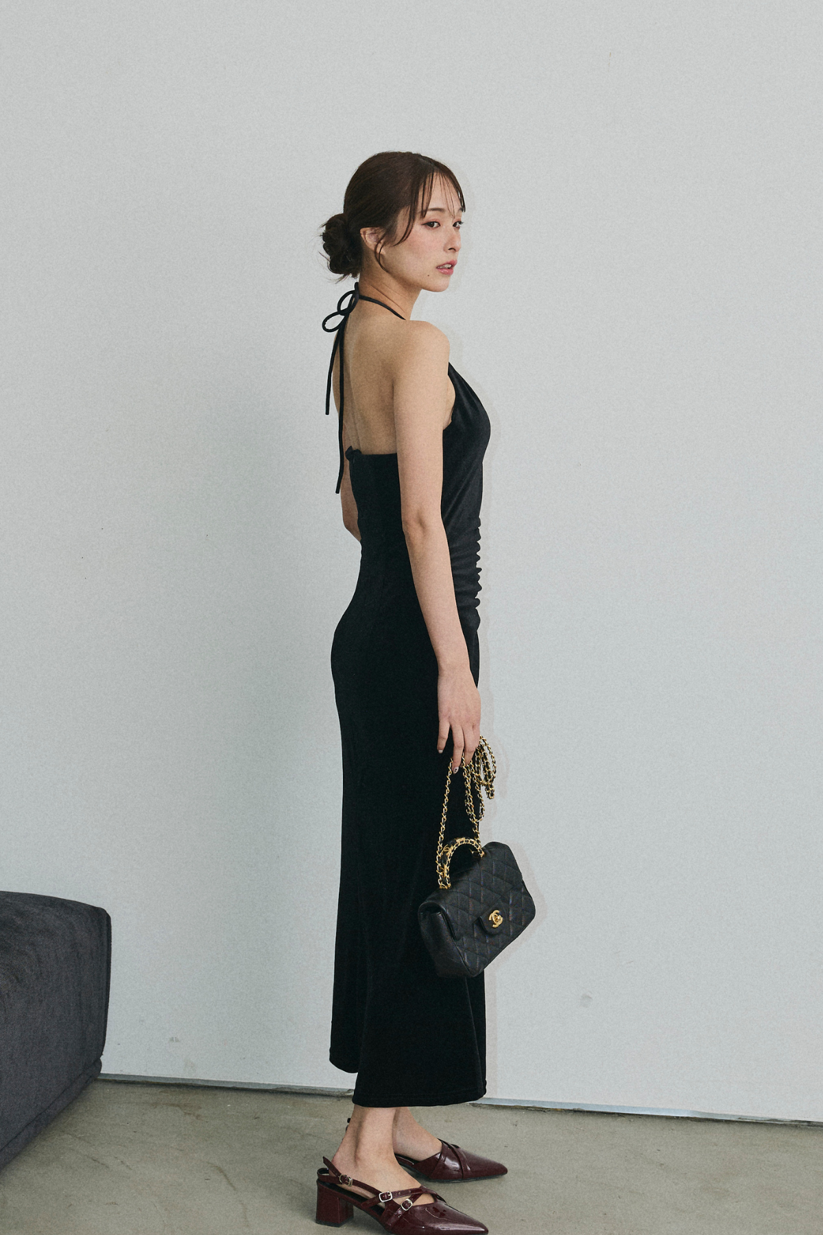 【デザイン】 洗練されたシルエットが魅力の一着。タイトなラインが女性らしさを引き立て、柔らかなドレープが優雅な印象を与えます。深めのVネックとストラップのデザインが、首元を美しく演出し、全体にクラシカルな雰囲気を醸し出しています。裾にかけて広がる柔らかなラインが、歩くたびにエレガントな動きを生み出します。