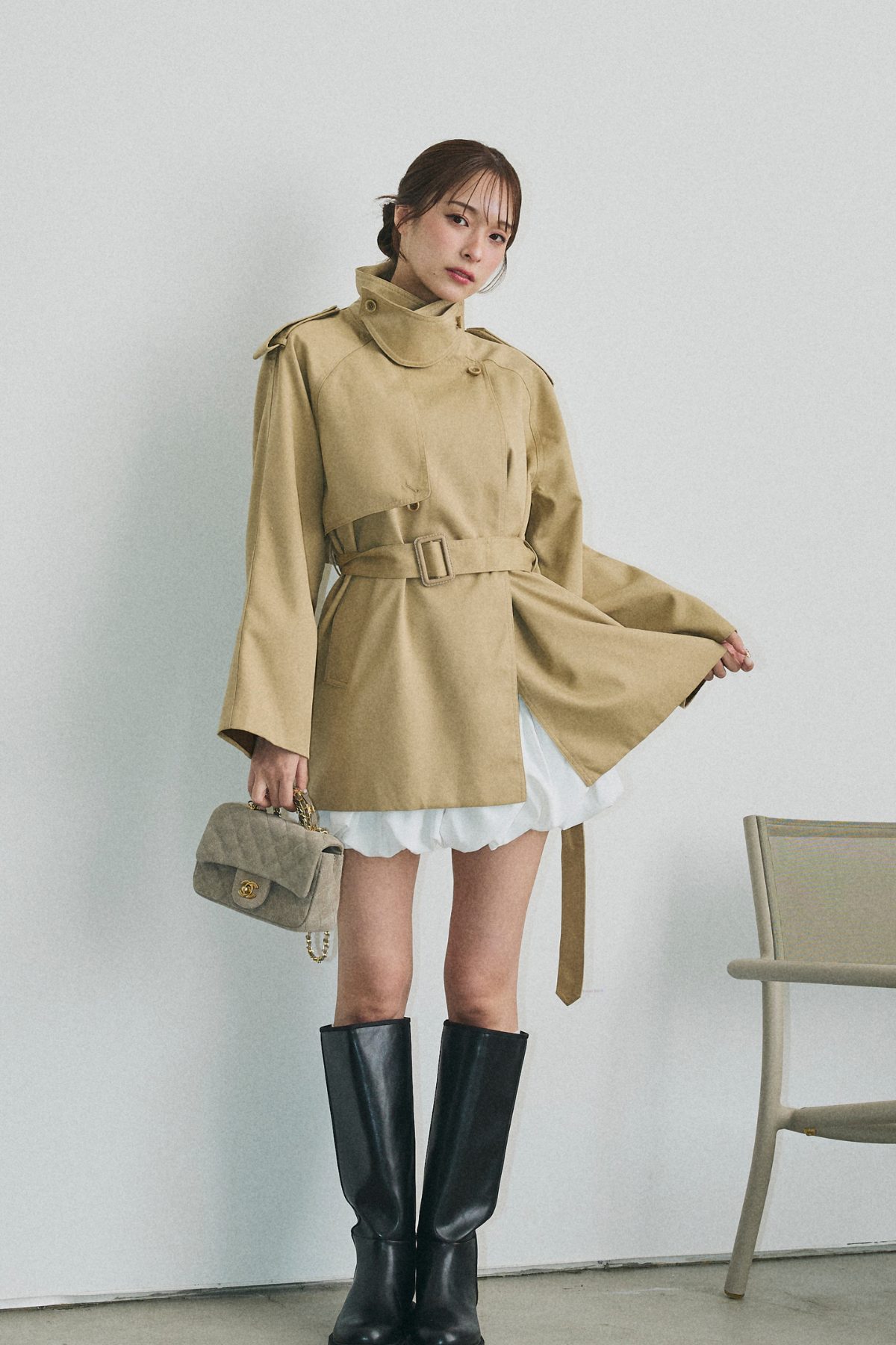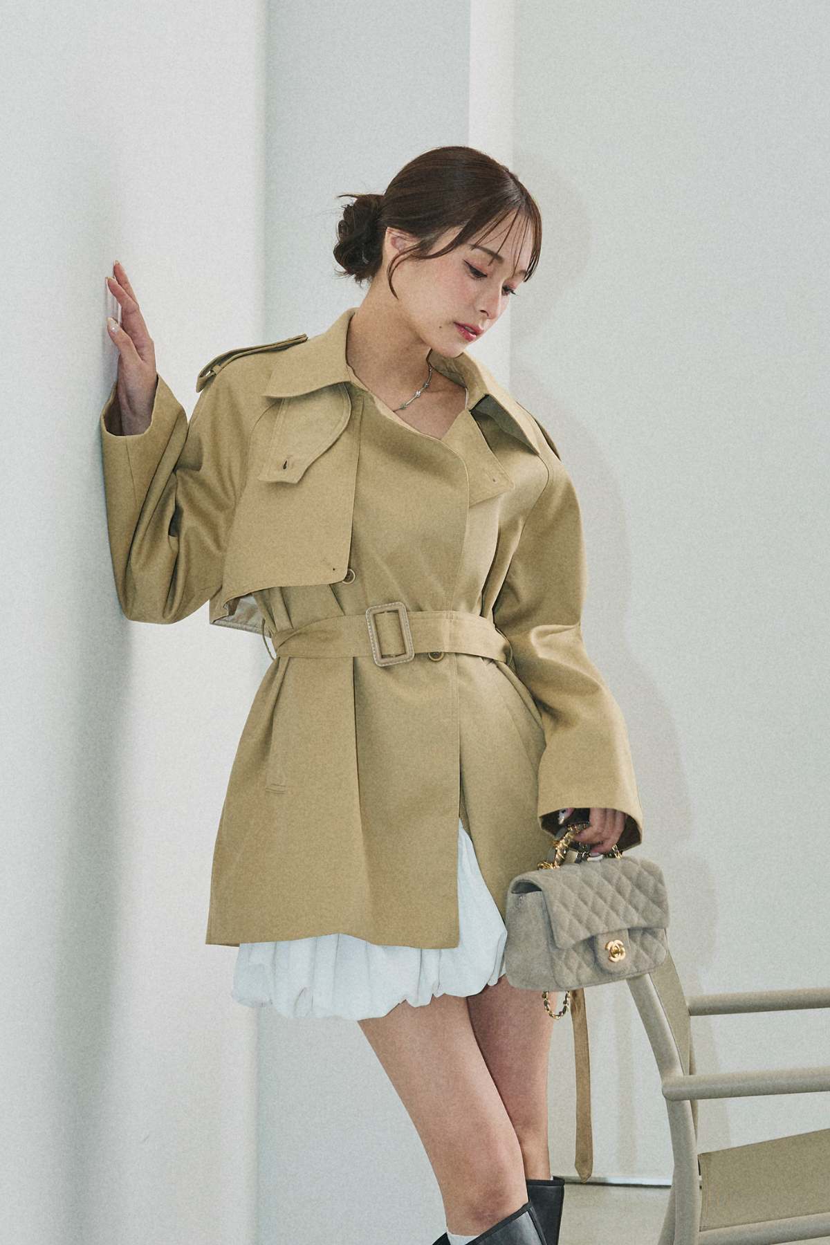 【デザイン】 柔らかな表情を持つこのトレンチコートは、ウエストを引き締めるベルトが特徴的です。落ち感のあるシルエットは、動くたびに優雅な印象を与え、袖口の異素材使いがアクセントとなっています。襟元は洗練されたデザインで、全体に端正な雰囲気を醸し出し、どんなシーンにもマッチする一着です。