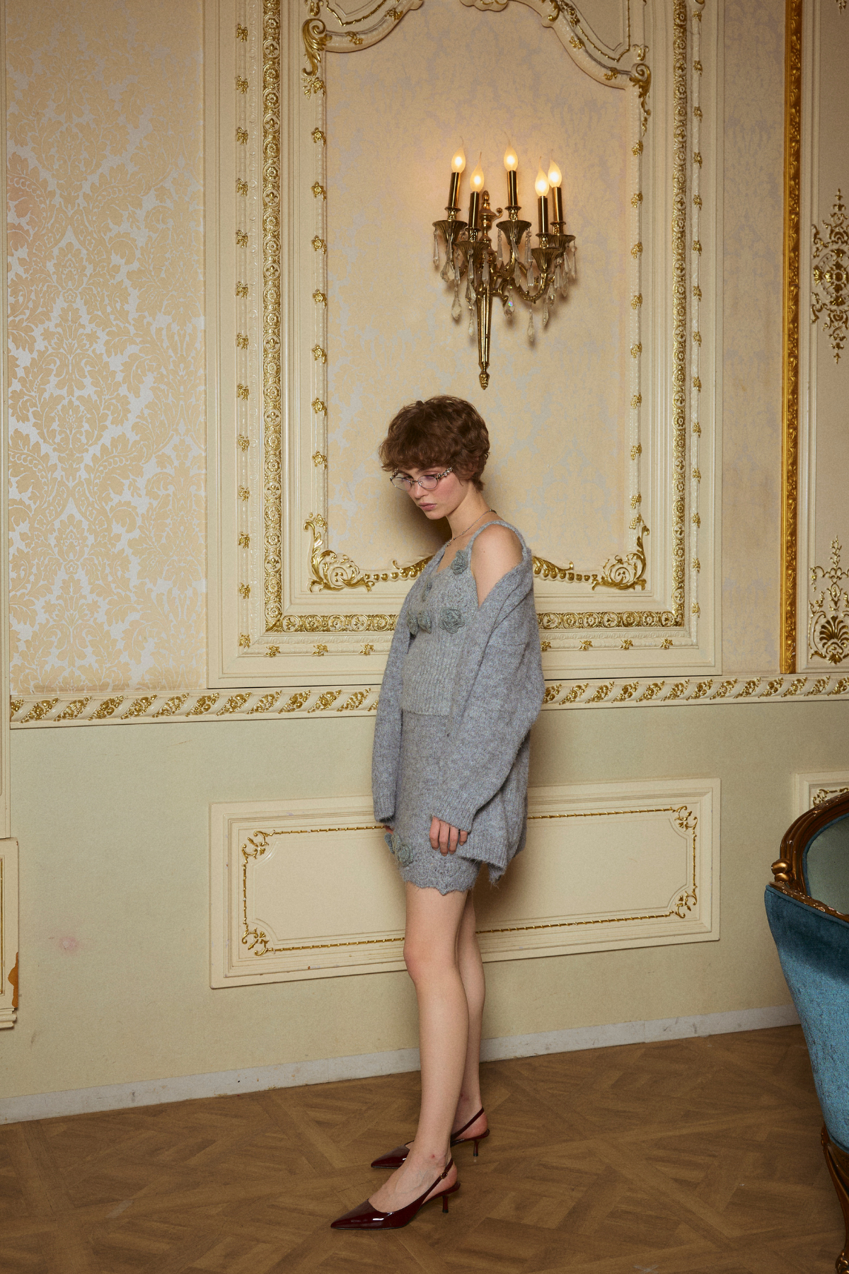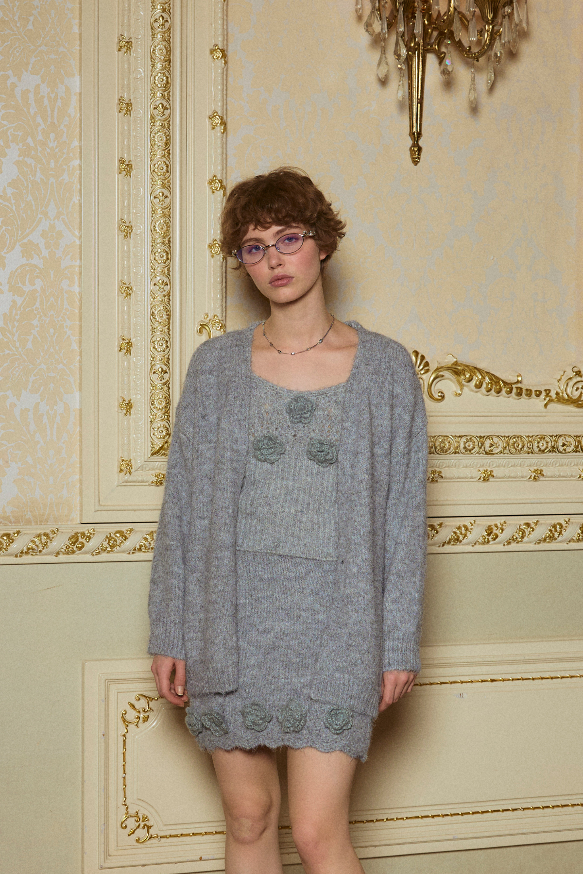 立体的なフラワーモチーフが愛らしいアクセントになった、ニットキャミソール・スカート・カーディガンの3点セット。