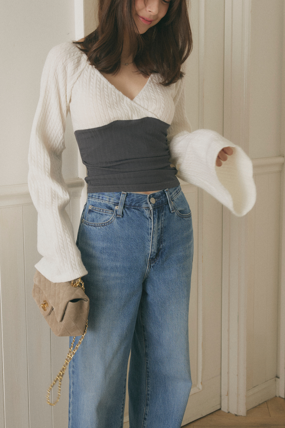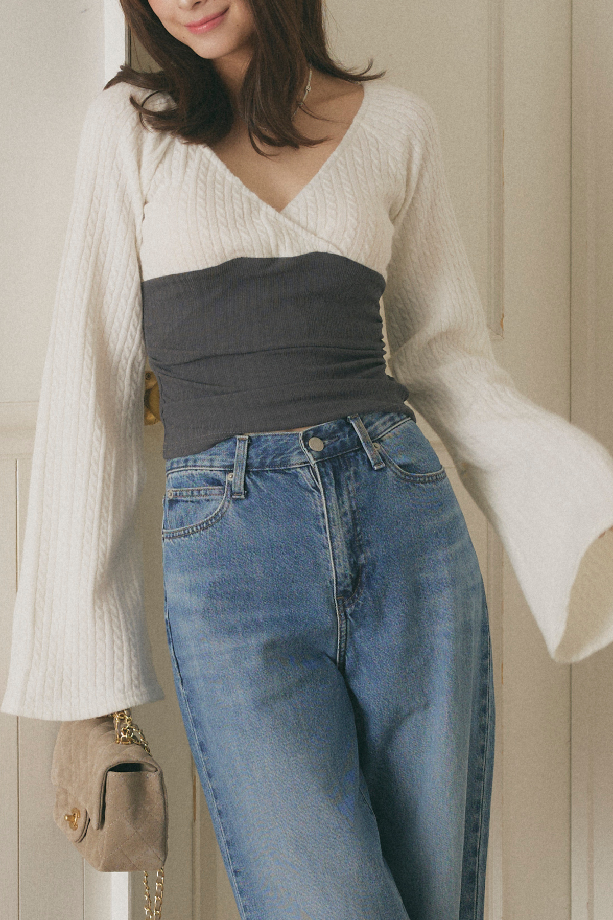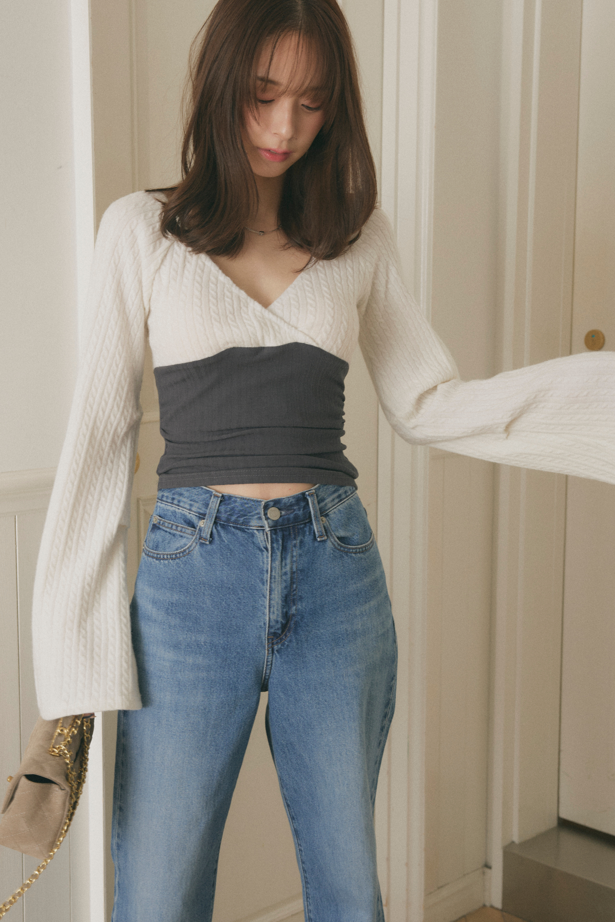 Vネックウエストライントップス