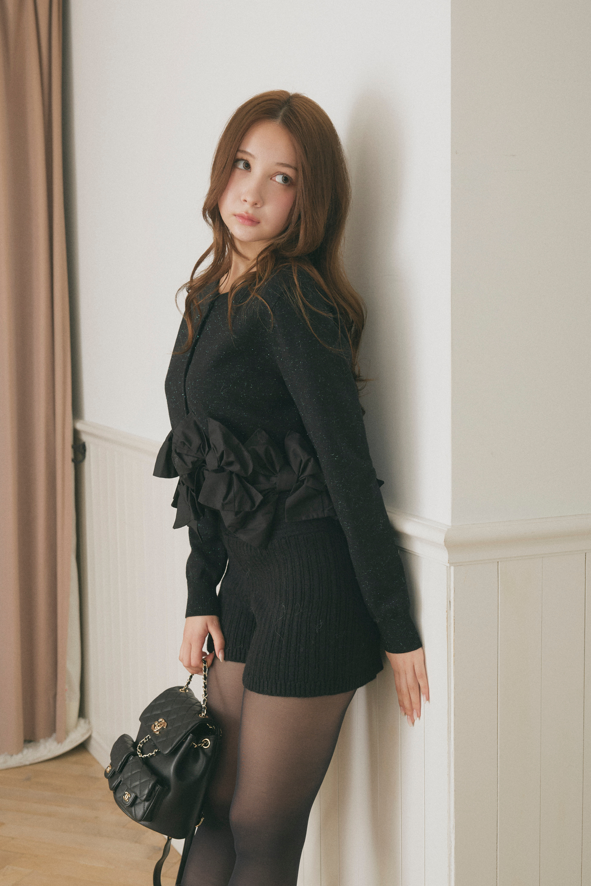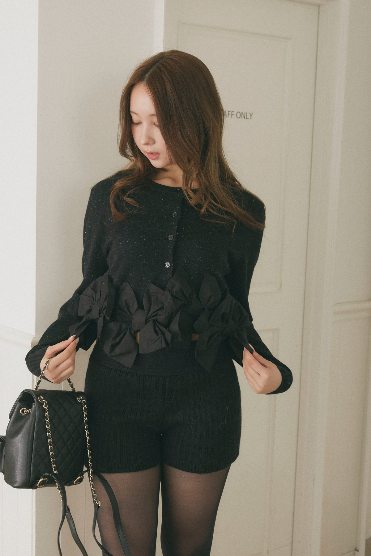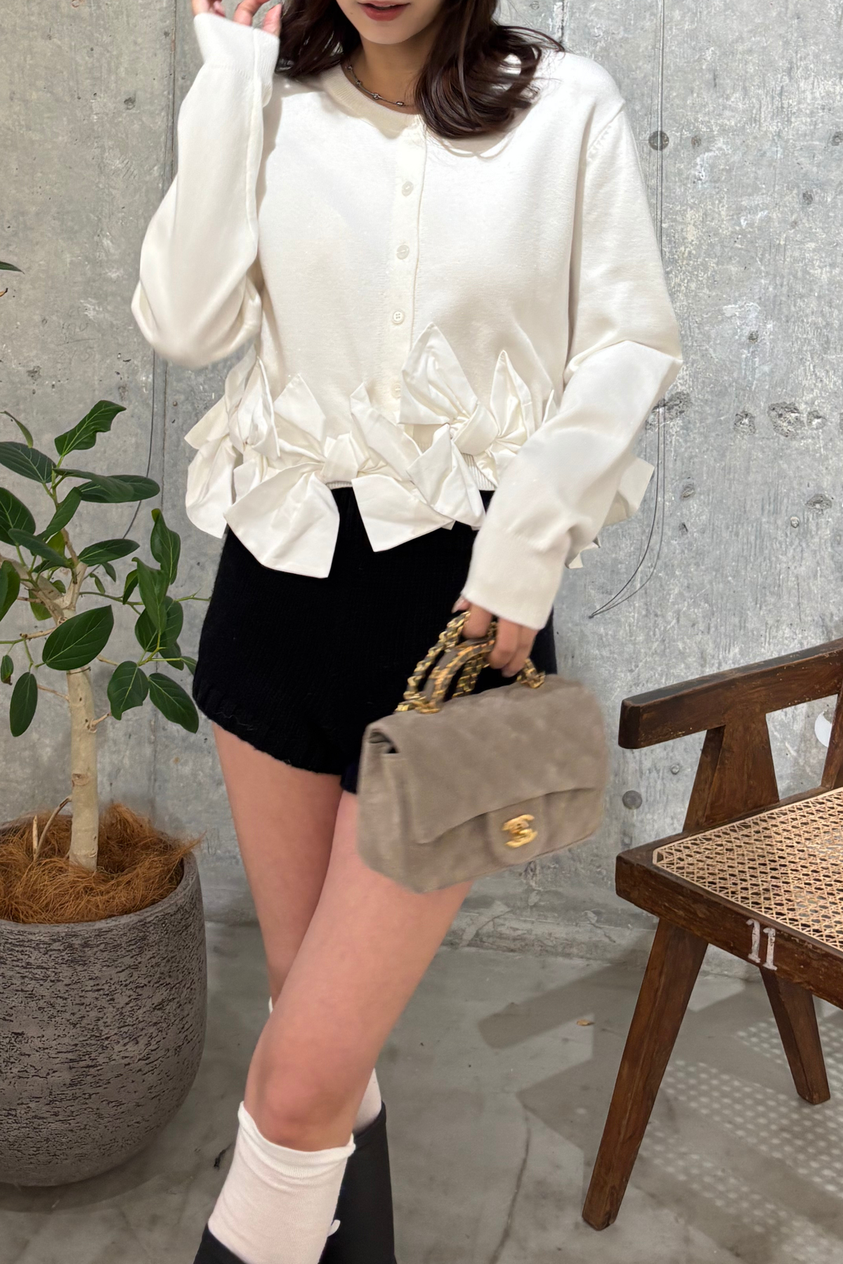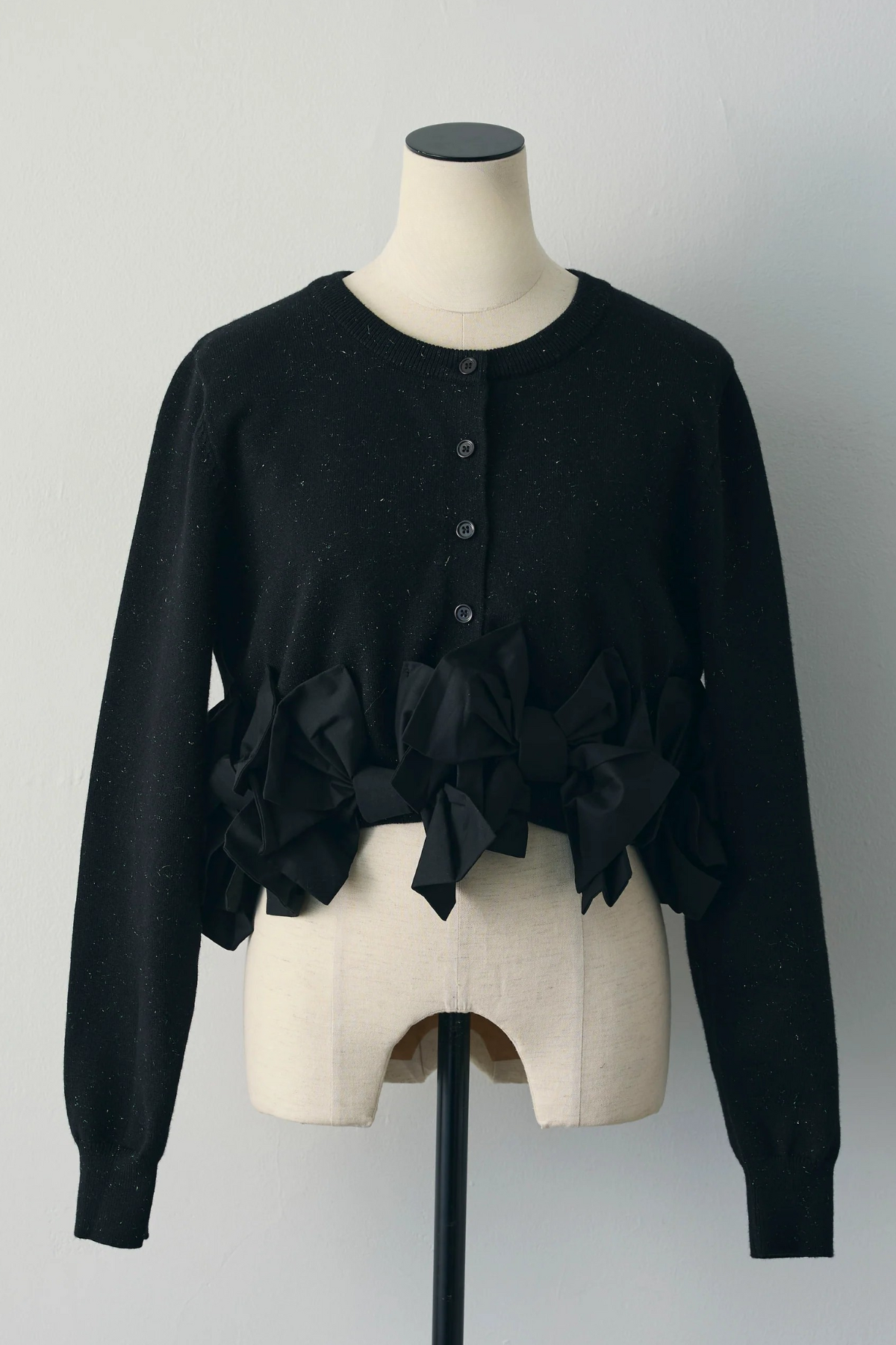 裾にあしらった立体的なリボンディテールが目を惹く、華やかな印象のニットカーディガン。