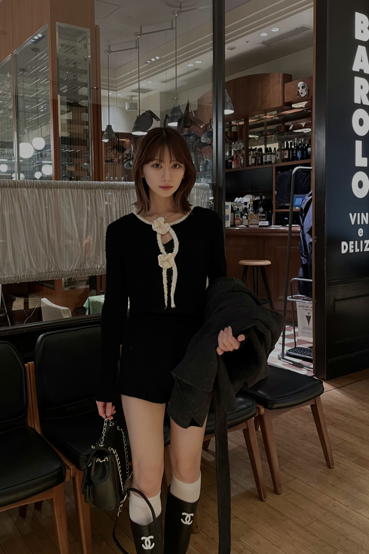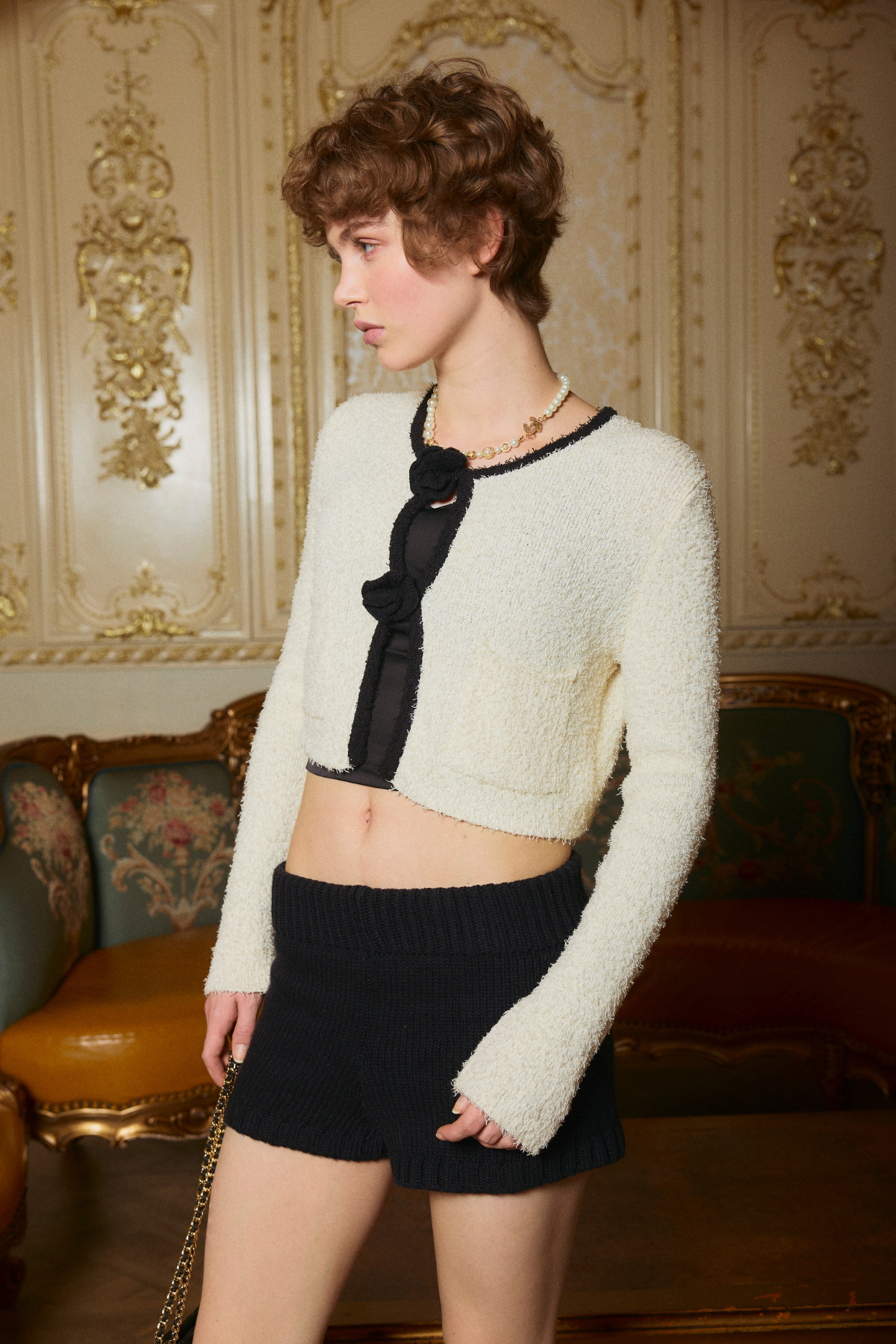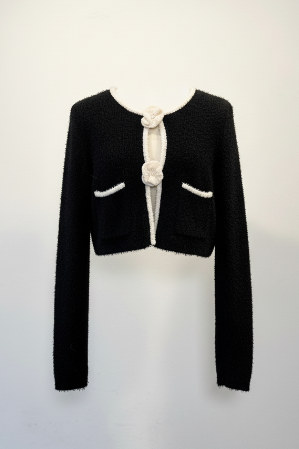上品なモノトーン配色が際立つ、クラシカルなショートカーディガン。