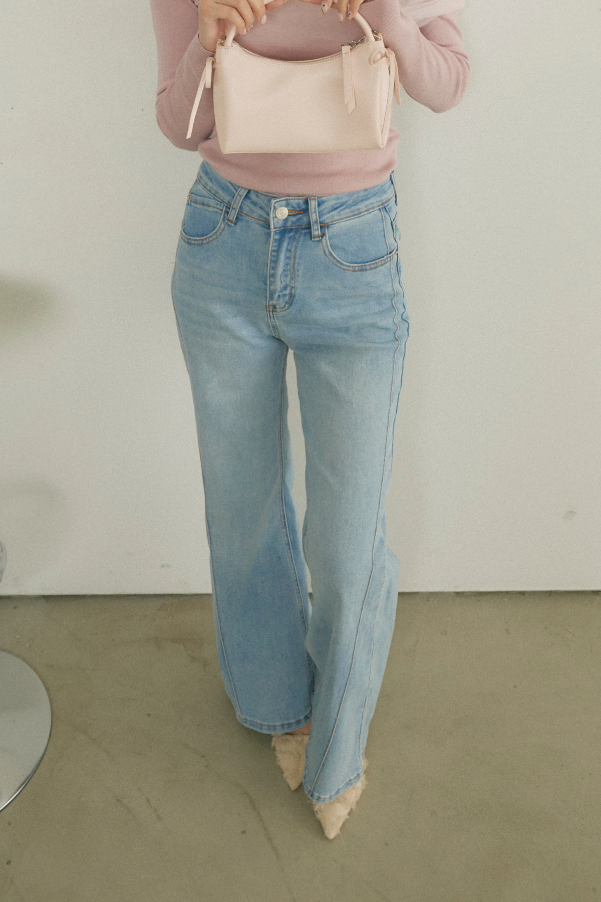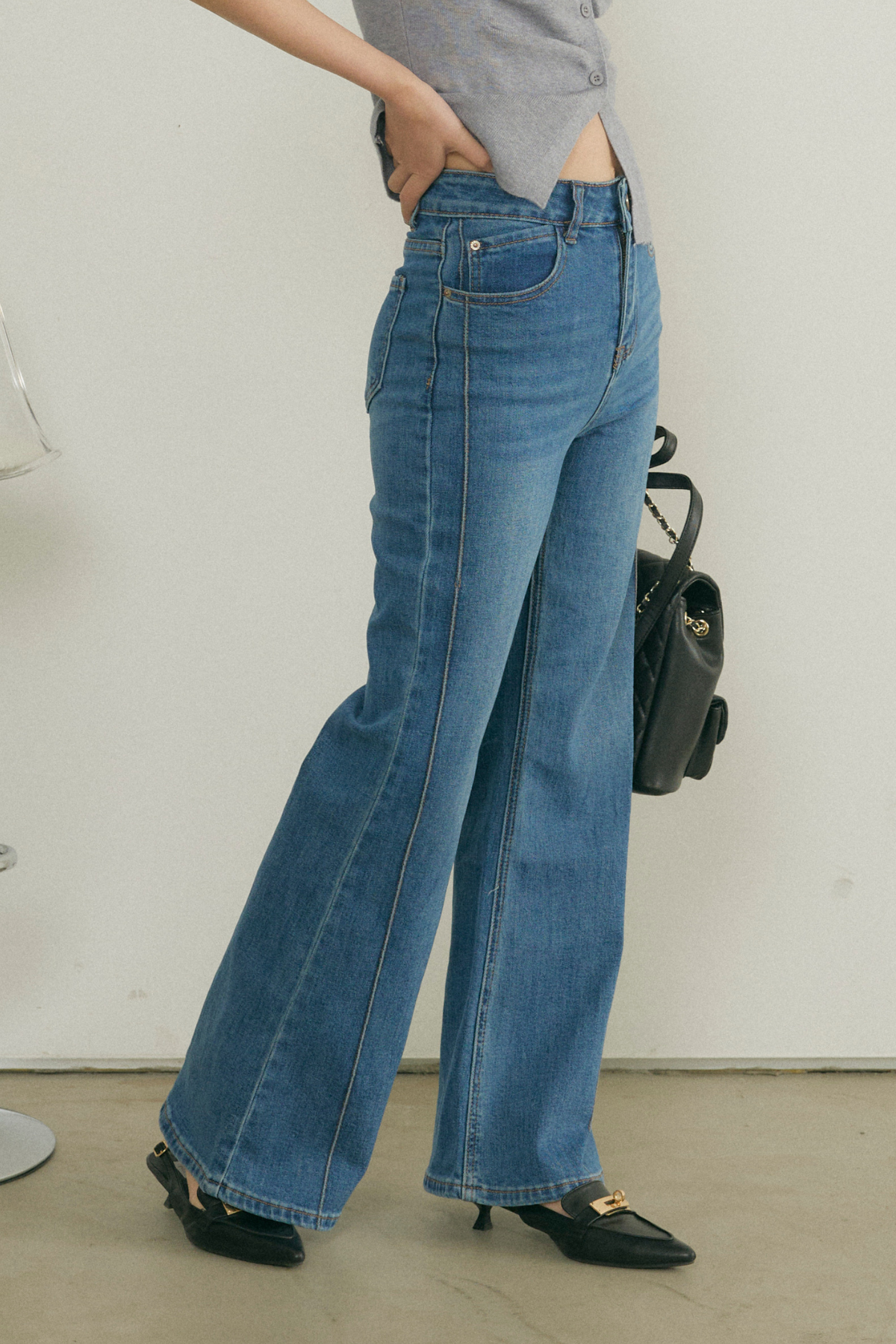 【デザイン】シンプルながらも洗練されたフレアシルエットが特徴のデニムパンツ。高めのウエストラインがスタイルを美しく引き立て、脚長効果を実現します。異なる色合いの2色展開で、カジュアルからきれいめまで幅広いスタイルに対応可能です。柔らかな素材感が心地よく、デイリーユースにぴったりの一着です。