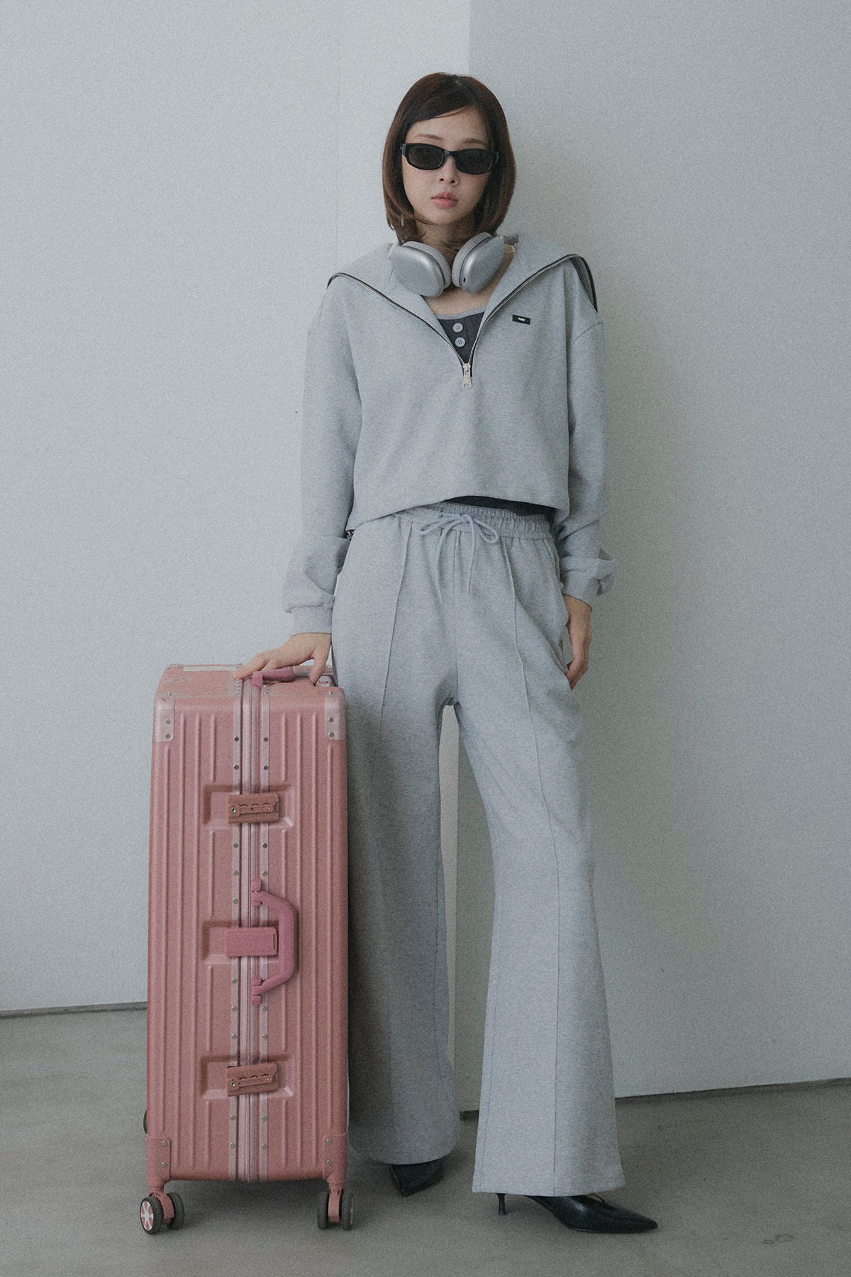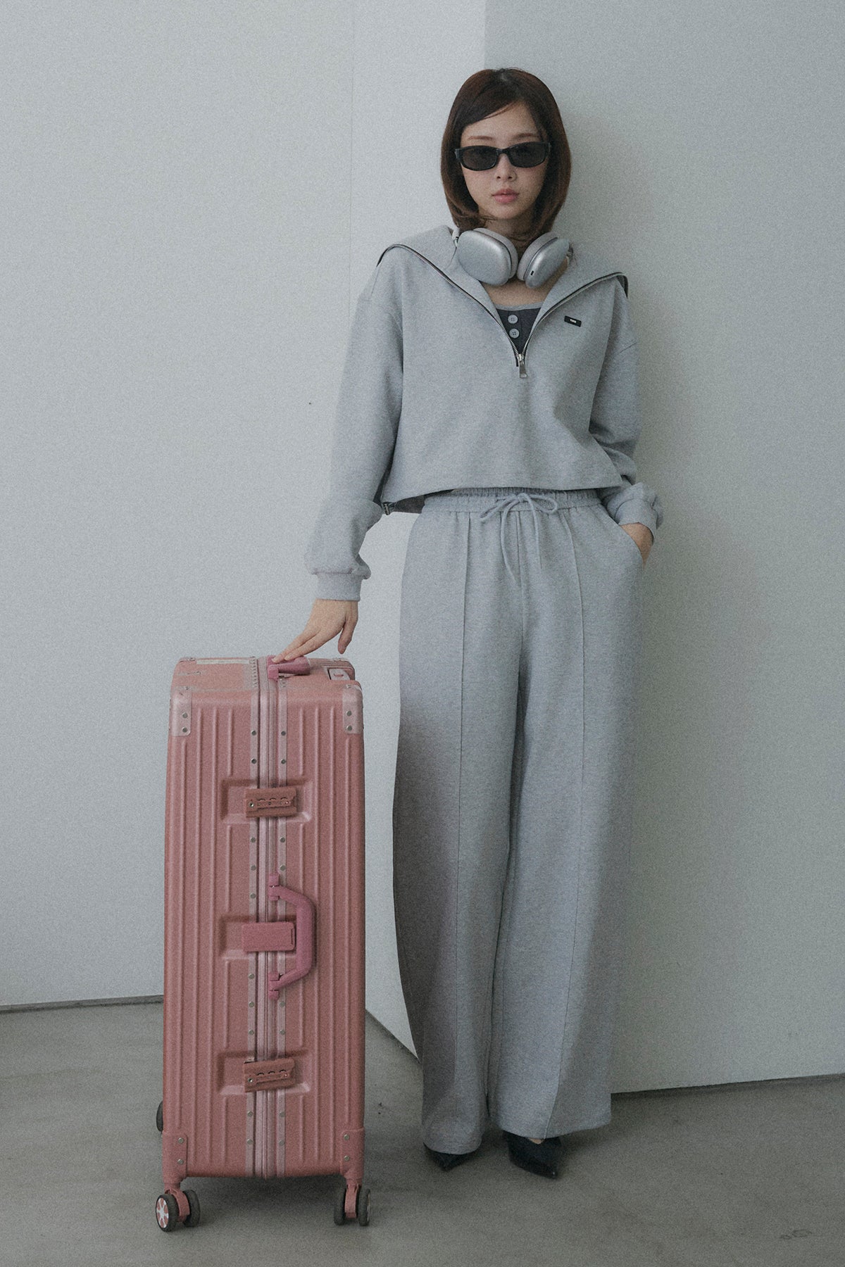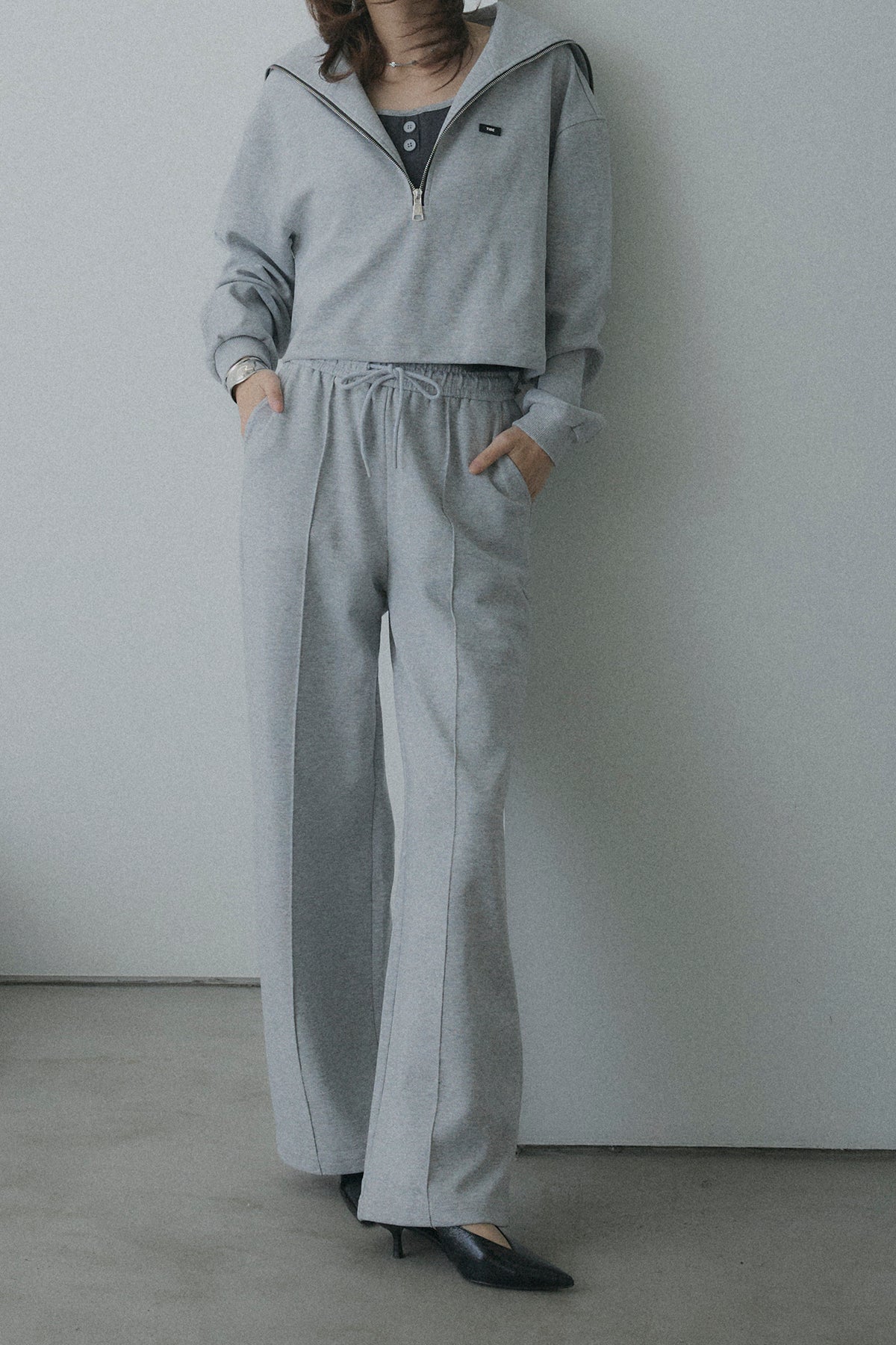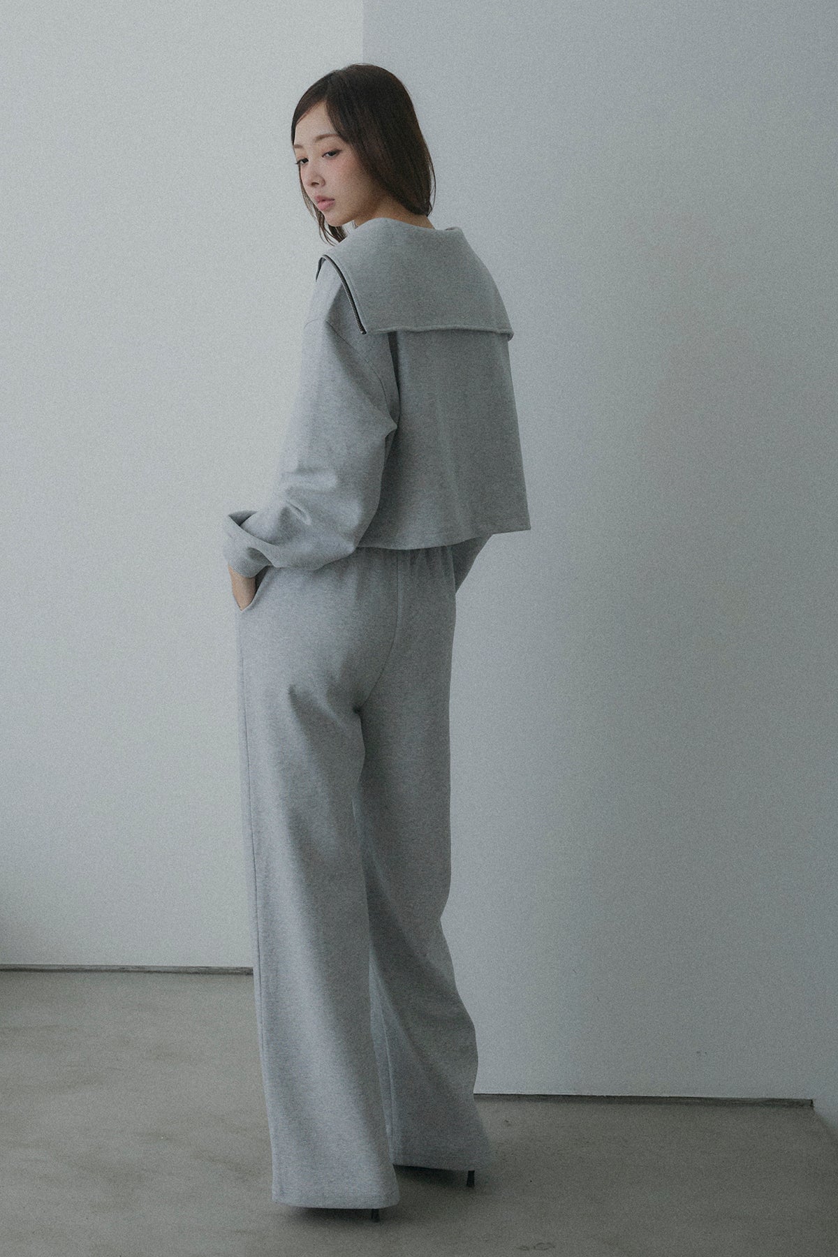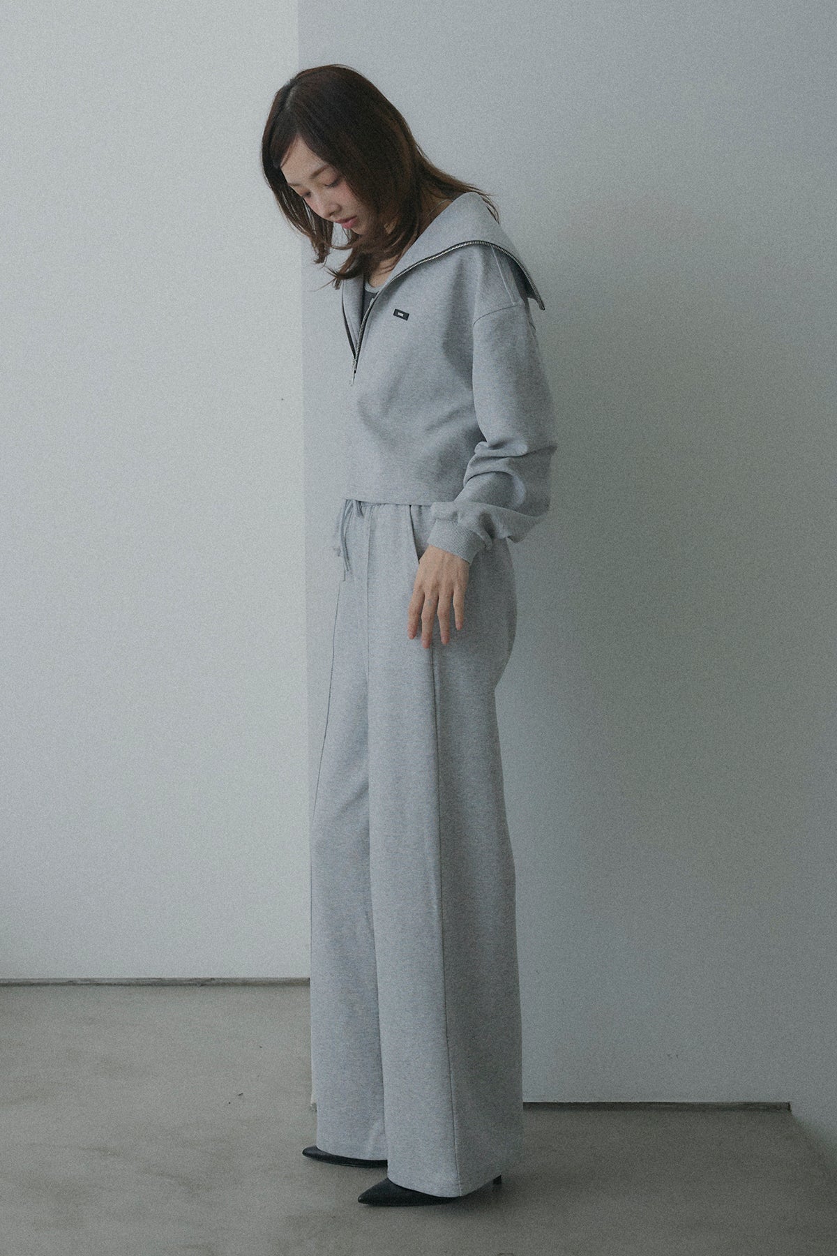 【デザイン】ワイドシルエットのボトムスは体型をカバーしつつ、旬な「重心低め」のスタイリングを実現。 カジュアルなスウェット素材ながら、顔周りをすっきり見せる襟のデザインが、女性らしさを引き立てます。
