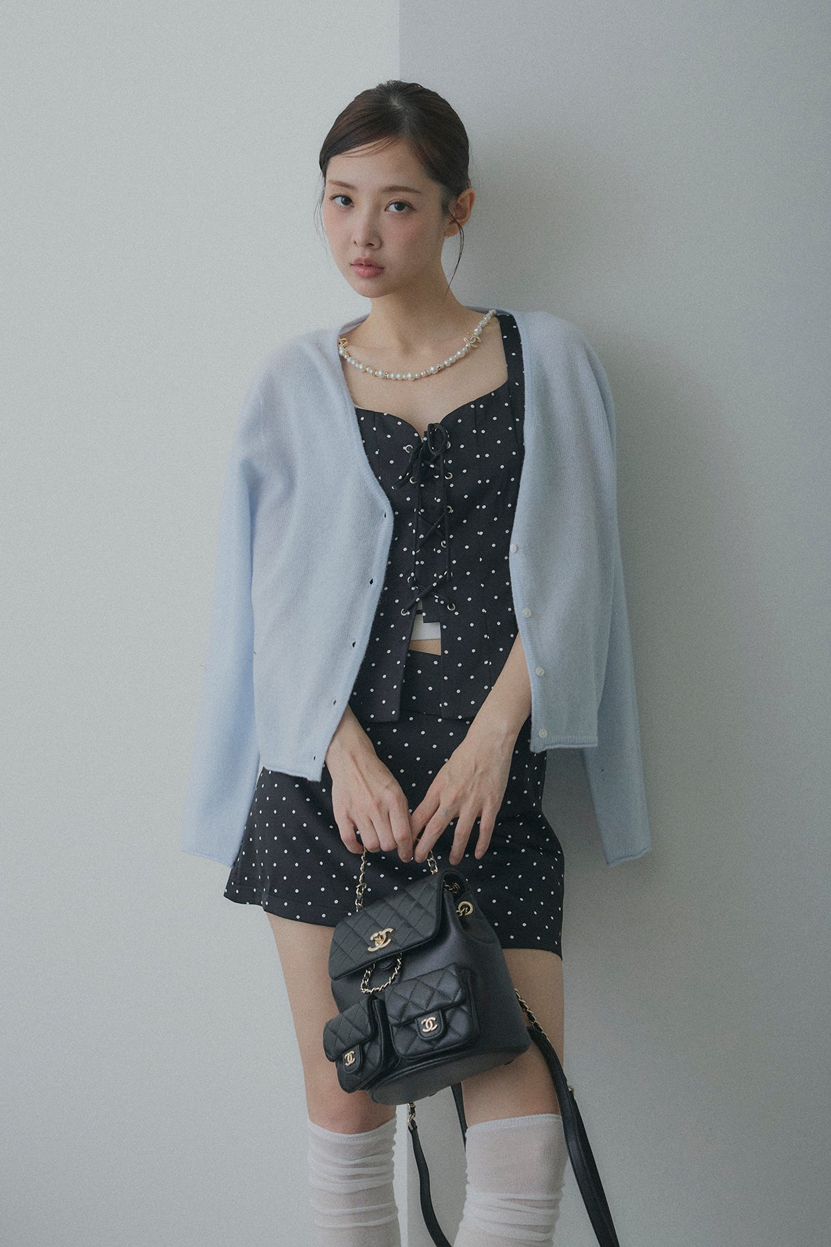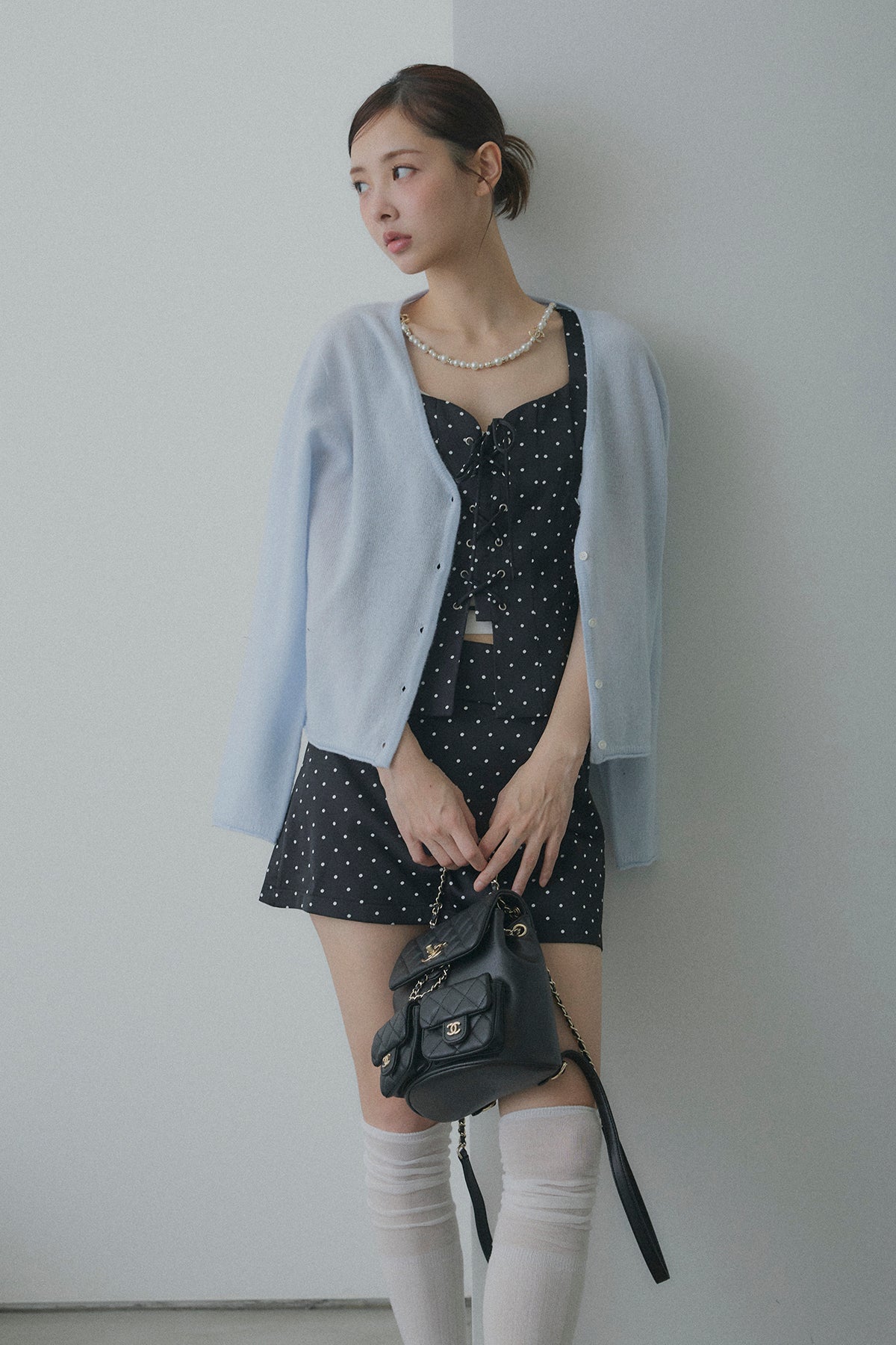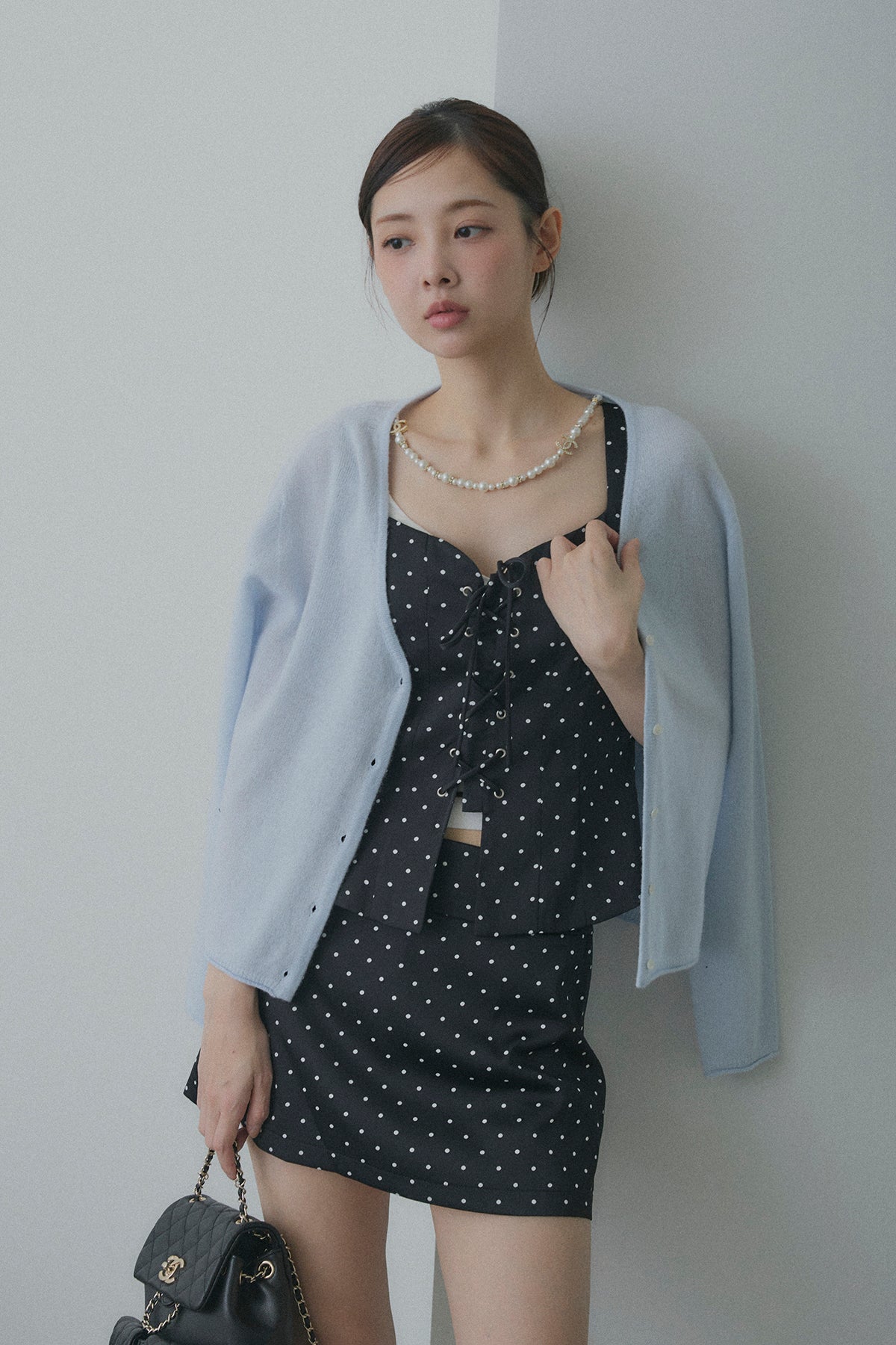 【デザイン】 ボディラインを綺麗に見せてくれるフロントレースアップデザインのビスチェセットアップ。コルセット風の編み上げがウエストラインをキュッと引き締め、コンパクトなミニスカートとの相乗効果で、抜群のスタイルアップを叶えます。クラシカルなドット柄が、ガーリーさと都会的なモード感を両立させてくれる一着です。
