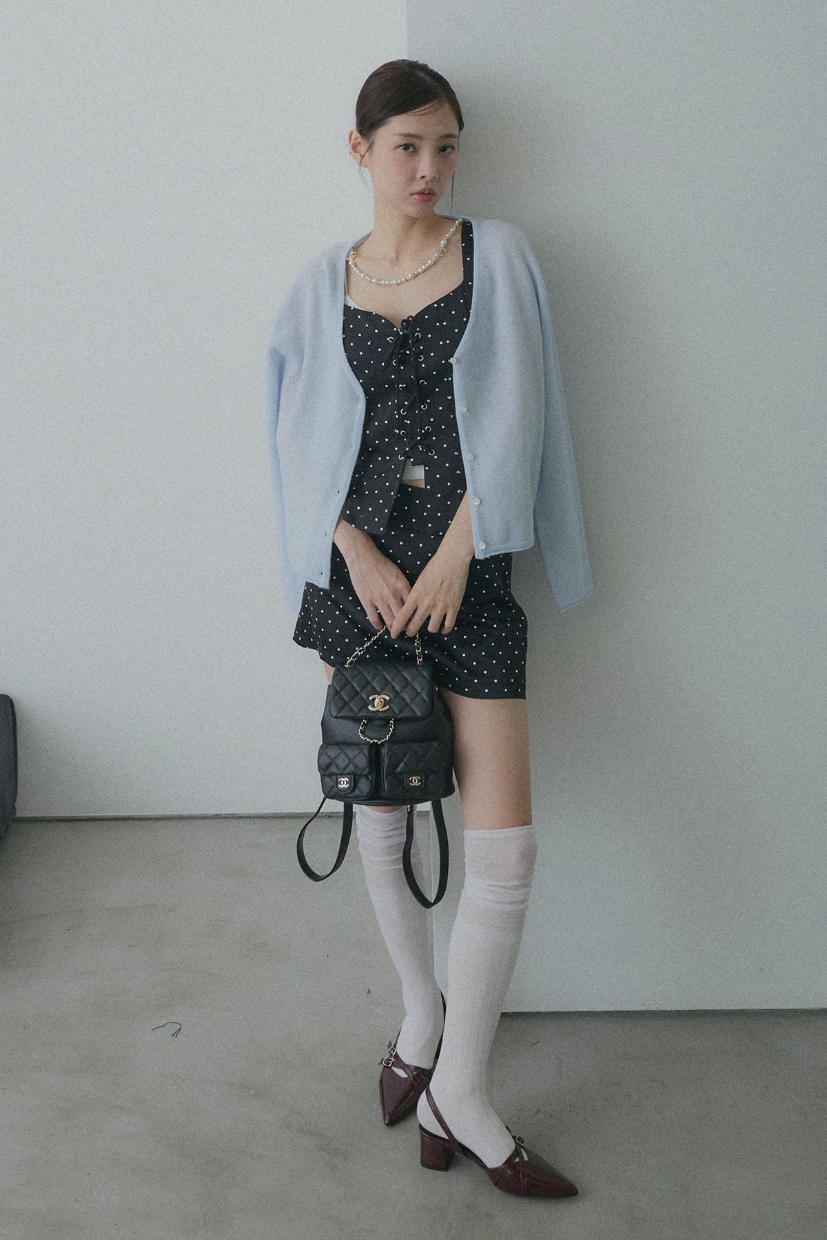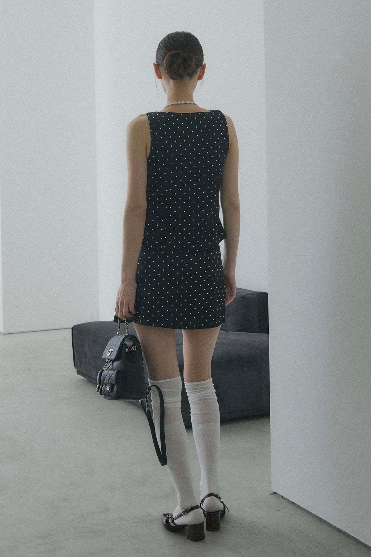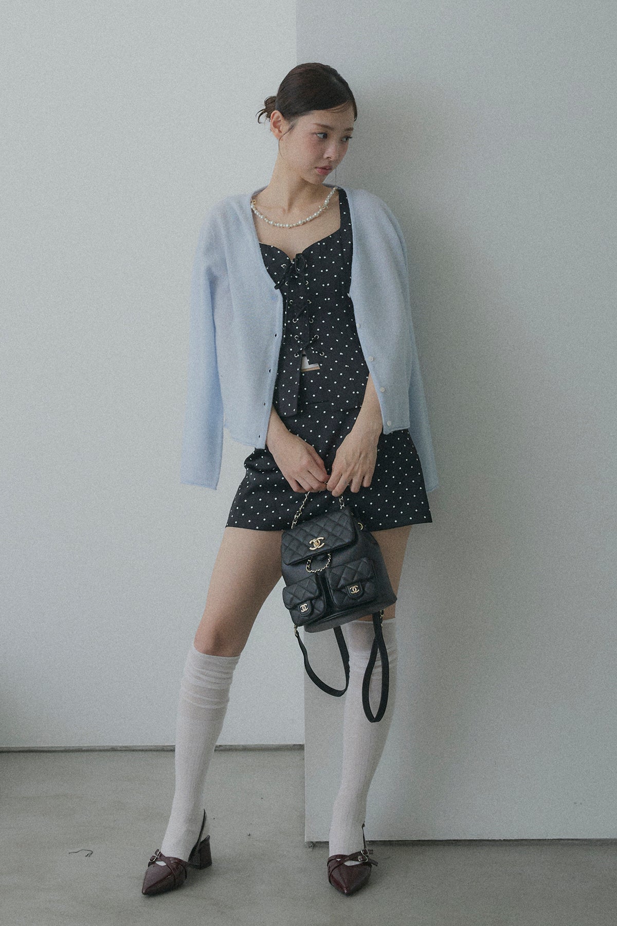 【デザイン】 ボディラインを綺麗に見せてくれるフロントレースアップデザインのビスチェセットアップ。コルセット風の編み上げがウエストラインをキュッと引き締め、コンパクトなミニスカートとの相乗効果で、抜群のスタイルアップを叶えます。クラシカルなドット柄が、ガーリーさと都会的なモード感を両立させてくれる一着です。