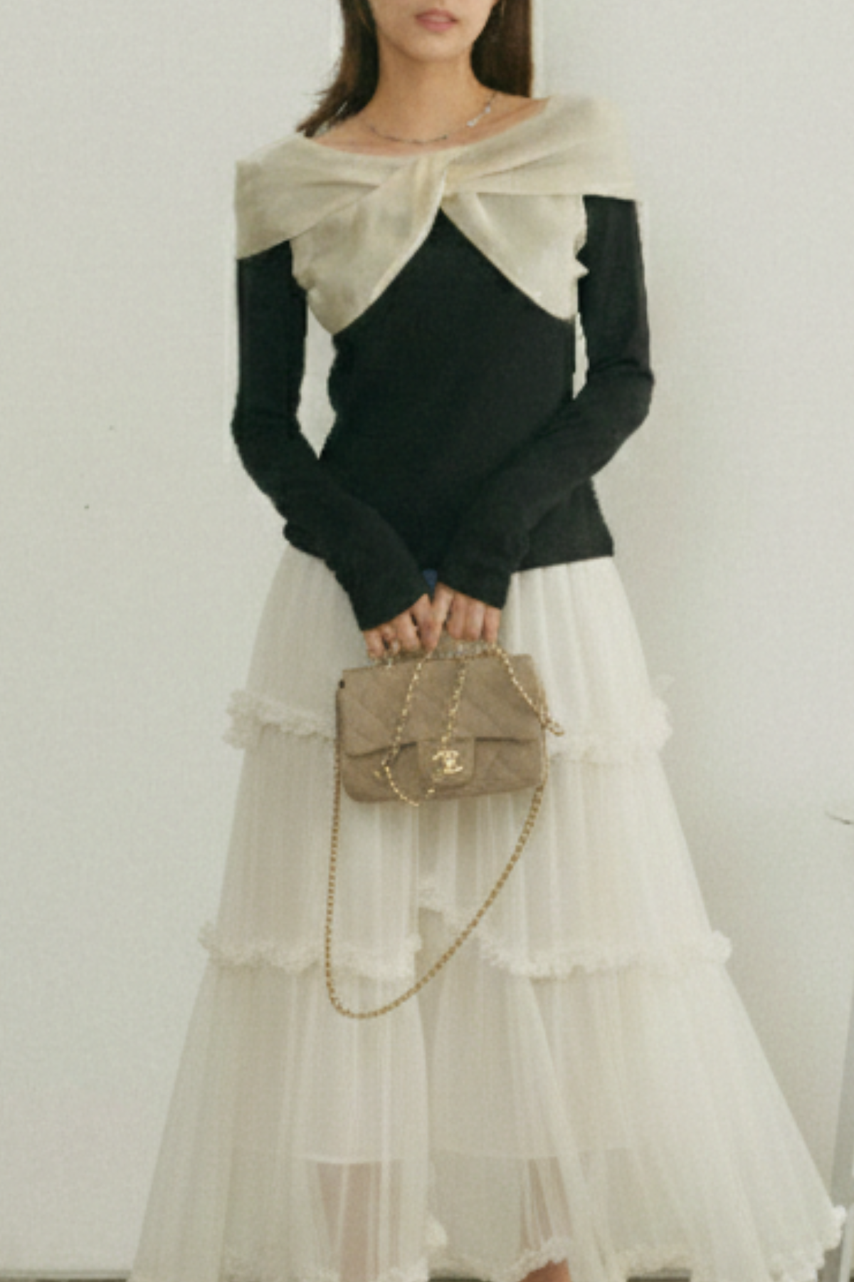 チュールティアードロングスカートと組み合わせたコーデがおすすめです♡