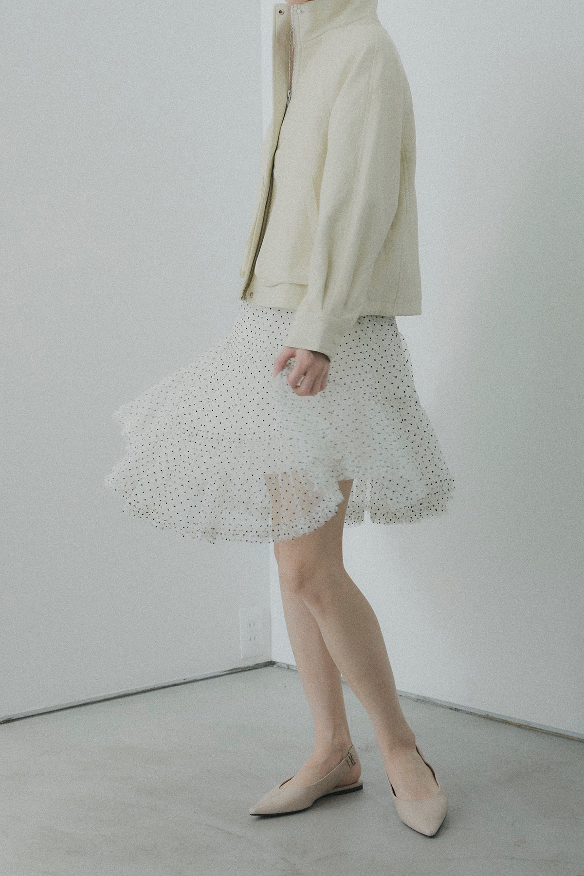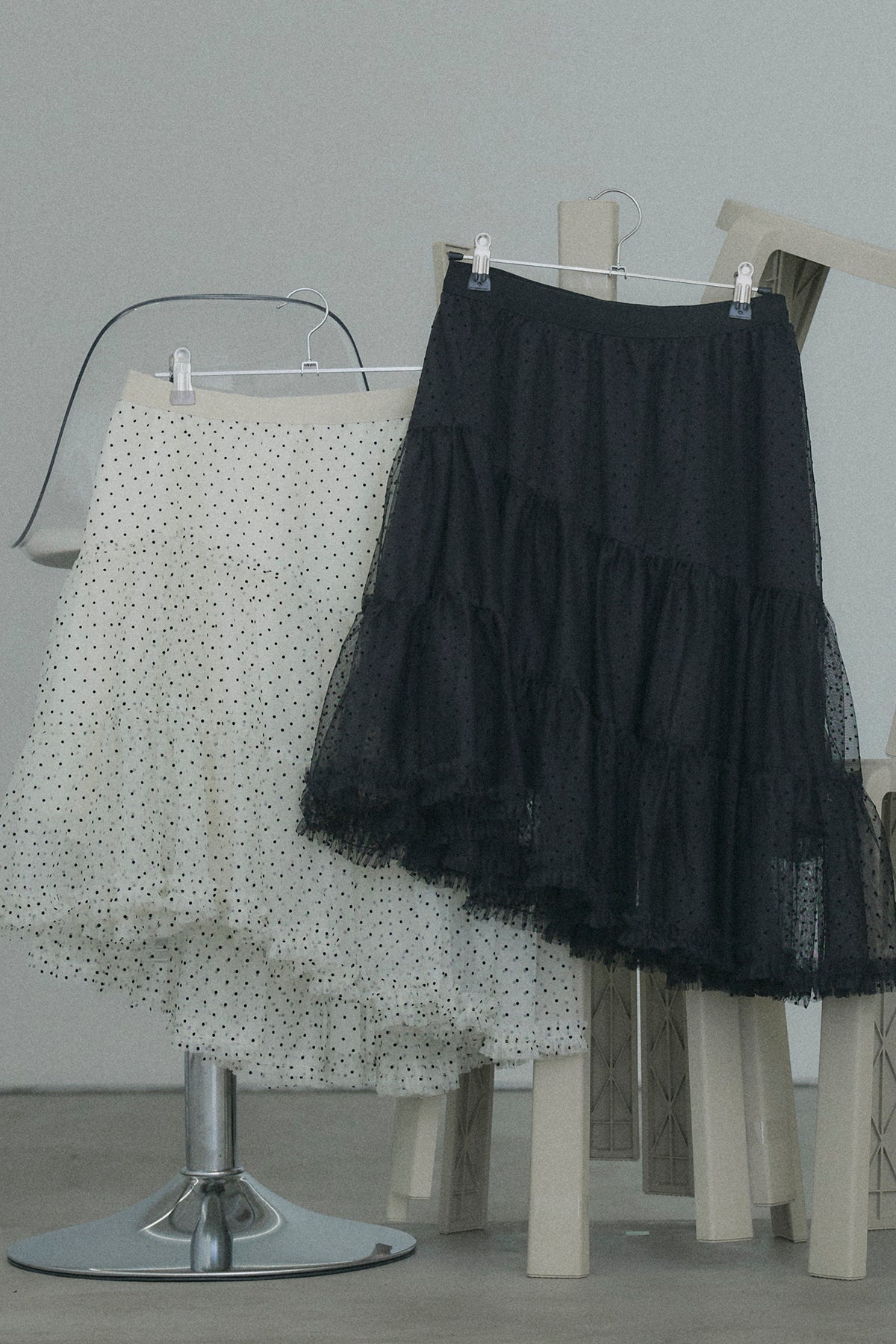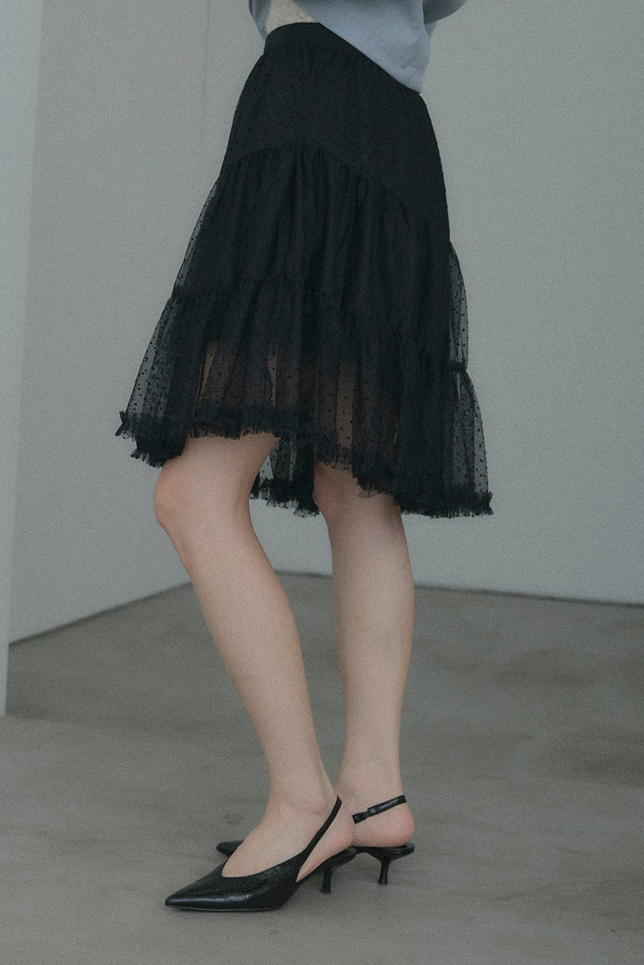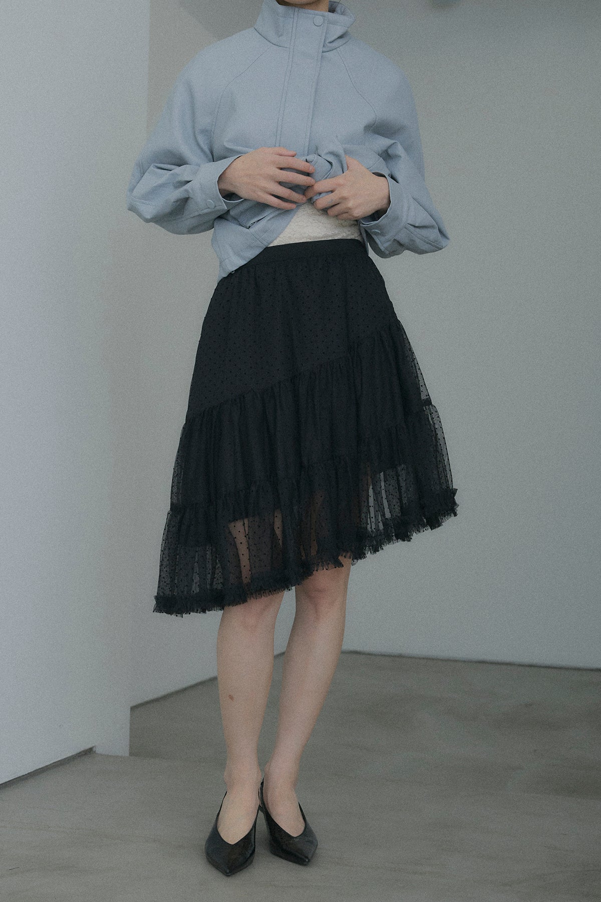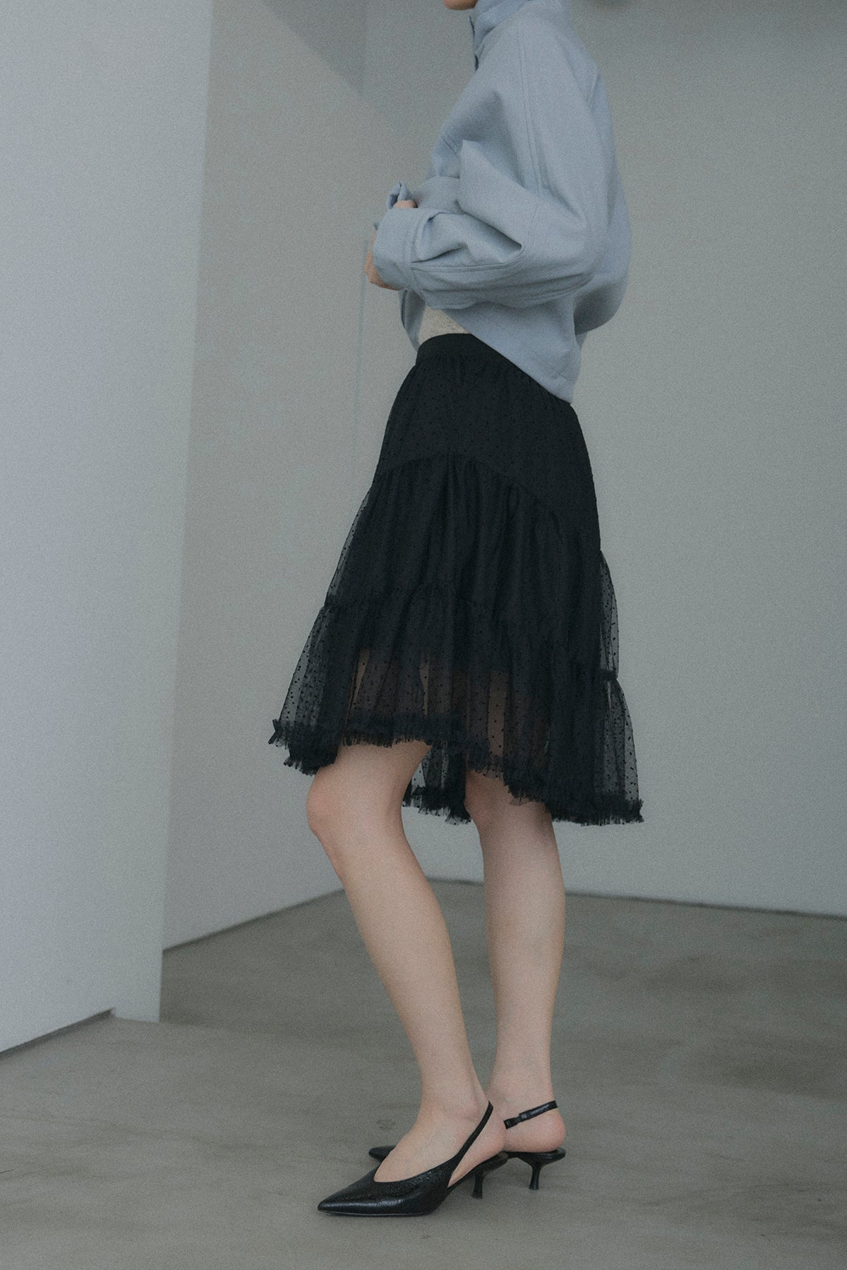 【デザイン】 軽やかなドット柄のチュールを幾重にも重ね、デイリーに重宝しながらも、脚のラインを綺麗に見せてくれるアシンメトリーな裾デザイン。歩くたびにランダムに揺れるティアードフリルが、コーディネートに奥行きと華やかさをプラスします。程よいシアー感とボリュームのバランスが、女性らしく可憐なシルエットを演出してくれます。