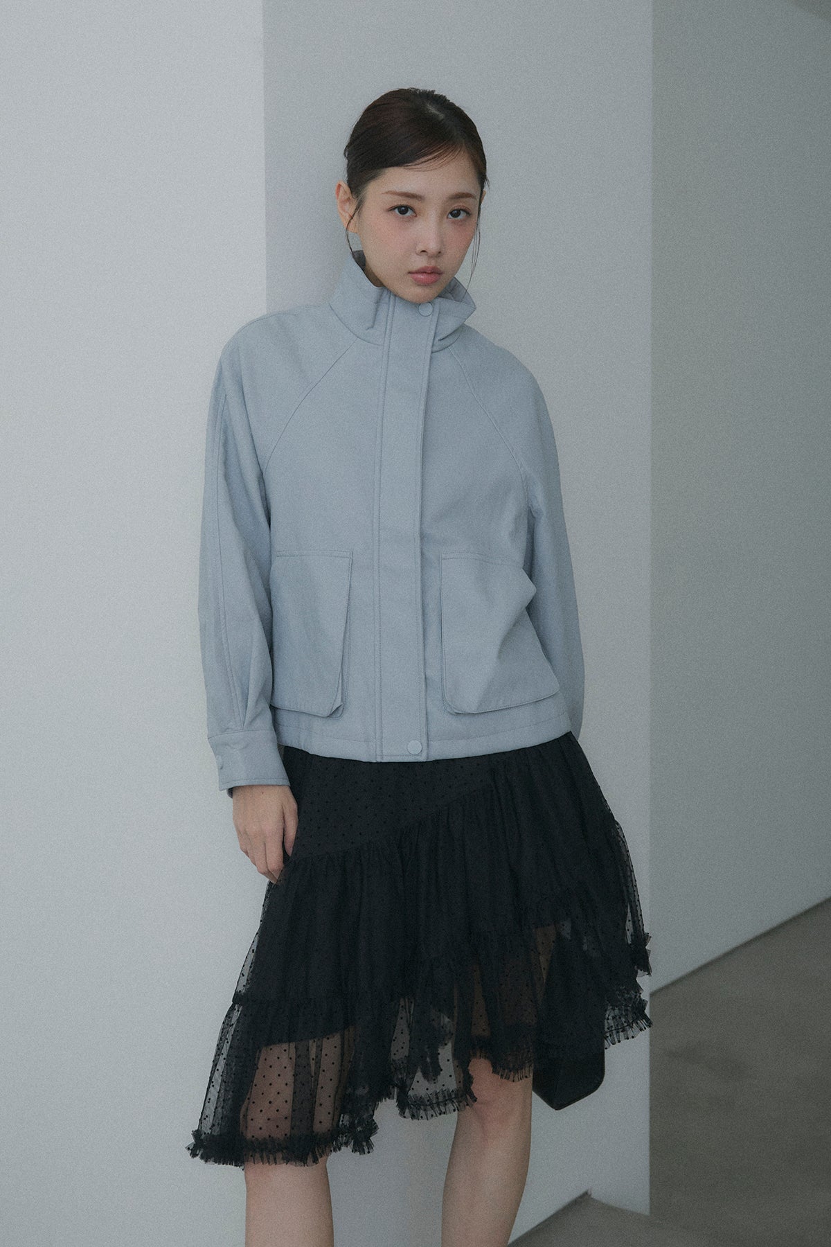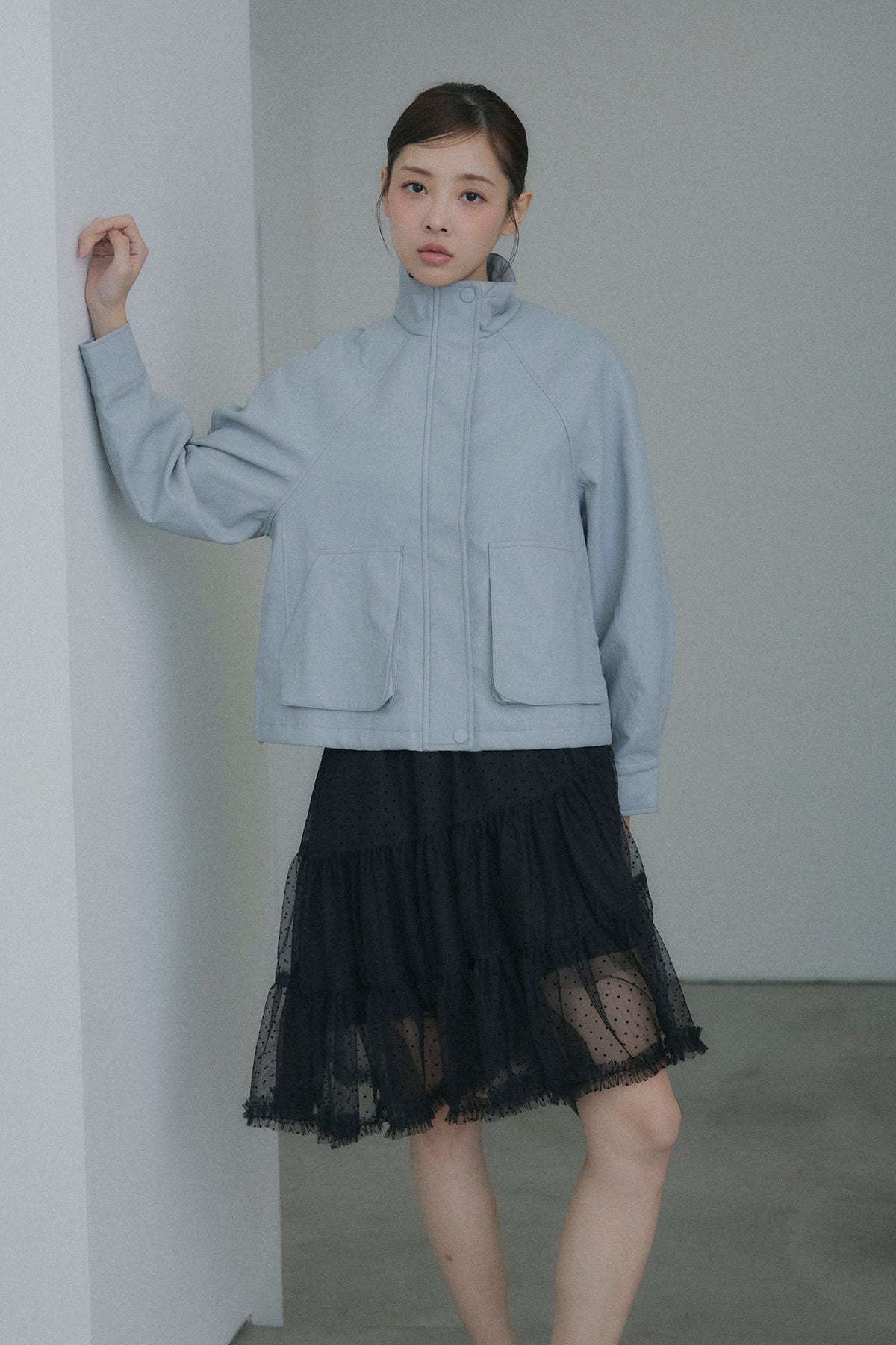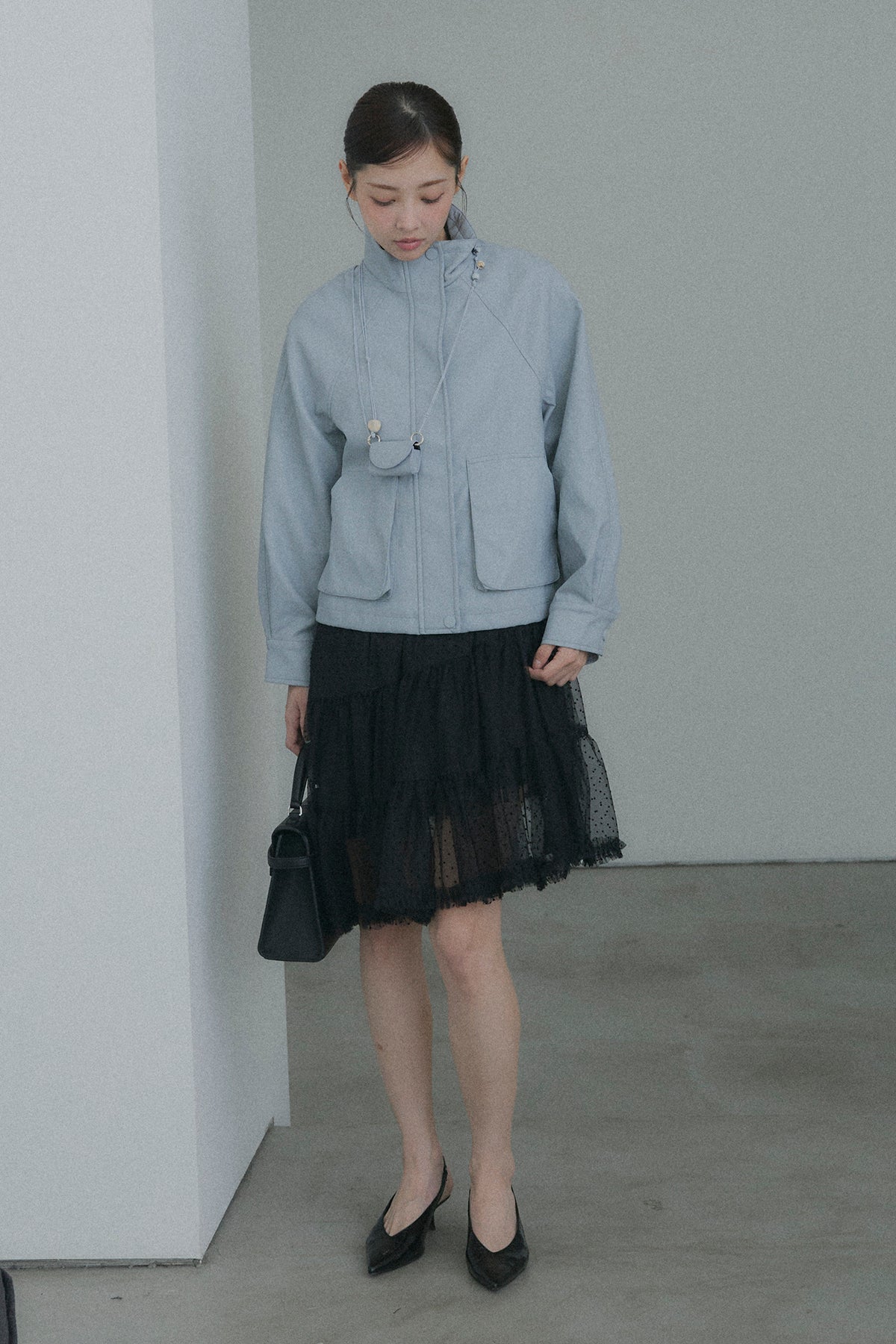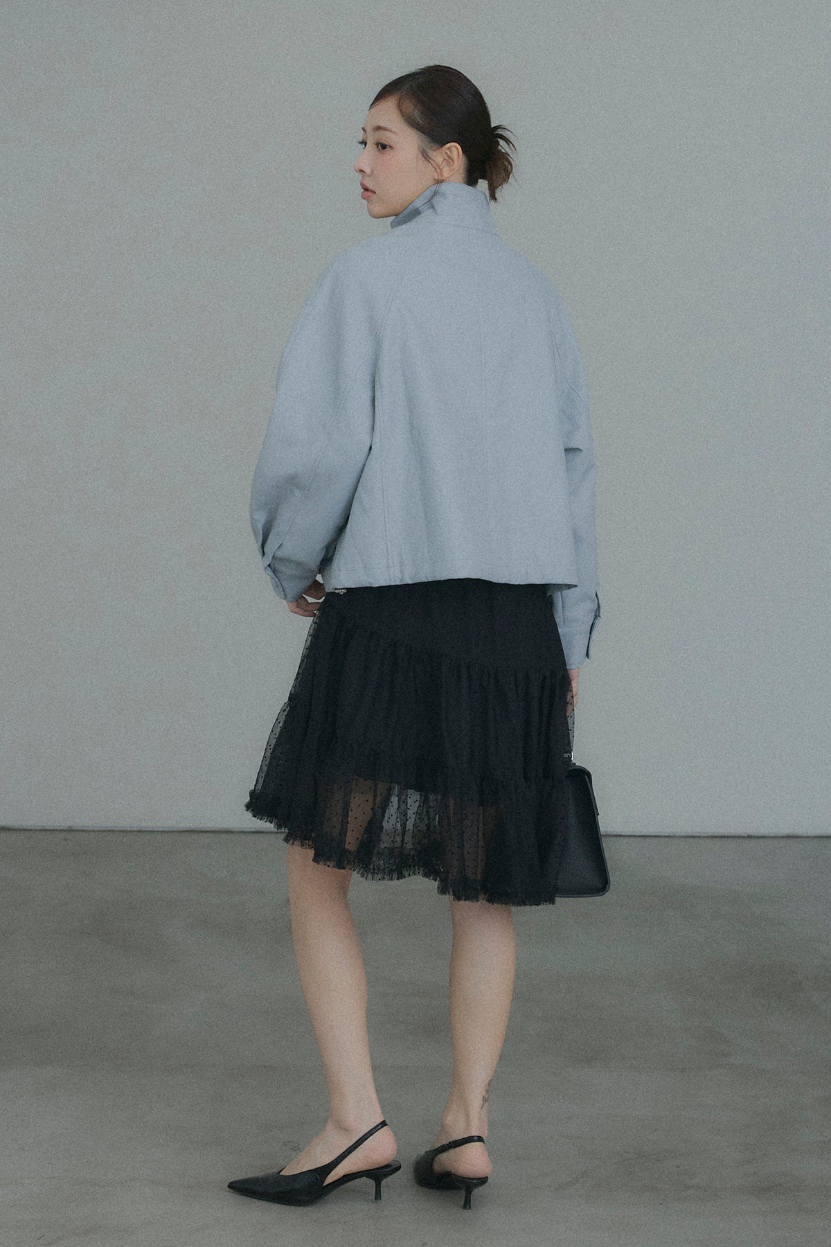 【デザイン】 軽やかなドット柄のチュールを幾重にも重ね、デイリーに重宝しながらも、脚のラインを綺麗に見せてくれるアシンメトリーな裾デザイン。歩くたびにランダムに揺れるティアードフリルが、コーディネートに奥行きと華やかさをプラスします。程よいシアー感とボリュームのバランスが、女性らしく可憐なシルエットを演出してくれます。