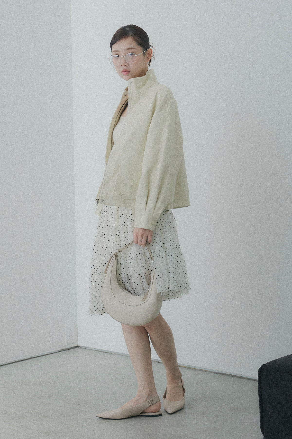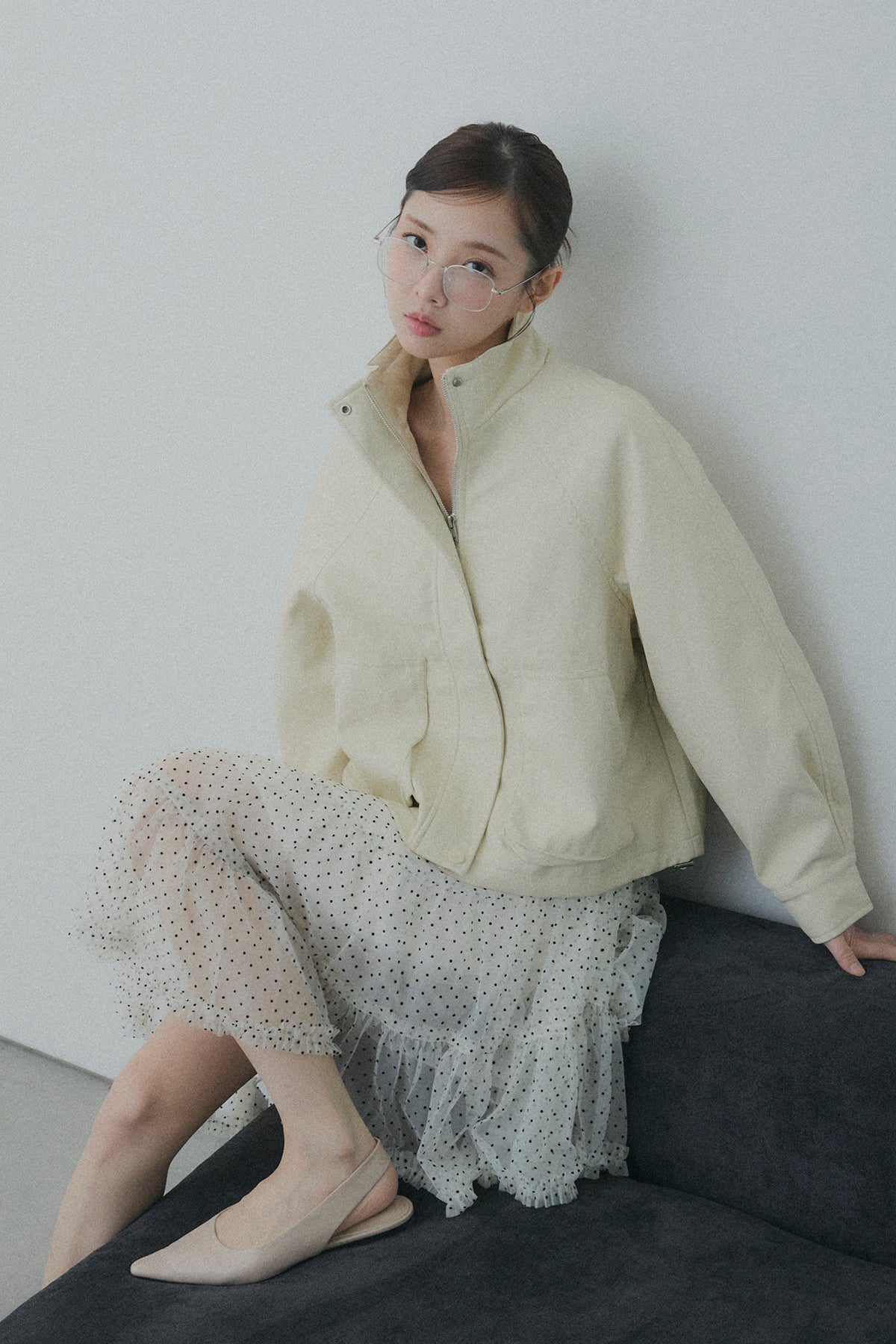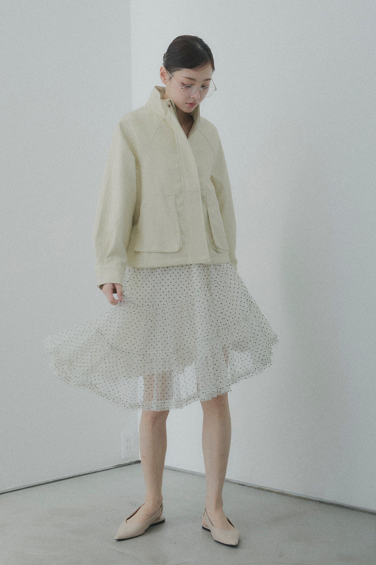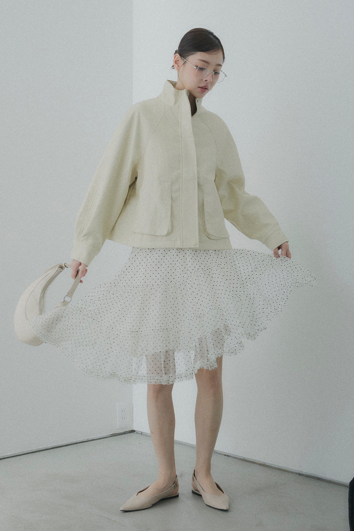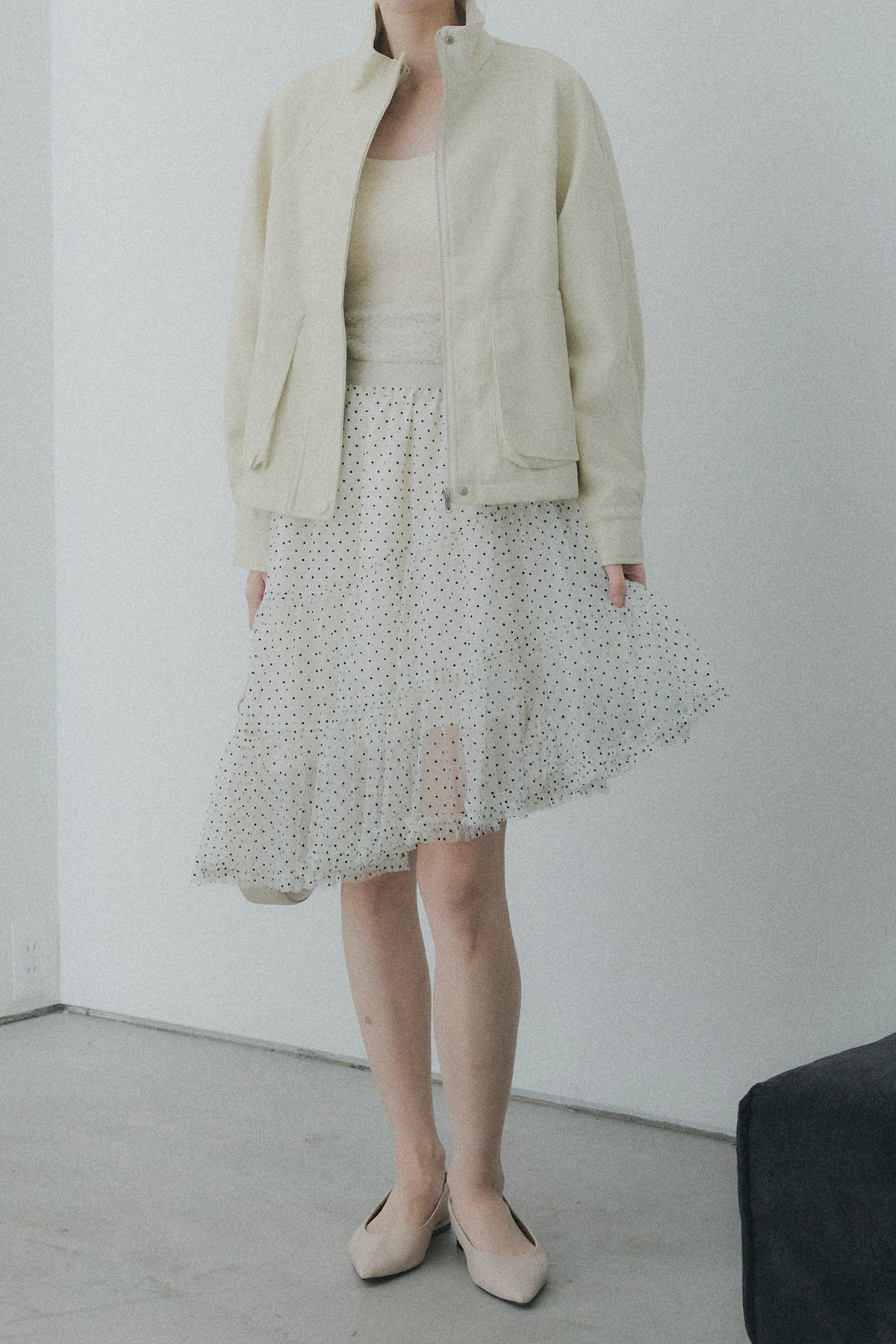 【コーディネートヒント】 足元にボリュームのある厚底ブーツやソックスを投入して、甘さを抑えたスタイリッシュな着こなしを楽しむのもおすすめです。甘めなドット柄を活かしつつ、オーバーサイズのユニセックスなスウェットを合わせてカジュアルダウンすれば、こなれ感のあるミックススタイルに。シンプルなタイトニットをインして、アシンメトリーな裾のラインを際立たせるのもオススメです。