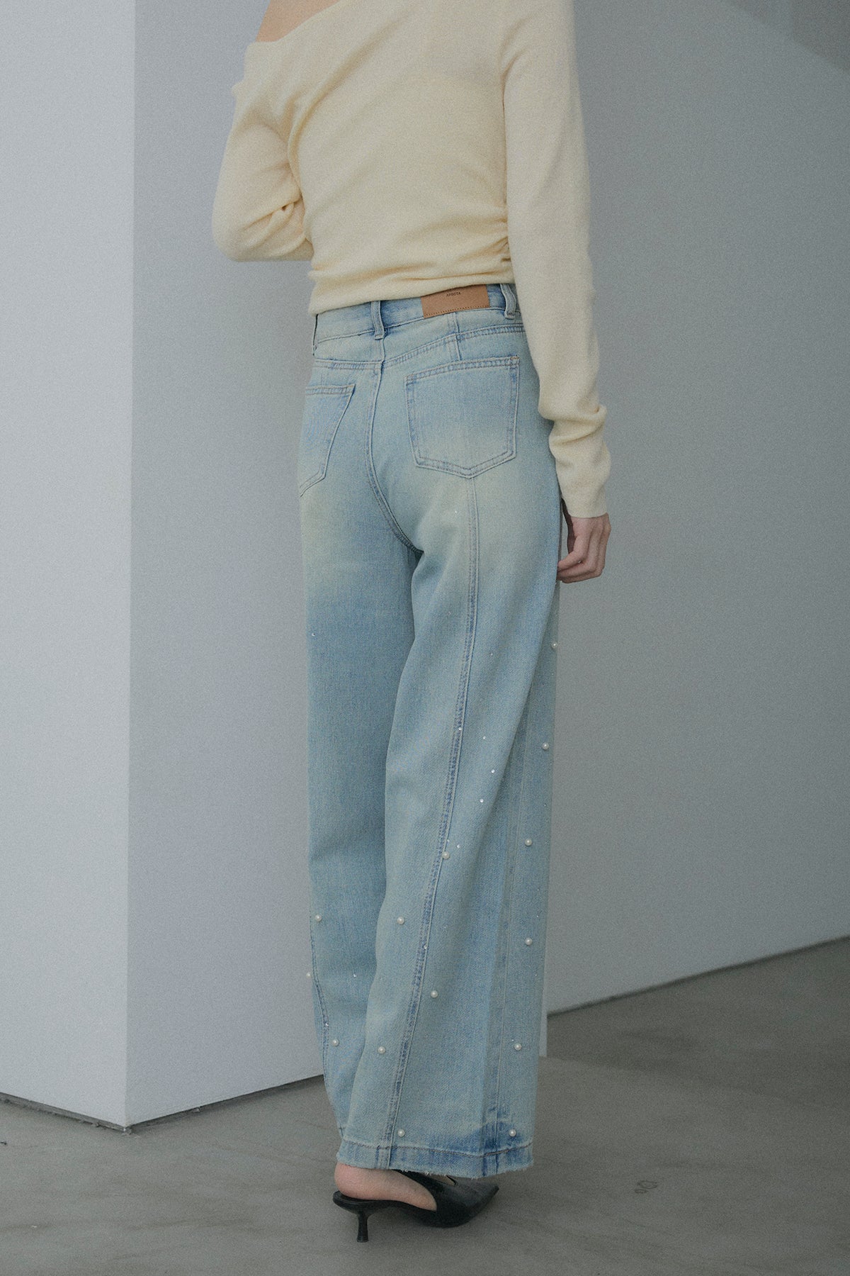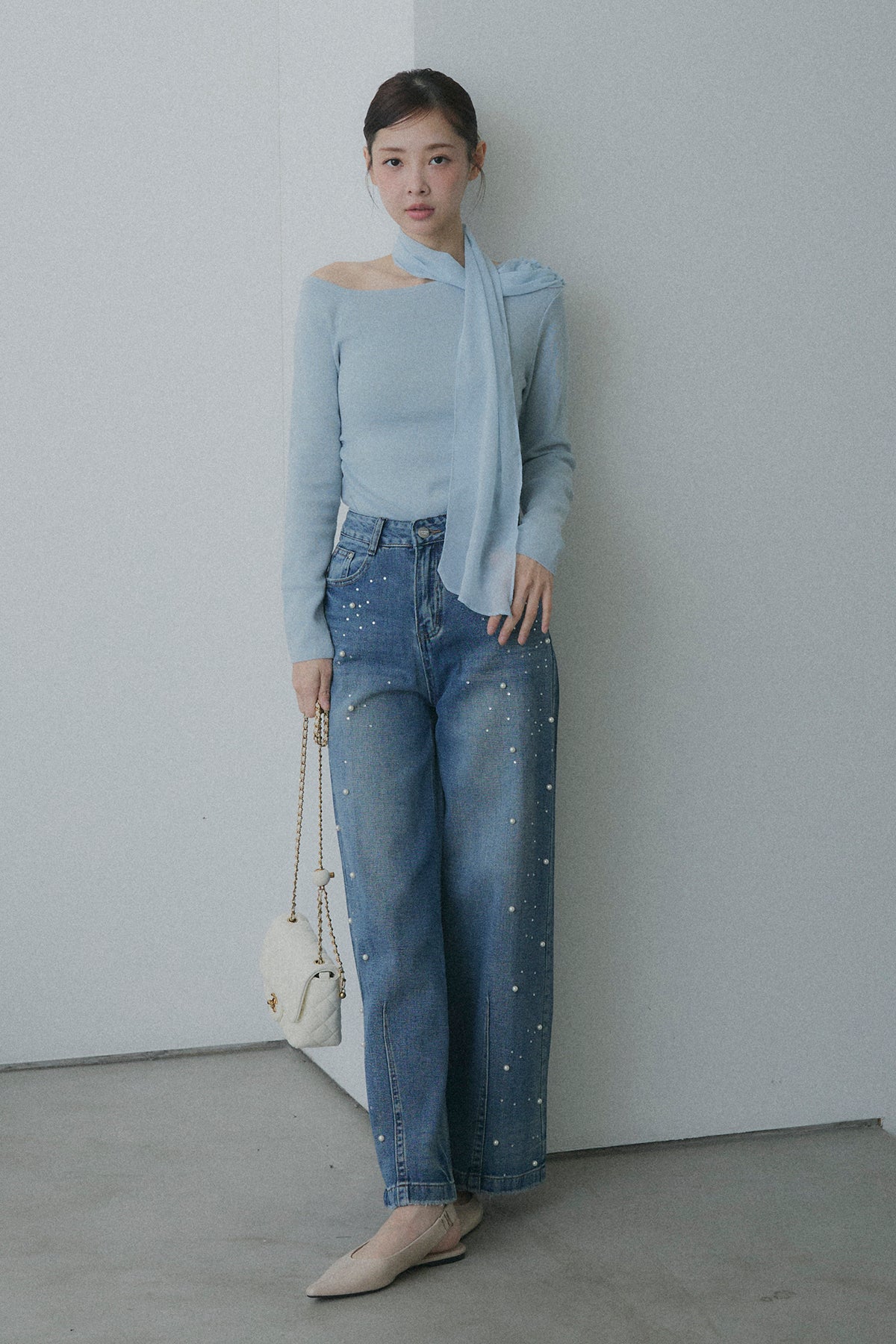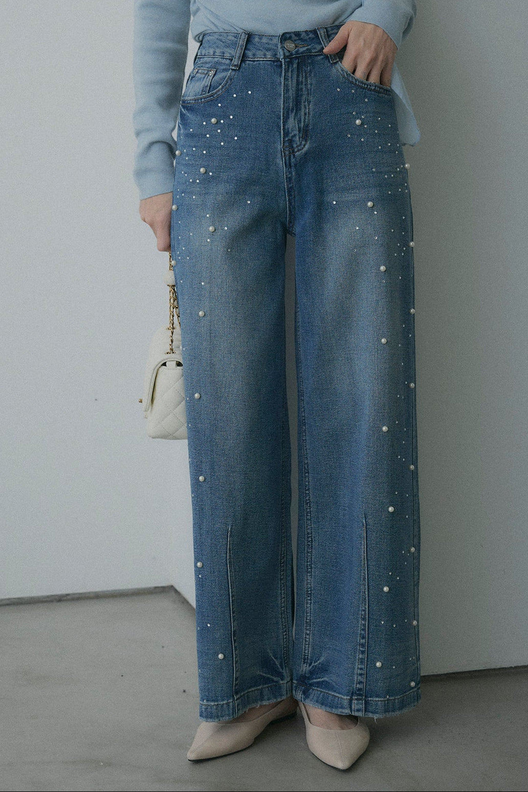 【デザイン】 繊細なパールラメがさりげなく煌めく、上品な印象のデニム。 程よく柔らかい生地感で履き心地にもこだわりながら、ストレートに落ちる美しいシルエットが脚のラインをすっきりと見せてくれます。 カジュアルなデニムに華やかさをプラスし、デイリーにも特別な日にも活躍する一枚です。
