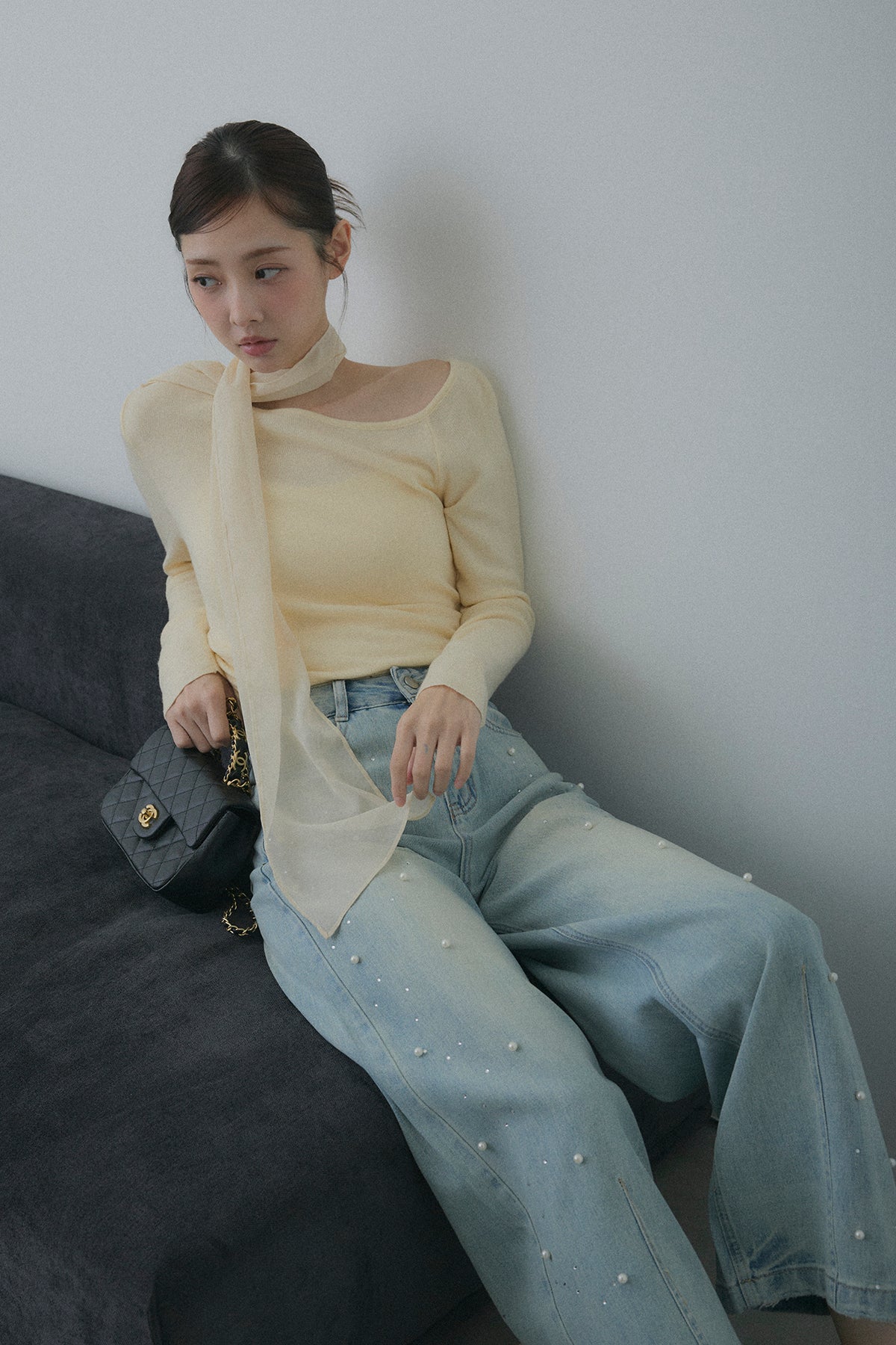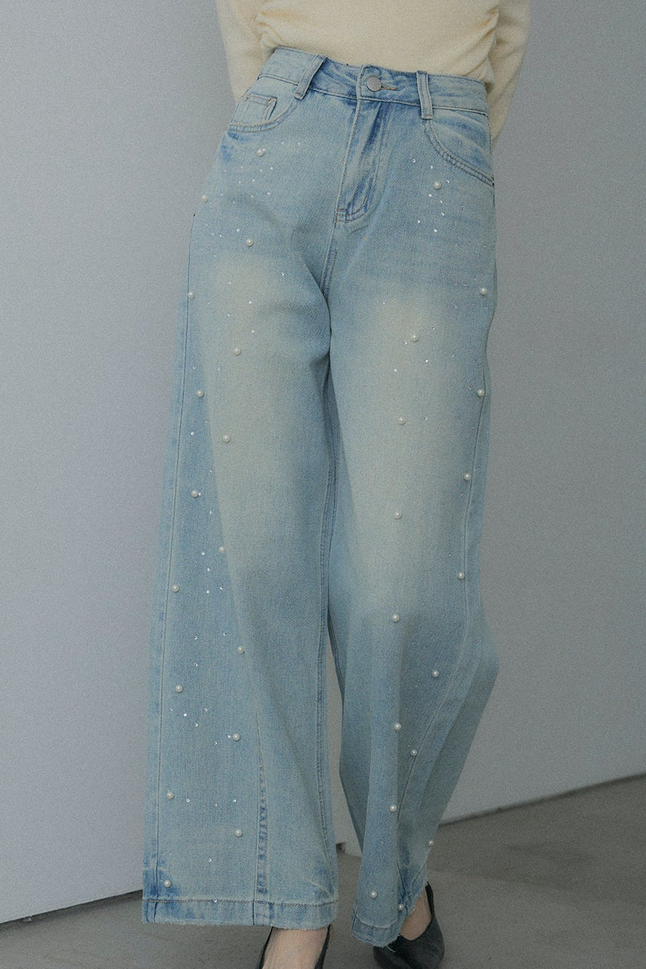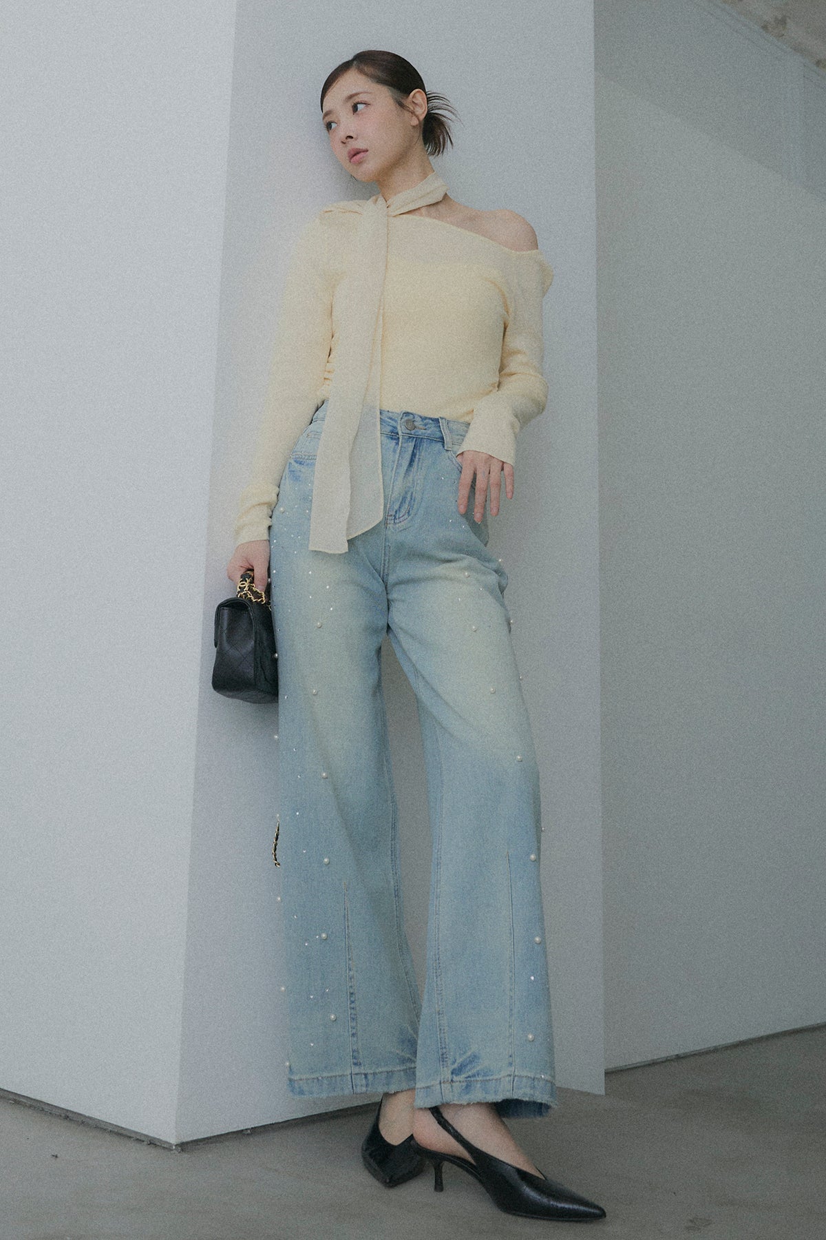 【デザイン】 繊細なパールラメがさりげなく煌めく、上品な印象のデニム。 程よく柔らかい生地感で履き心地にもこだわりながら、ストレートに落ちる美しいシルエットが脚のラインをすっきりと見せてくれます。 カジュアルなデニムに華やかさをプラスし、デイリーにも特別な日にも活躍する一枚です。
