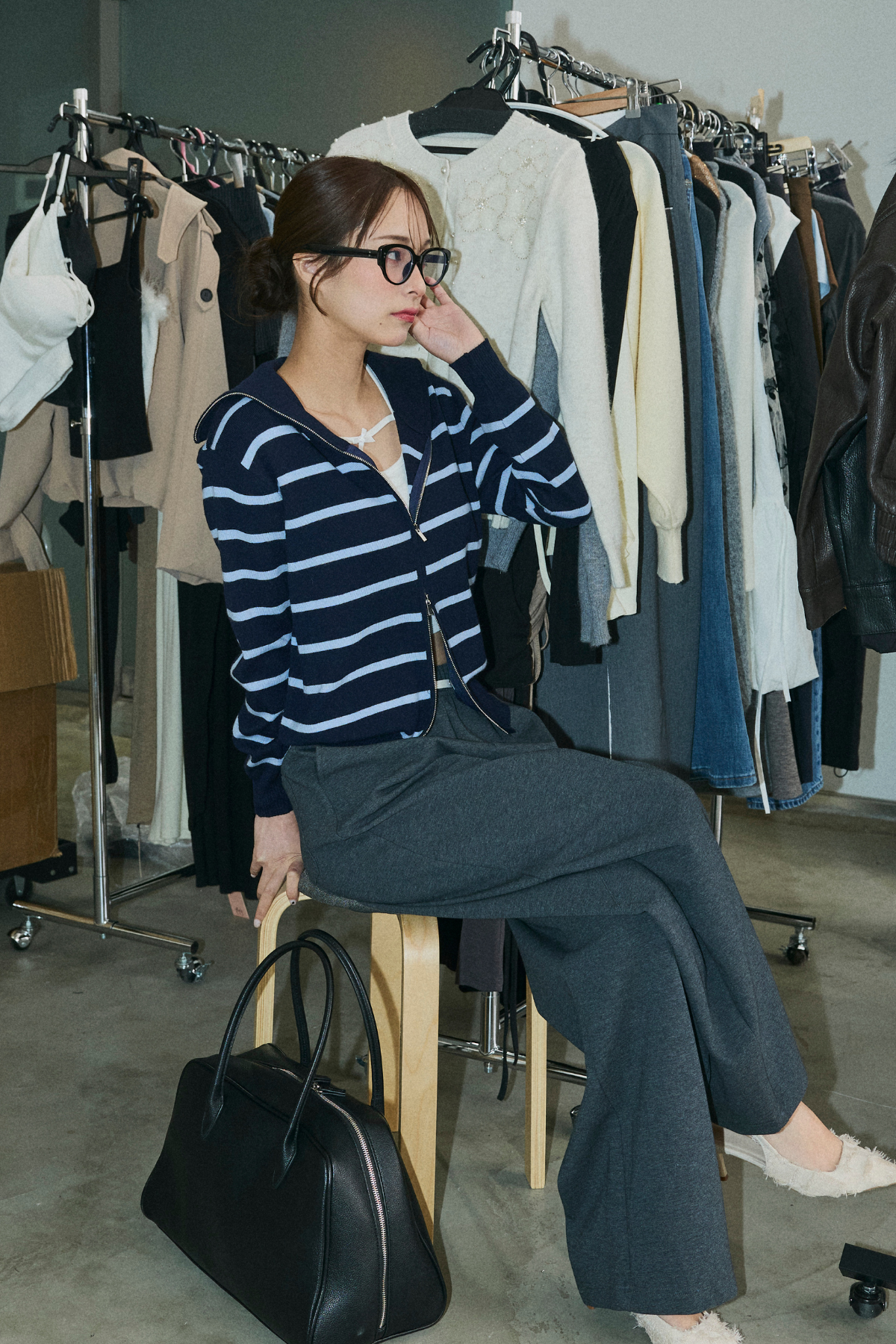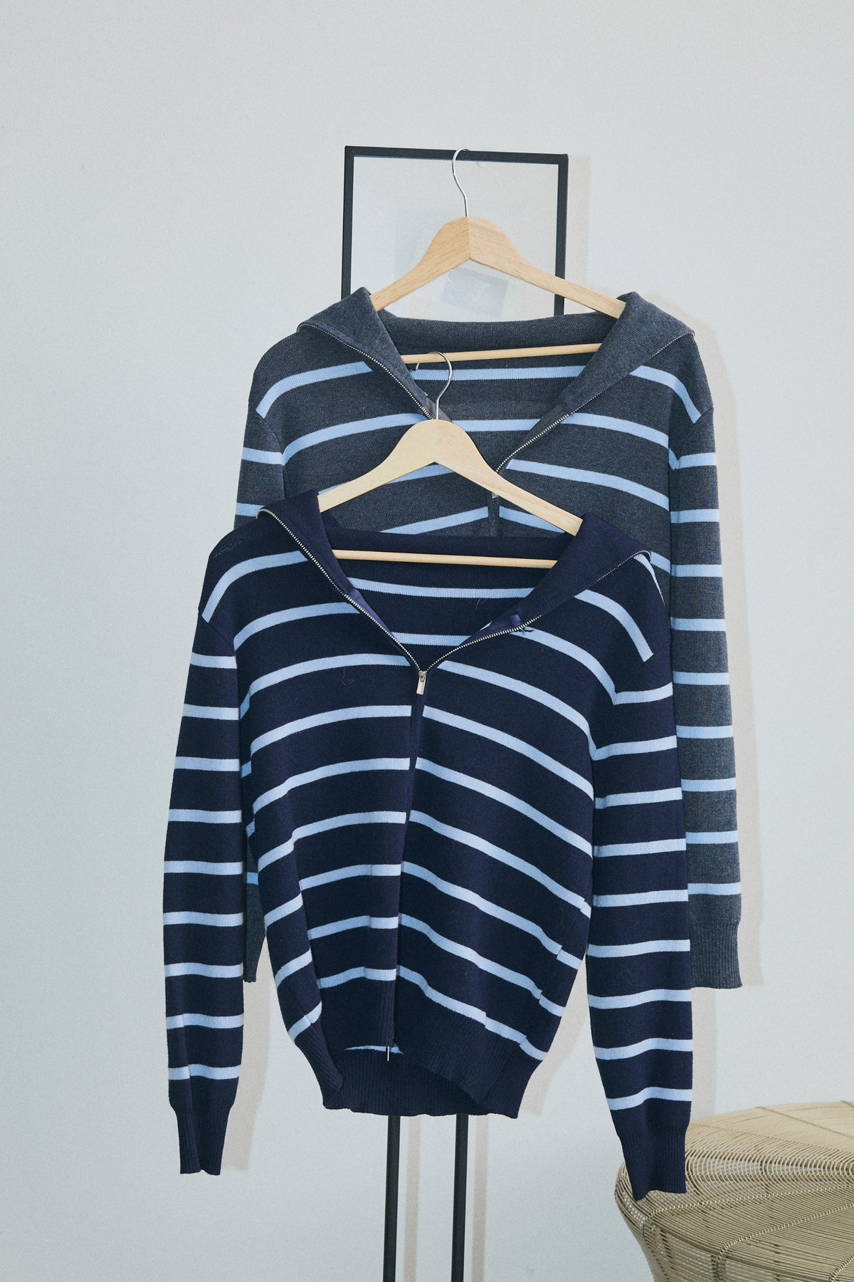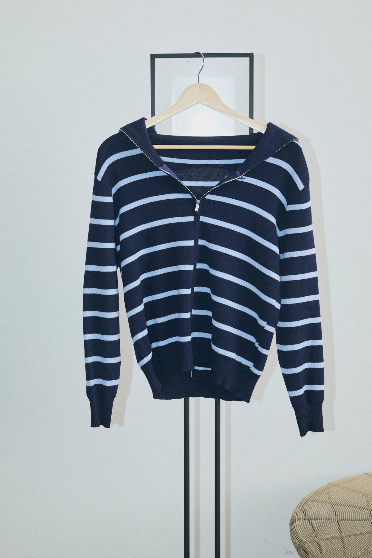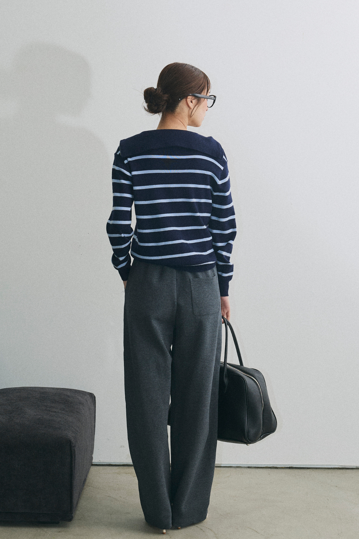 【デザイン】 洗練された印象のボーダーニットは、柔らかな落ち感が魅力です。立体的な襟元は、顔周りを華やかに演出し、袖口にはさりげないリブデザインが施されています。全体的にナチュラルな雰囲気を持ちながらも、端正さを感じさせる一枚です。ディテールにこだわった作りが、着る人の個性を引き立てます。