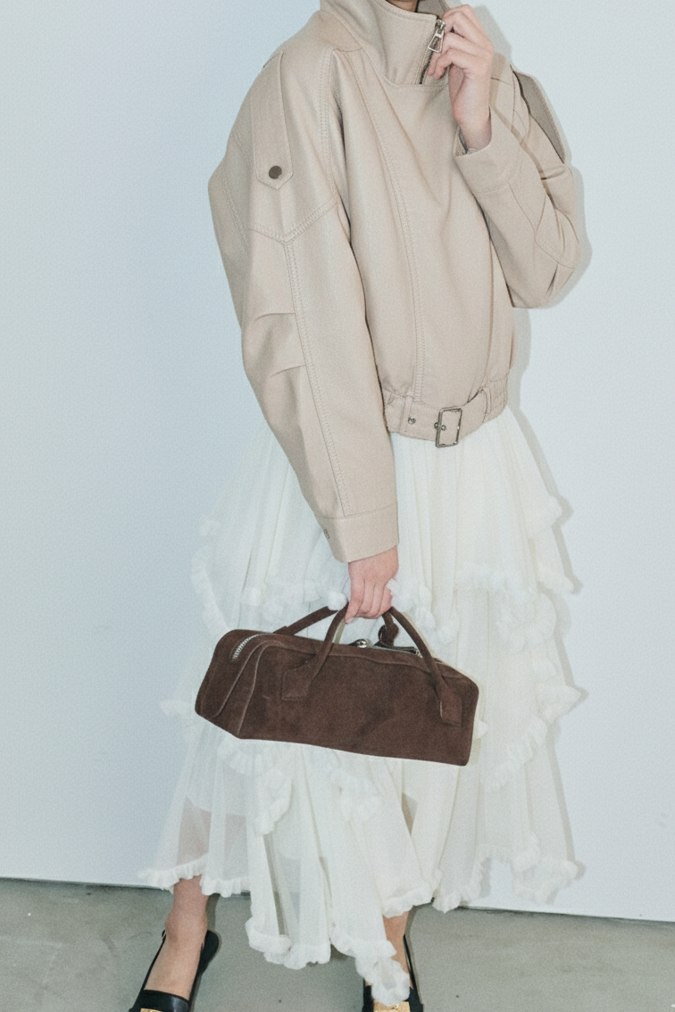 【デザイン】春先に着やすい素材の柔らかなジャケットは、光沢感が特徴。ウエストベルトが高めのウエストラインがスタイルを引き立て、動くたびに美しいラインを描きます。柔らかな素材感で、着心地も抜群です。シンプルながらも存在感のあるデザインが、さまざまなシーンで活躍します。