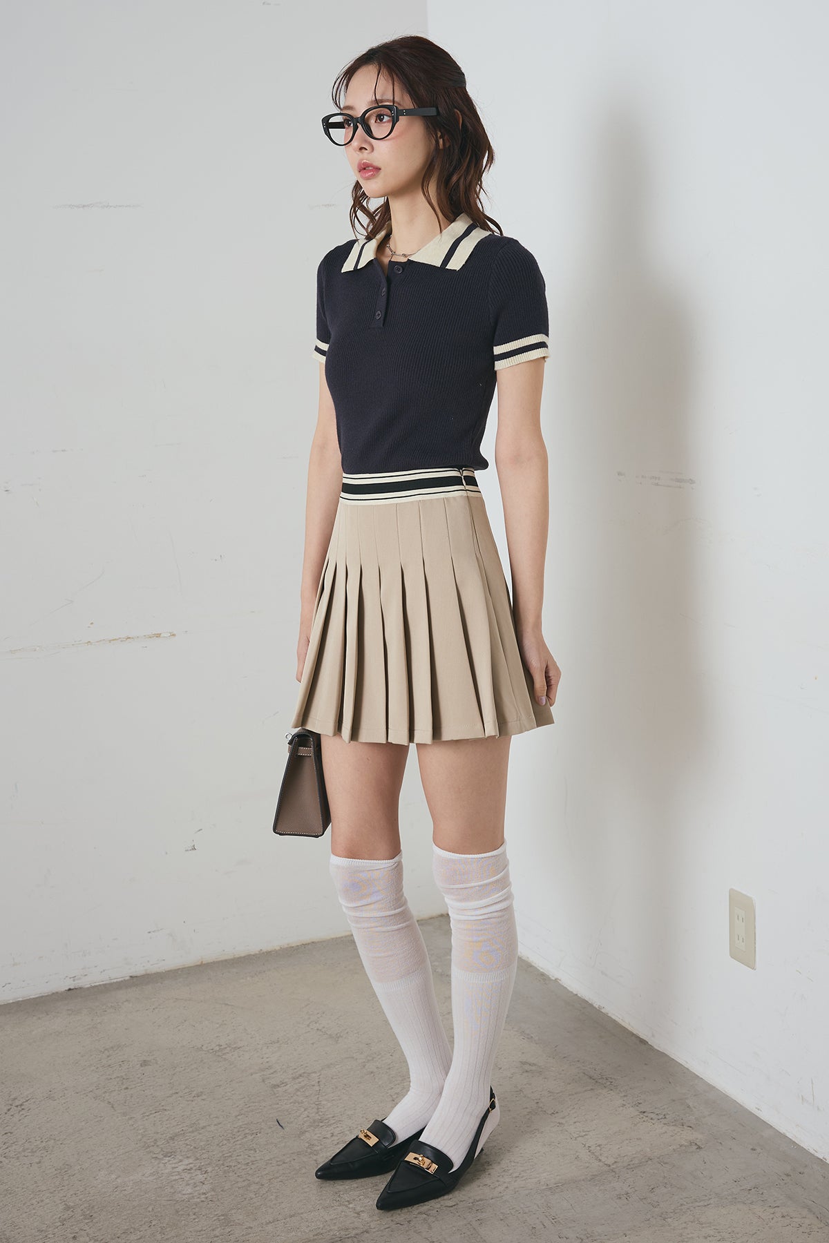 ウエスト部分にあしらわれたスポーティーな配色ラインが、コーディネートのアクセントになるプリーツミニスカート。均整の取れた端正なプリーツが裾に向かって綺麗に広がり、清潔感のあるプレッピースタイルを演出します。腰周りをスッキリと見せるデザインで、シンプルながらもトレンド感をしっかり押さえた一着に仕上げました。