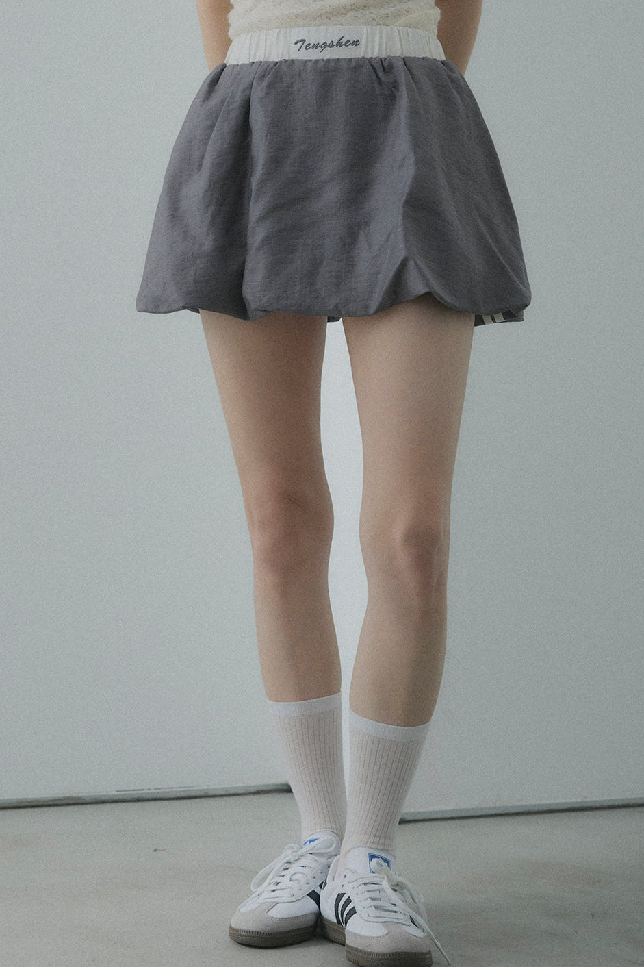 【デザイン】華奢見えするドロップショルダーのジャケットと、脚をすっきり見せてくれるバルーン風ショーツの黄金バランス。