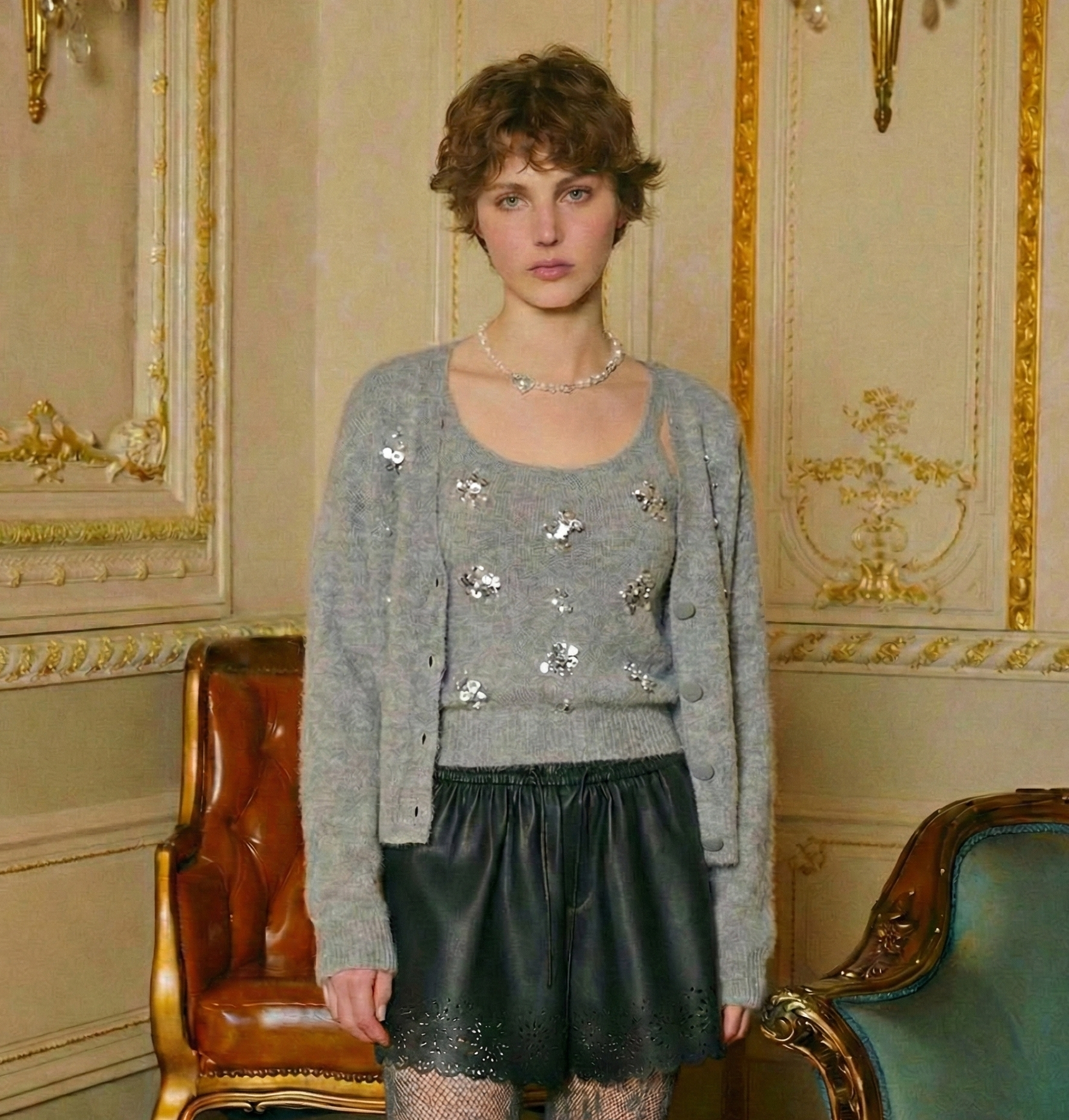 カーディガンはシンプルなクルーネックで、袖口にもビジューがあしらわれ、統一感のあるデザインに。