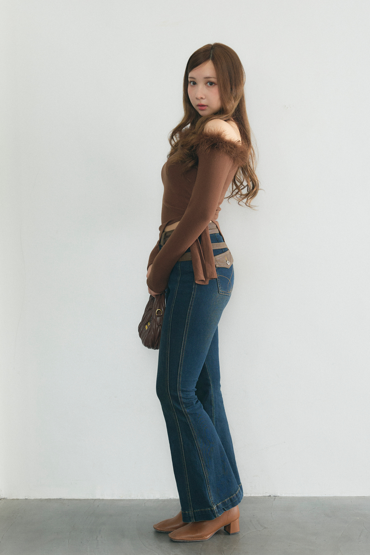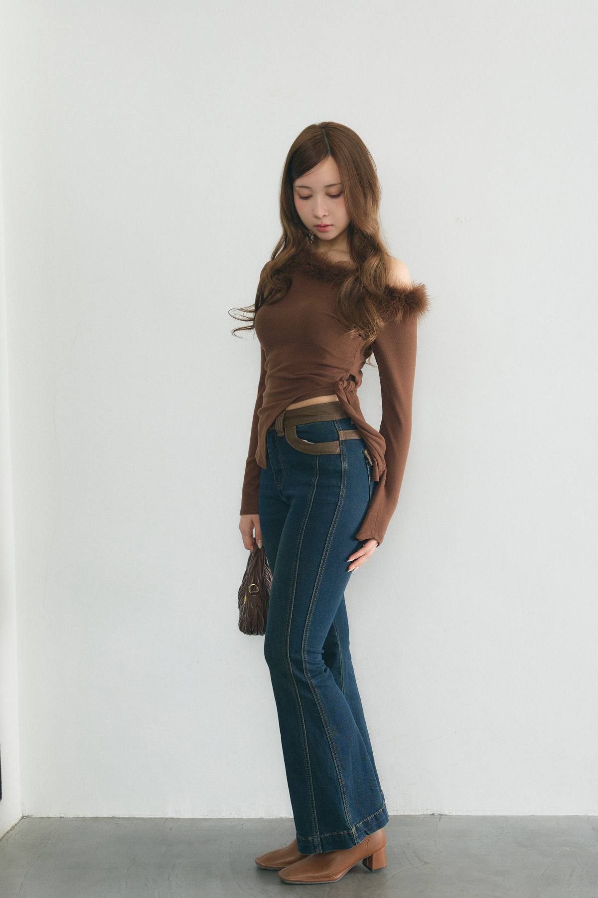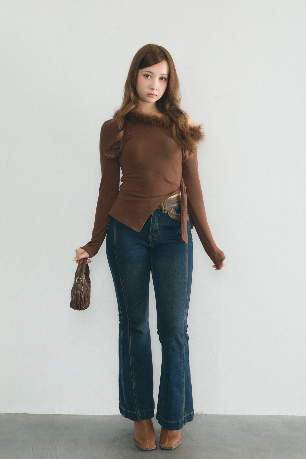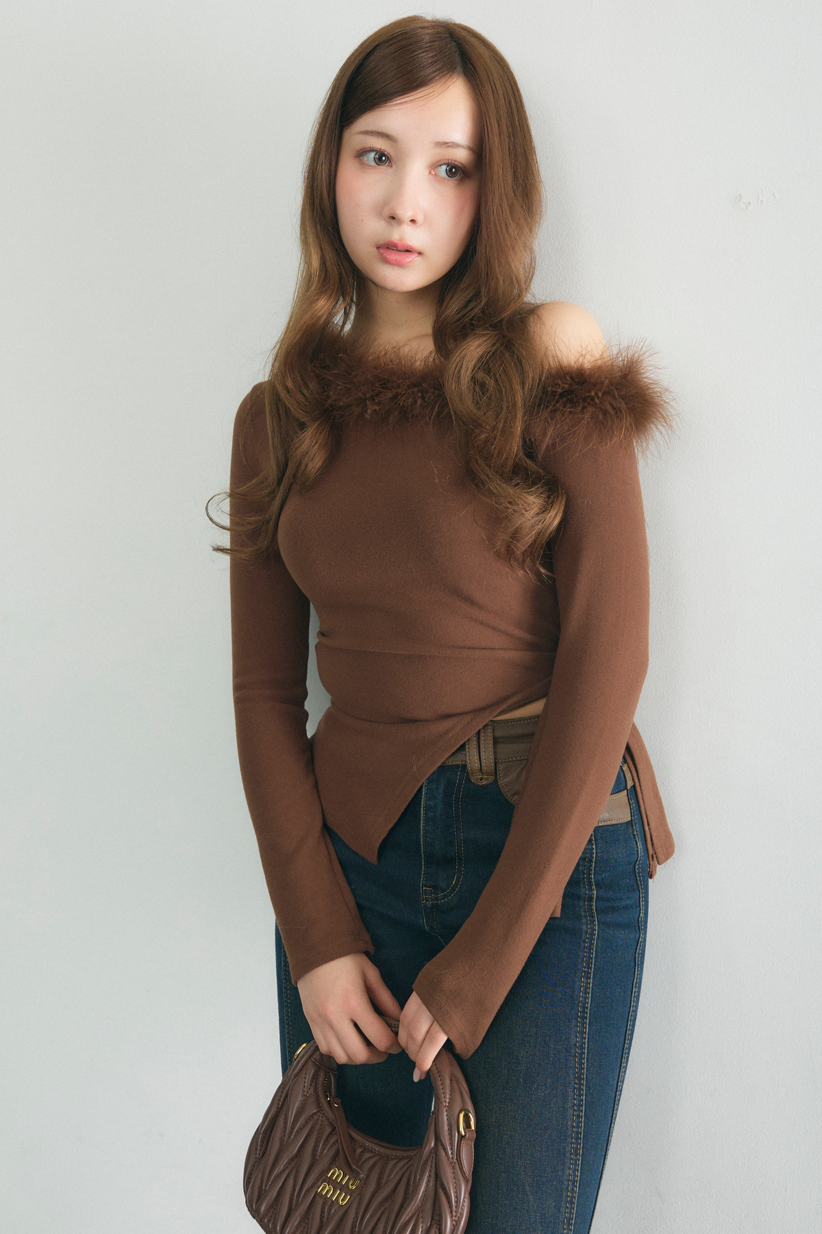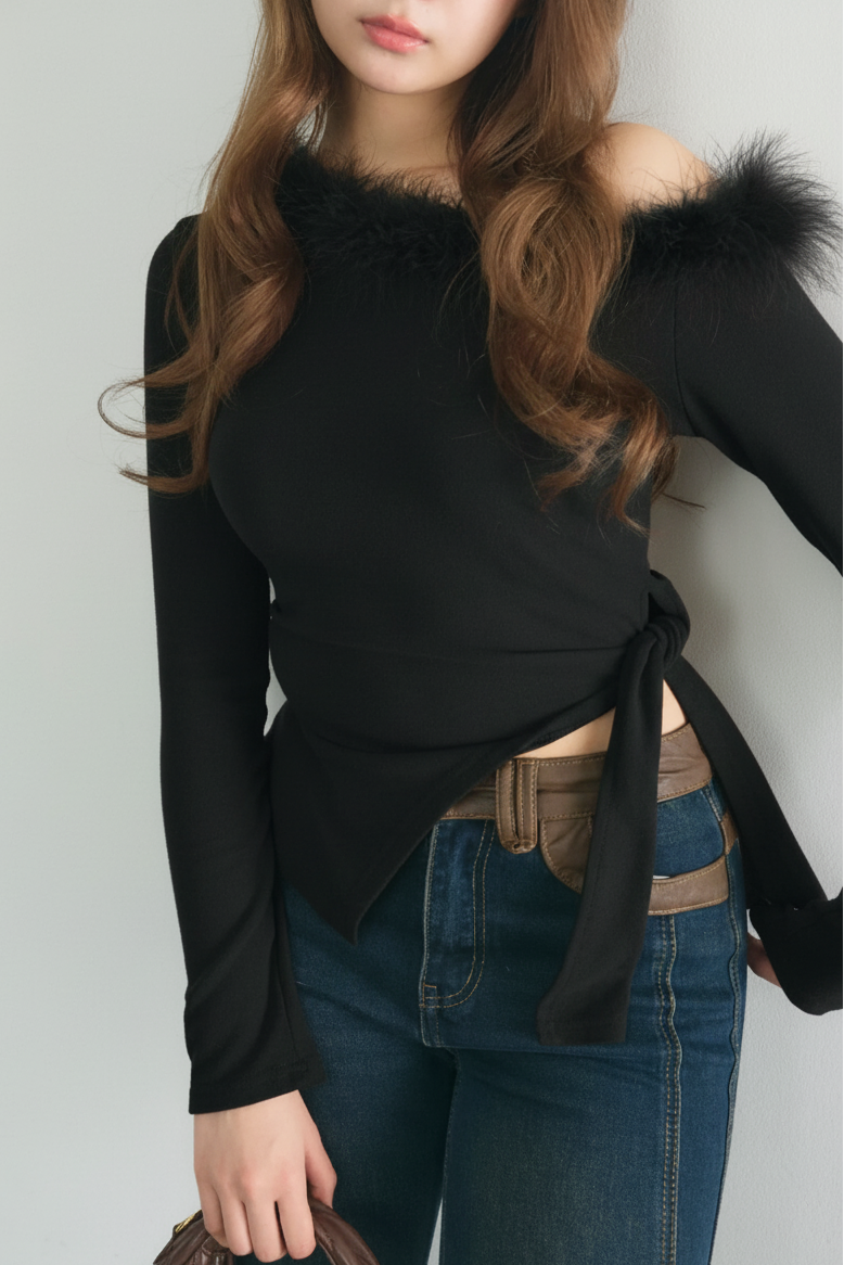 【デザイン】 一際目を引くデザインは、アシンメトリーなシルエットが特徴です。片側に施されたファーが、柔らかな印象を与えつつ、エレガントな雰囲気を演出します。袖口はさりげなく広がり、動くたびに軽やかさを感じさせます。また、ディテールにこだわった仕上げが、全体に洗練された表情を加えています。シンプルながらも、存在感のあるアイテムです。