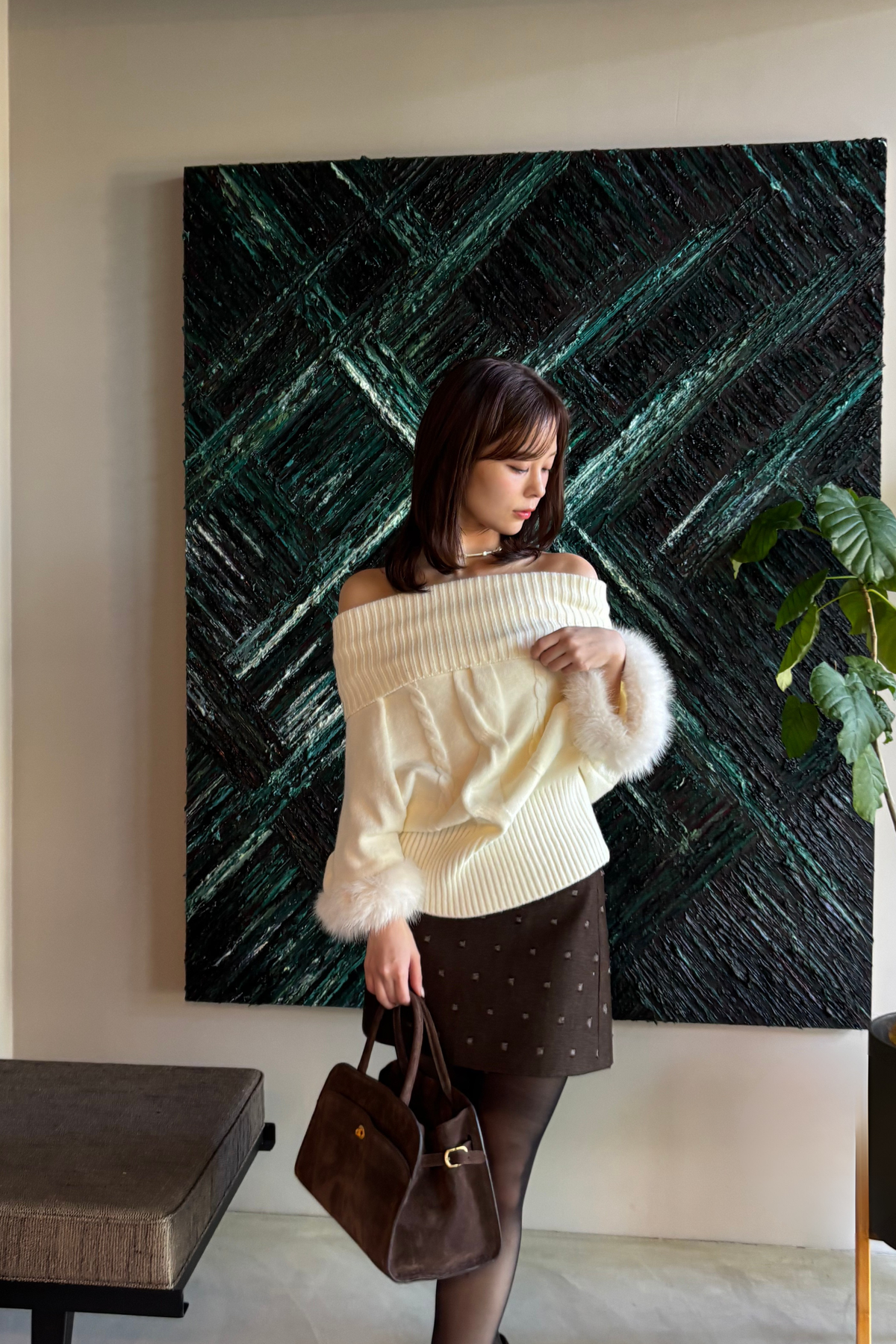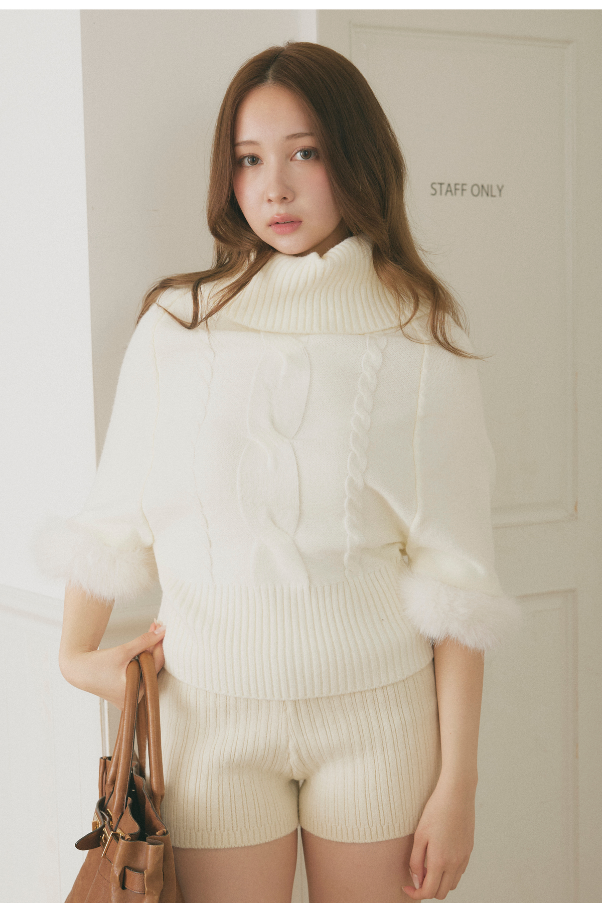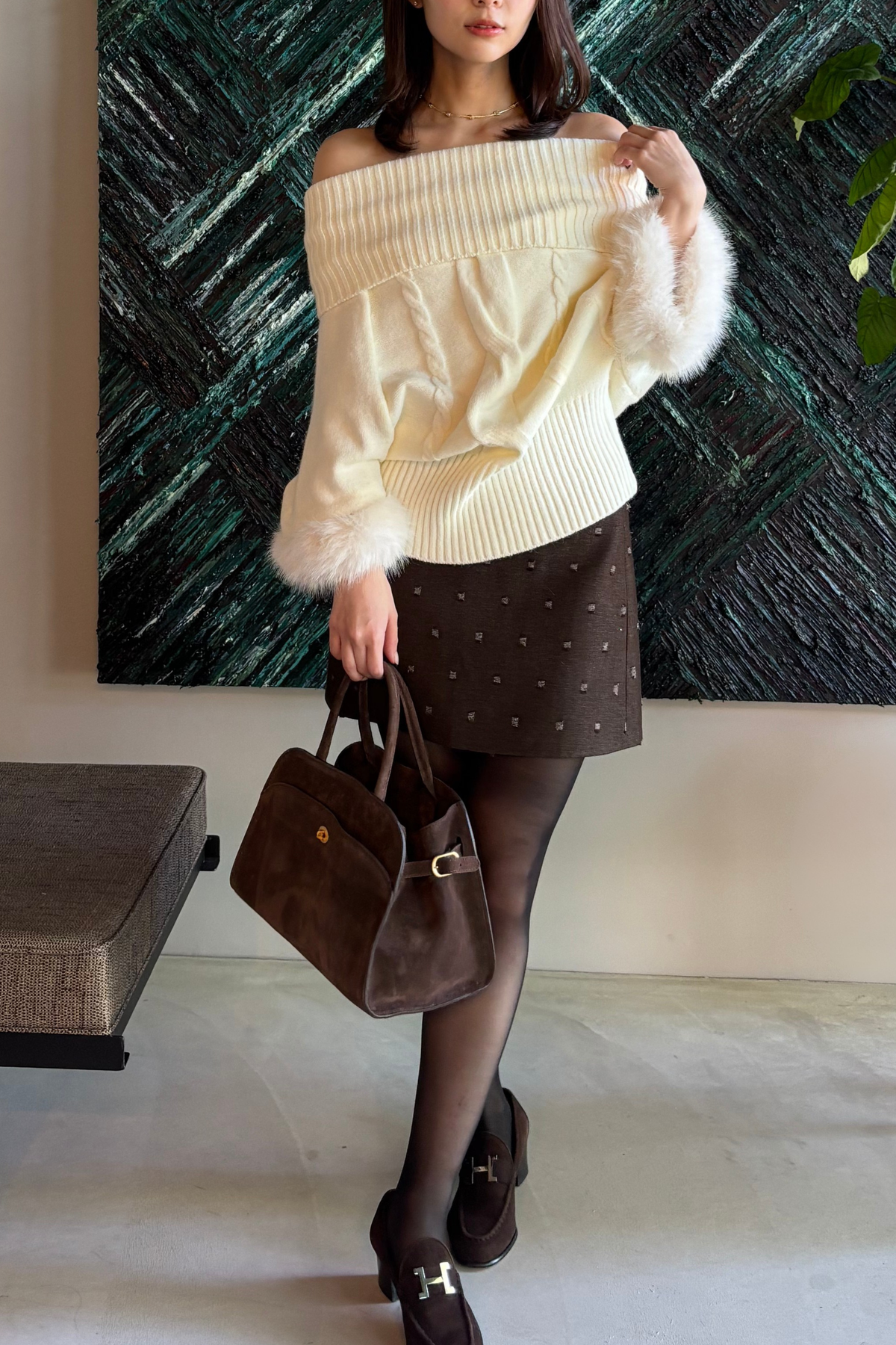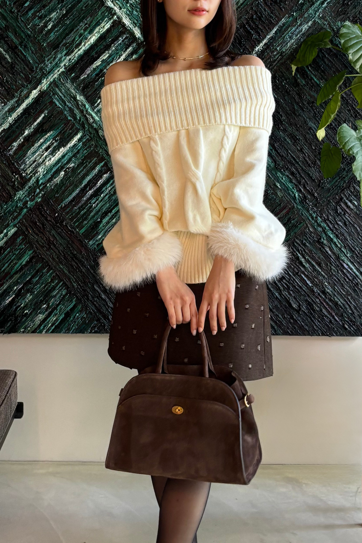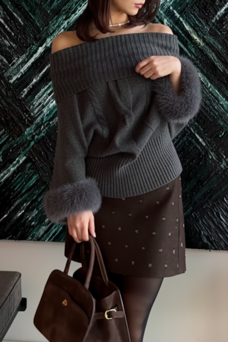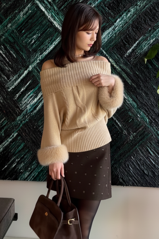 【デザイン】 柔らかな表情が魅力のニットは、ゆったりとしたシルエットが心地よい着心地を提供します。ボリューム感のある袖口には、ふんわりとしたファーが施され、華やかさをプラス。首元のデザインは、リラックスした印象を与える一方で、上品さも兼ね備えています。全体として、クラシカルな雰囲気を持ちながらも、現代的なエッセンスが感じられる一枚です。