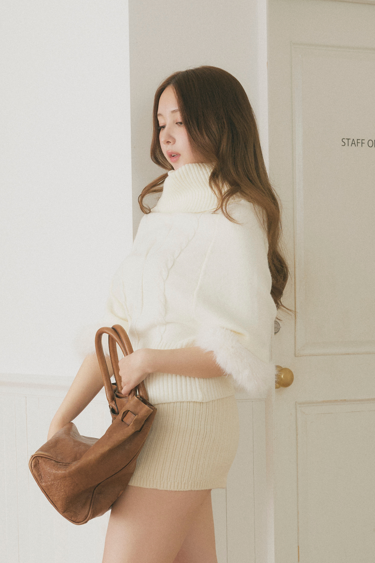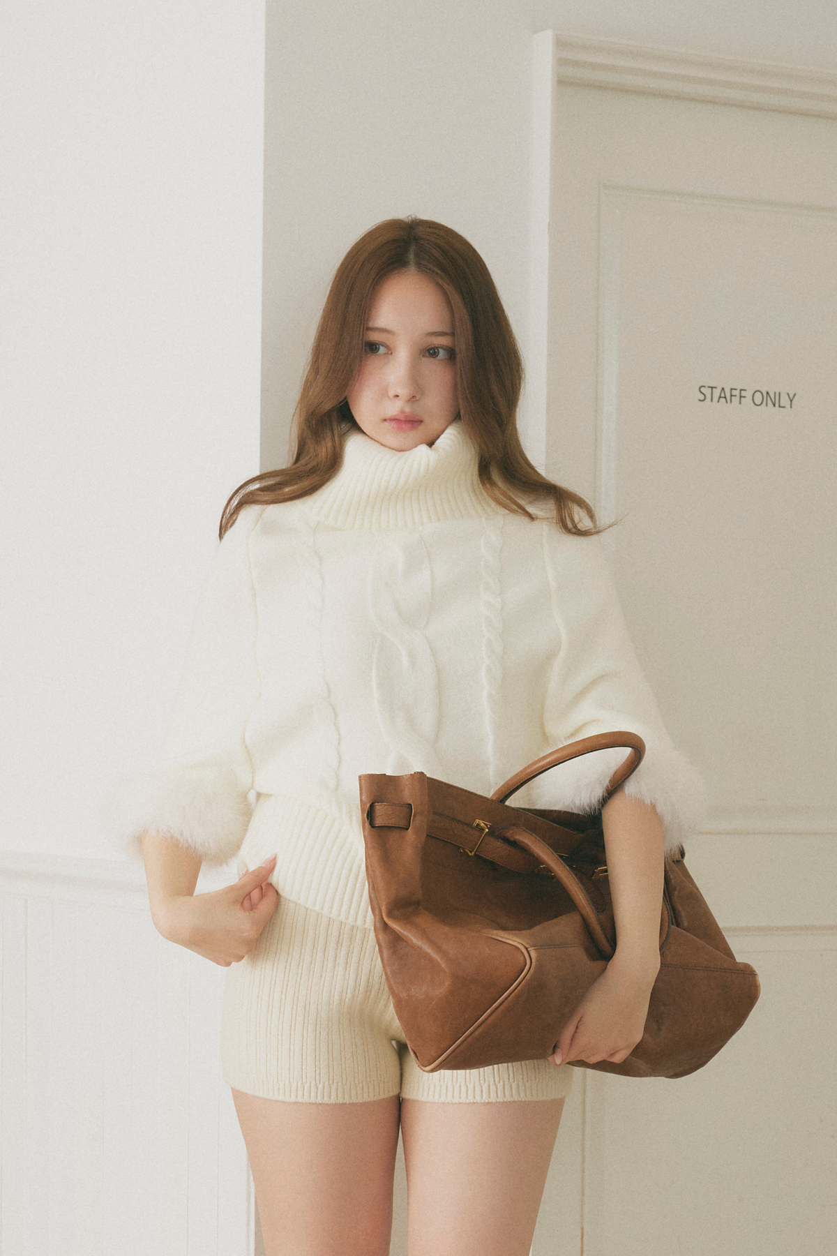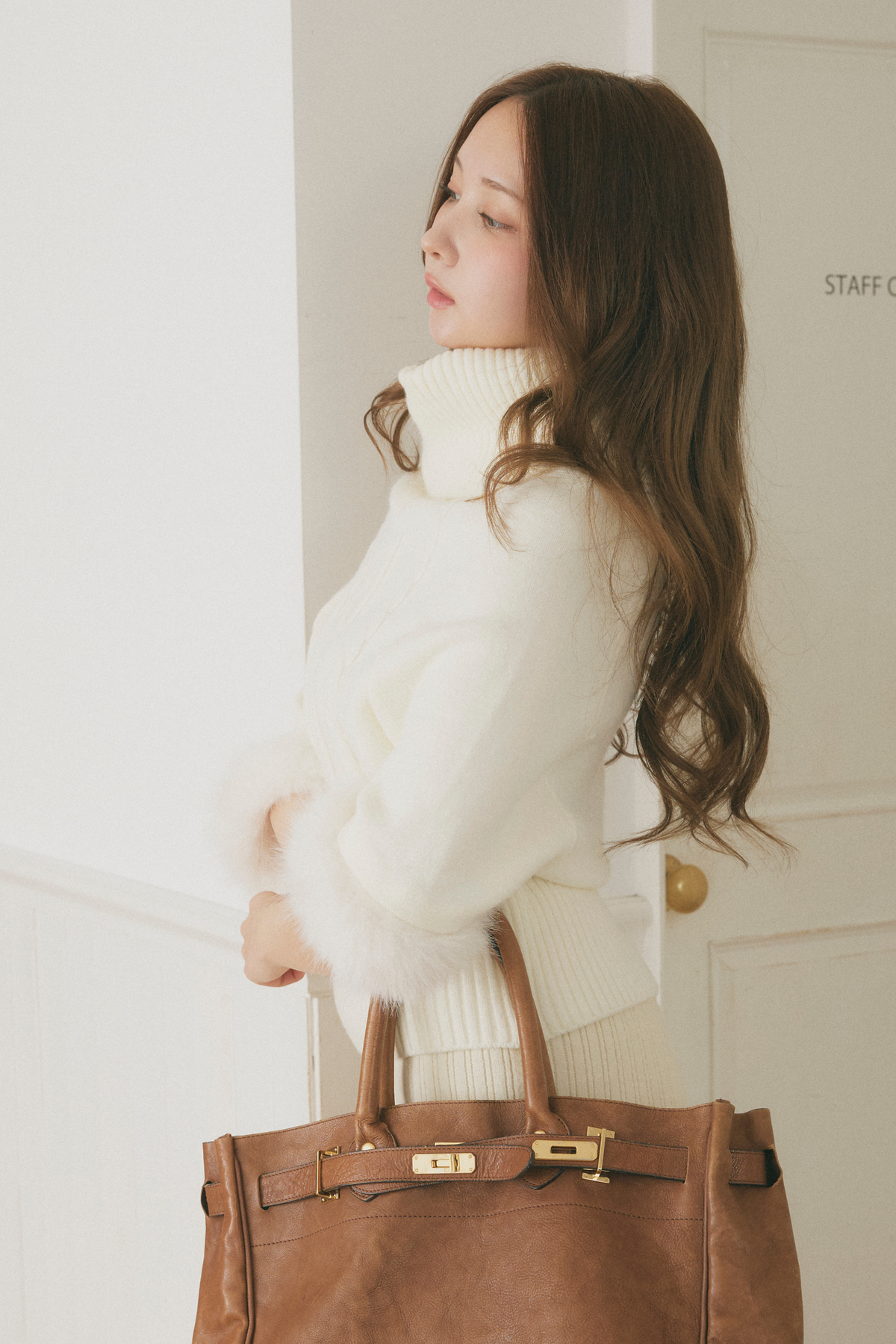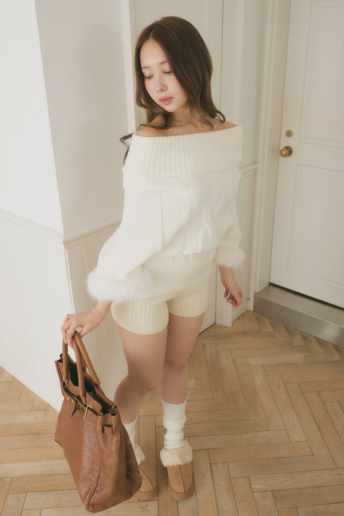 【デザイン】 柔らかな表情が魅力のニットは、ゆったりとしたシルエットが心地よい着心地を提供します。ボリューム感のある袖口には、ふんわりとしたファーが施され、華やかさをプラス。首元のデザインは、リラックスした印象を与える一方で、上品さも兼ね備えています。全体として、クラシカルな雰囲気を持ちながらも、現代的なエッセンスが感じられる一枚です。